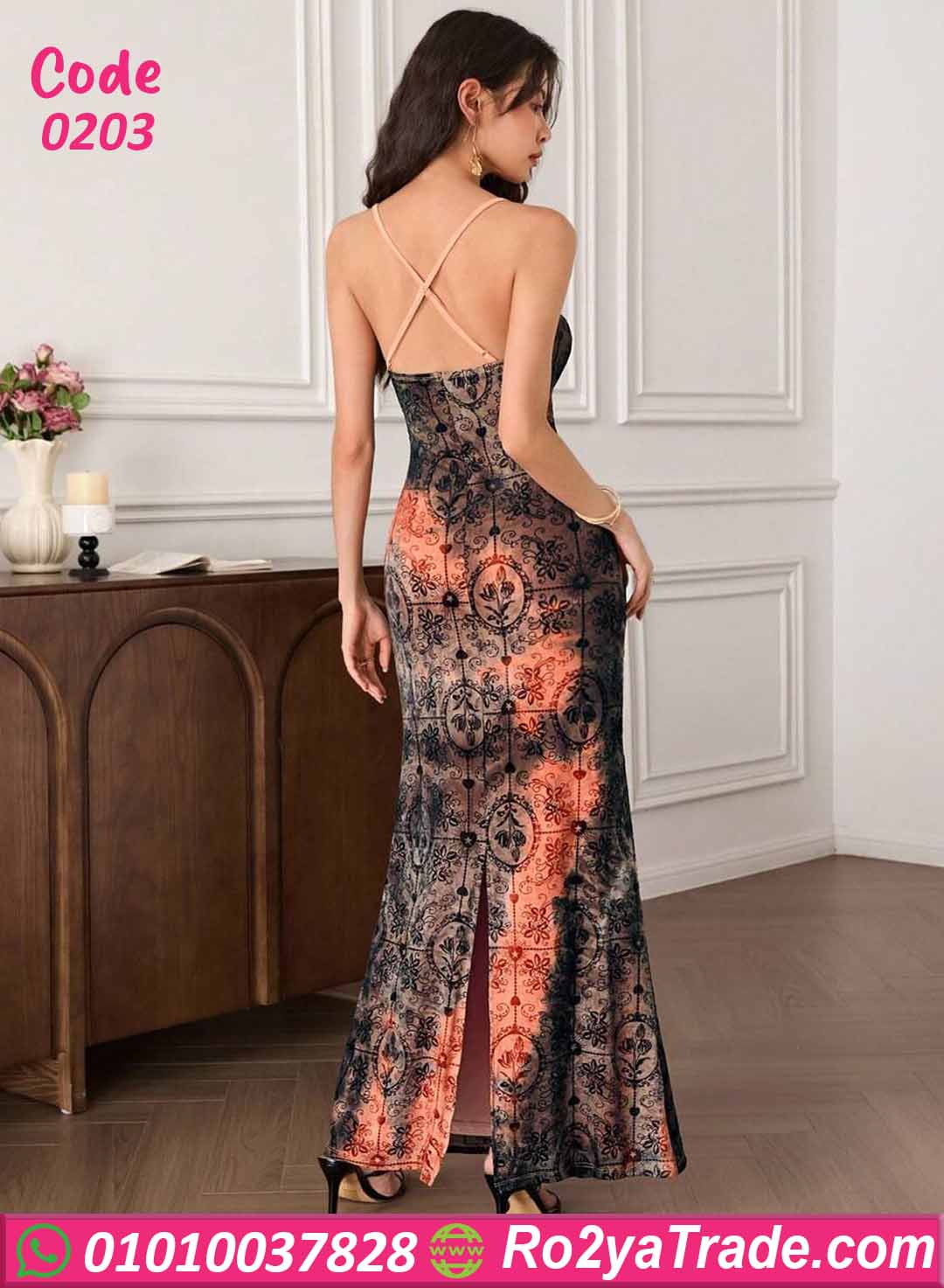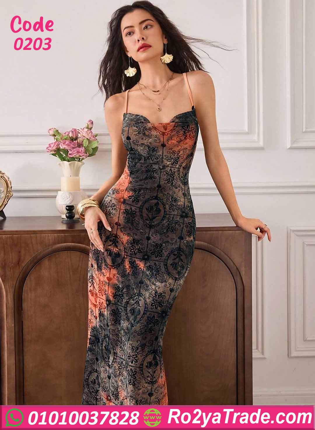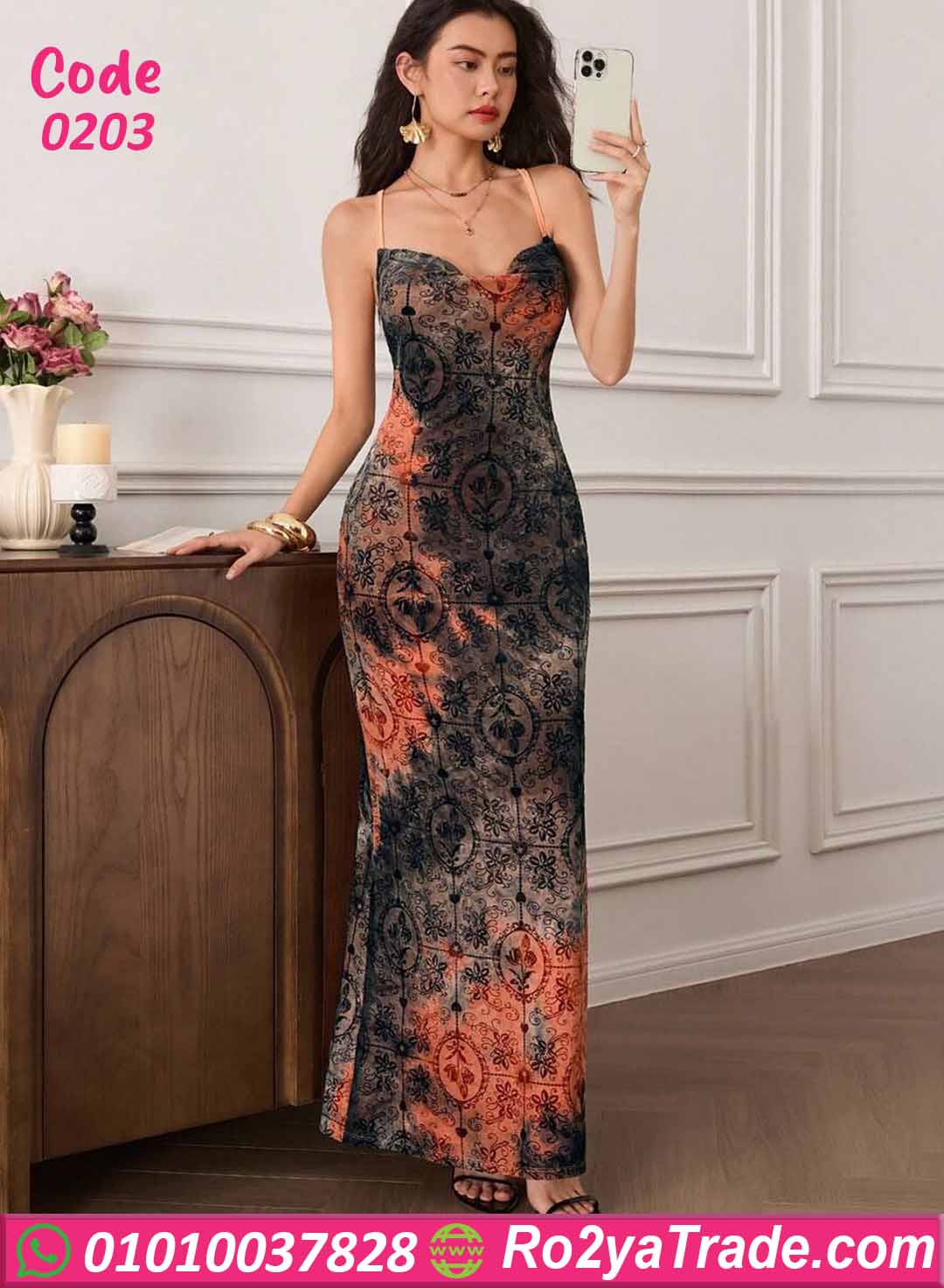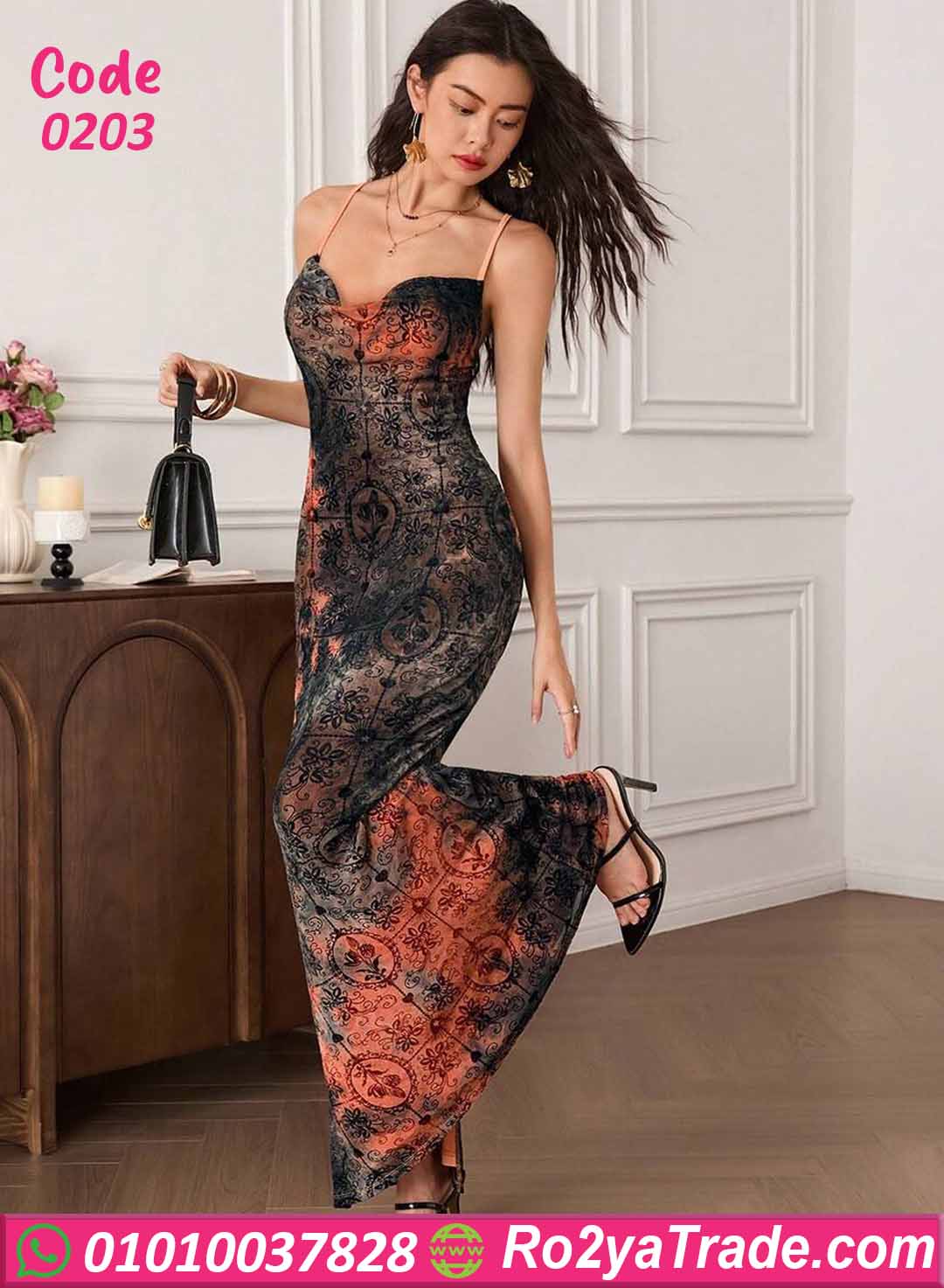 دريس صيفي طويل بتصميم ضيق أنيق مع حمالات رفيعة ونقشة جذابة يمنحك إطلالة أنثوية مميزة تناسب الخروجات والسهرات.