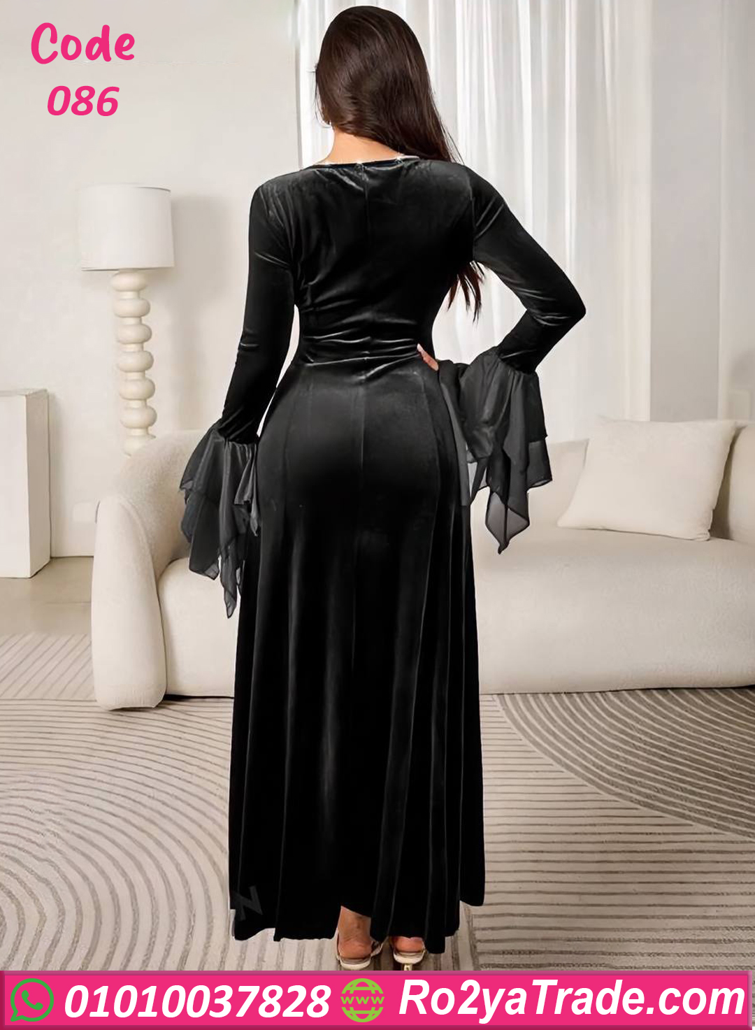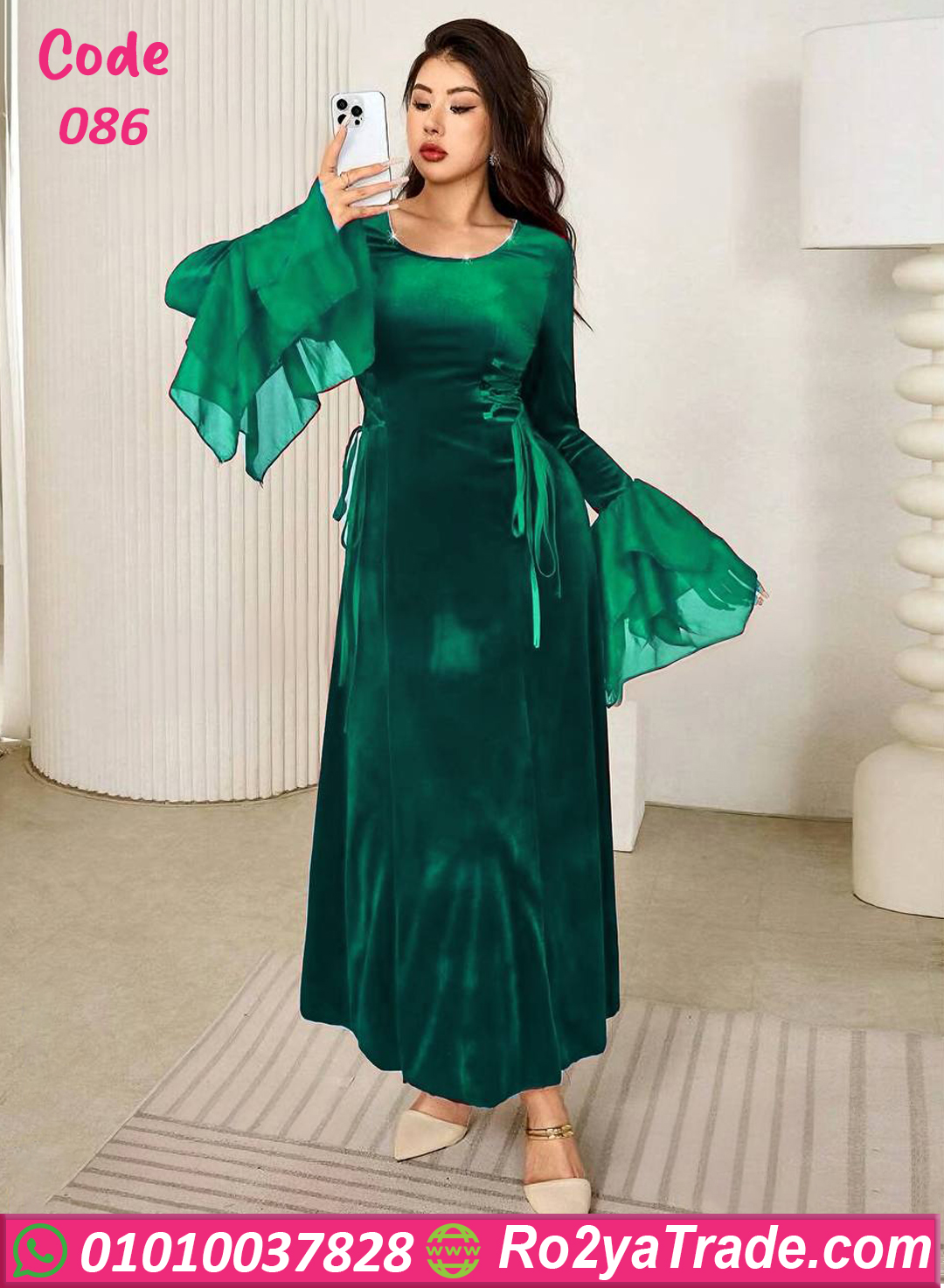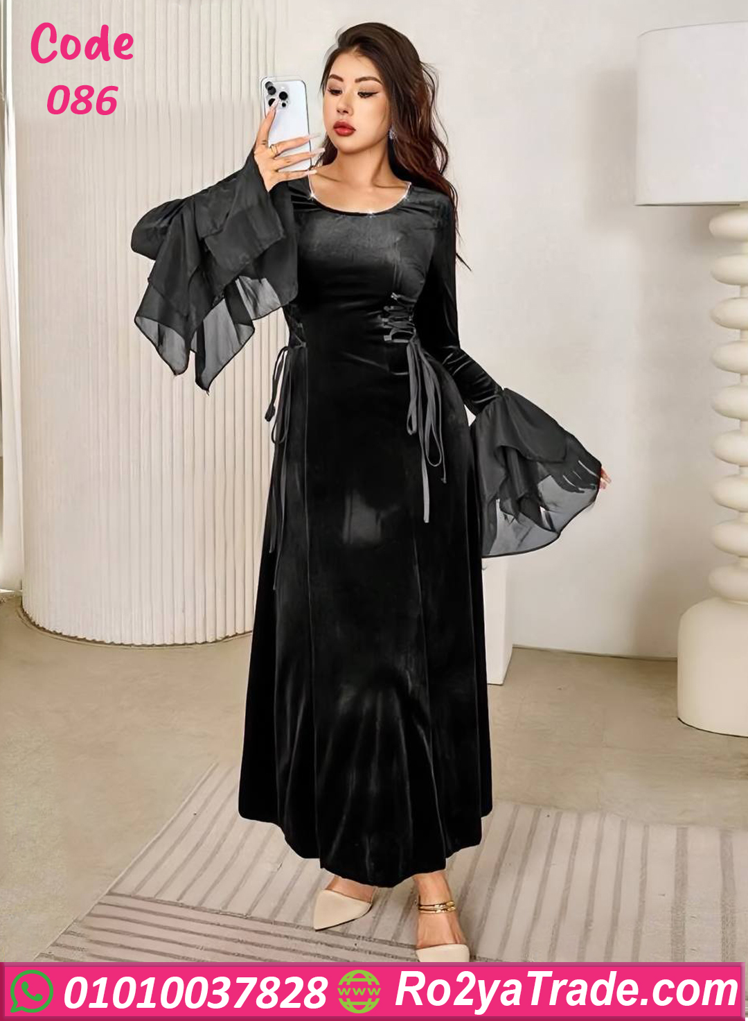 دريس قطيفة شتوي ناعم وأنيق يناسب السهرات والجلسات المسائية، تصميمه انسيابي بكم منفوش وقصة رقيقة على الوسط بتدي شكل ممشوق وجذاب