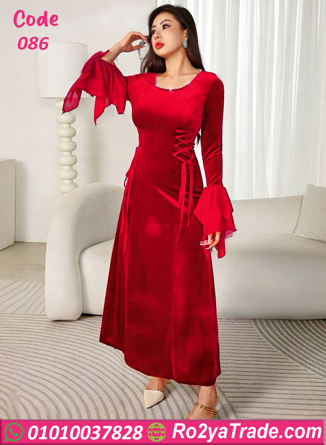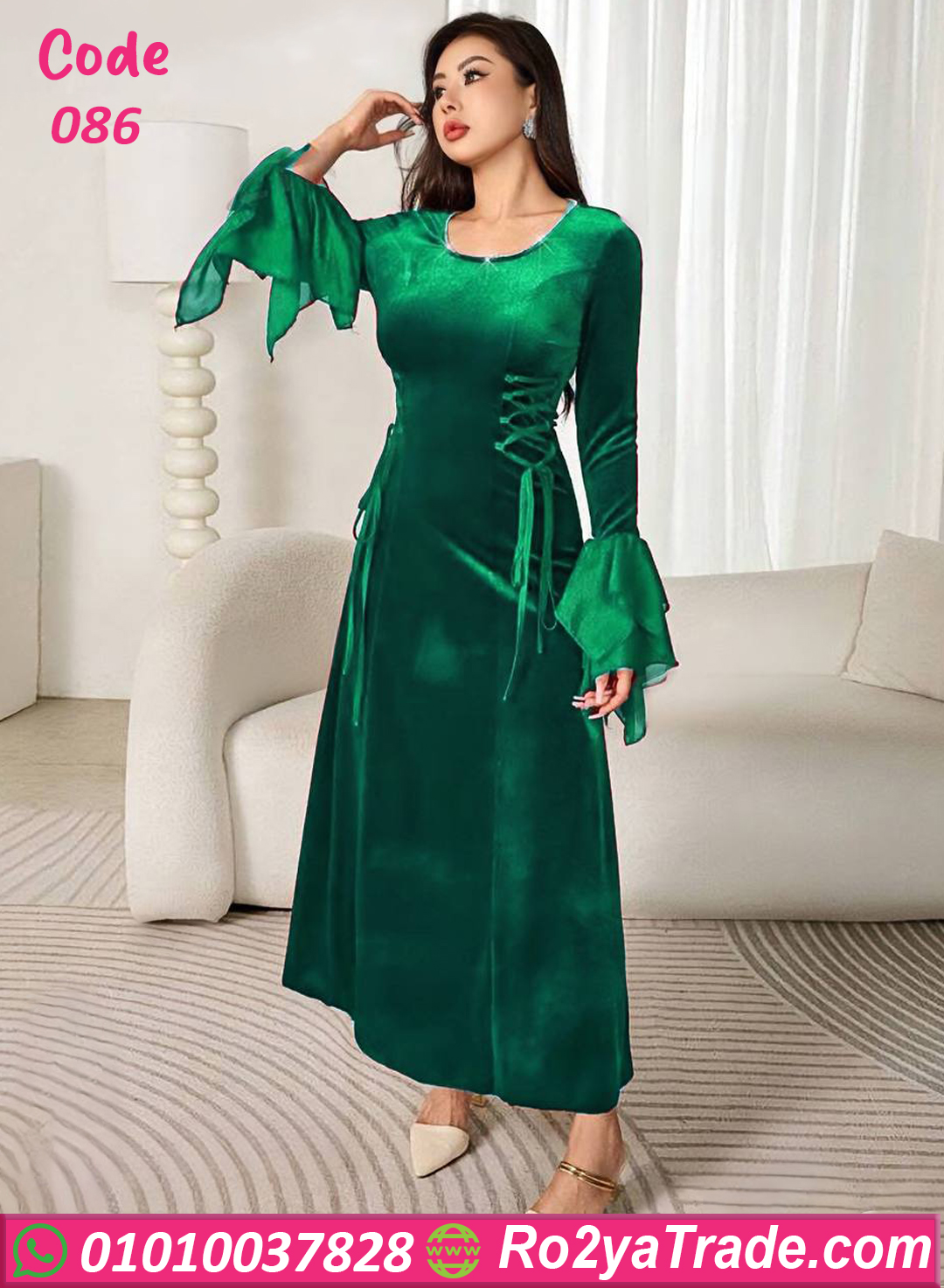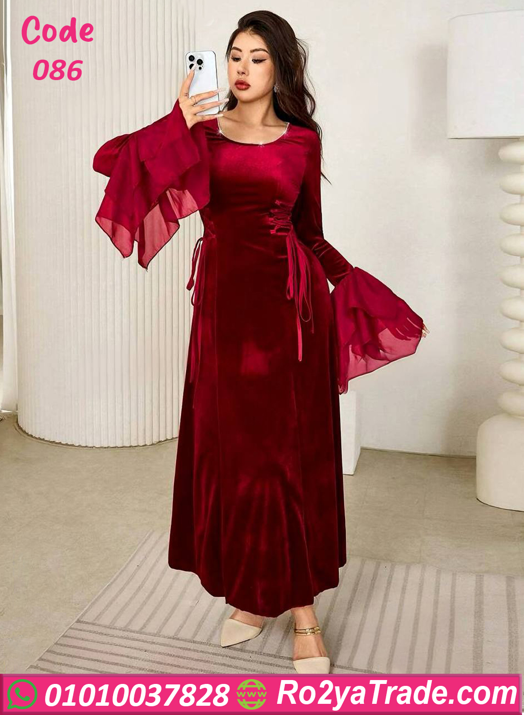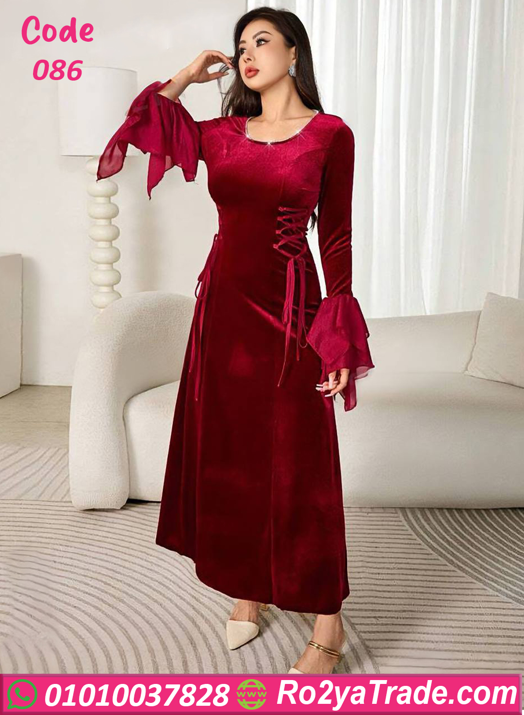 دريس قطيفة شتوي ناعم وأنيق بكم منفوش ورباط جانبي بيحدد الخصر ويبرز القوام