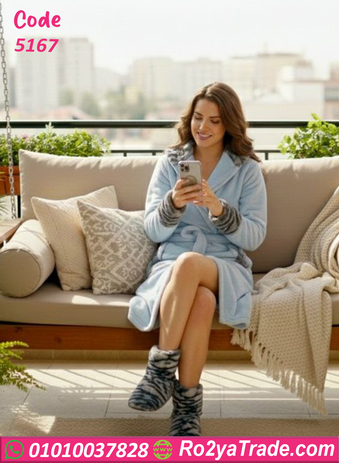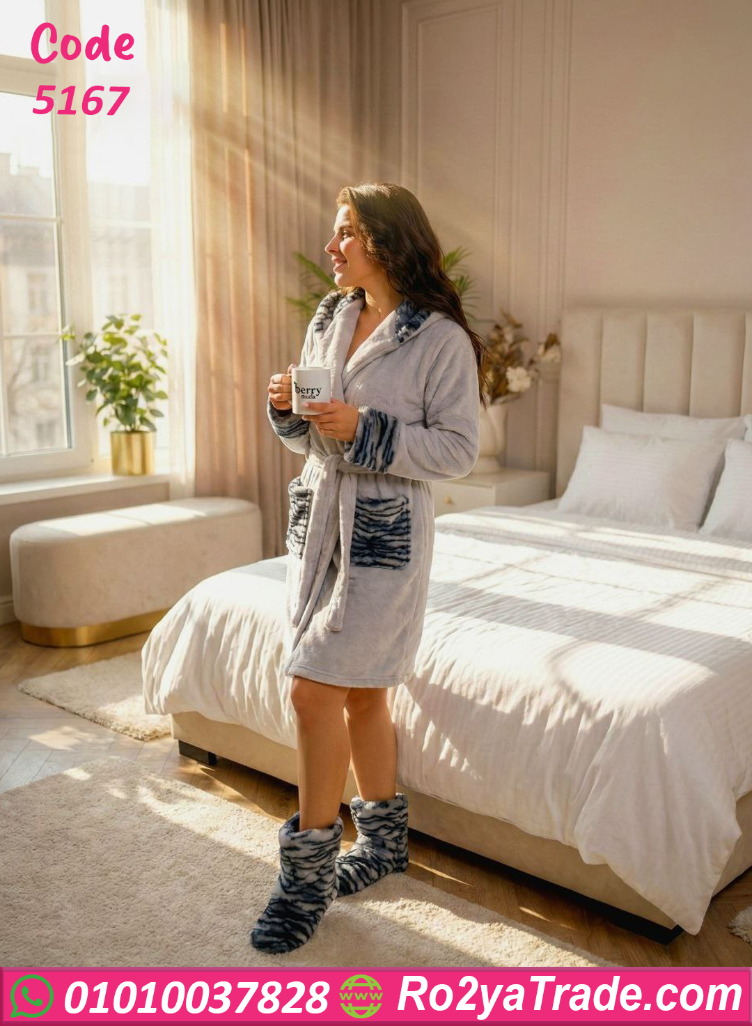 روب نسائي شتوي بخامة تقيلة وناعمة بتدي إحساس عالي بالدفا والراحة. التصميم عملي ومريح، بطول قصير مناسب للحركة اليومية، مع حزام يبرز شكل الجسم بطريقة شيك. تفاصيل الفرو بتضيف لمسة فخامة وأناقة، والروب مناسب للاستخدام اليومي في البيت، الصبح أو بالليل. تشطيب ممتاز وخامة ثابتة مع الاستخدام والغسيل.