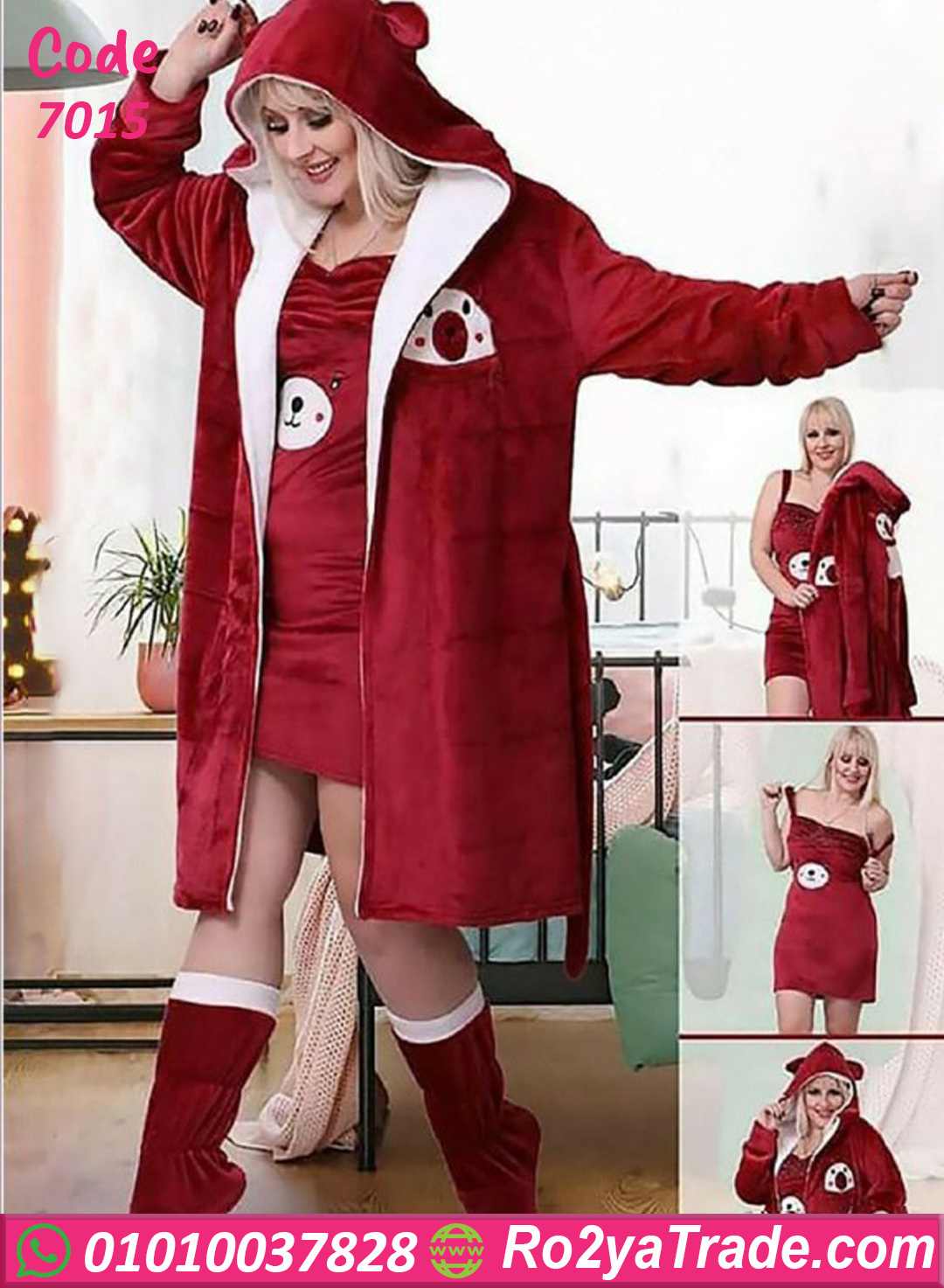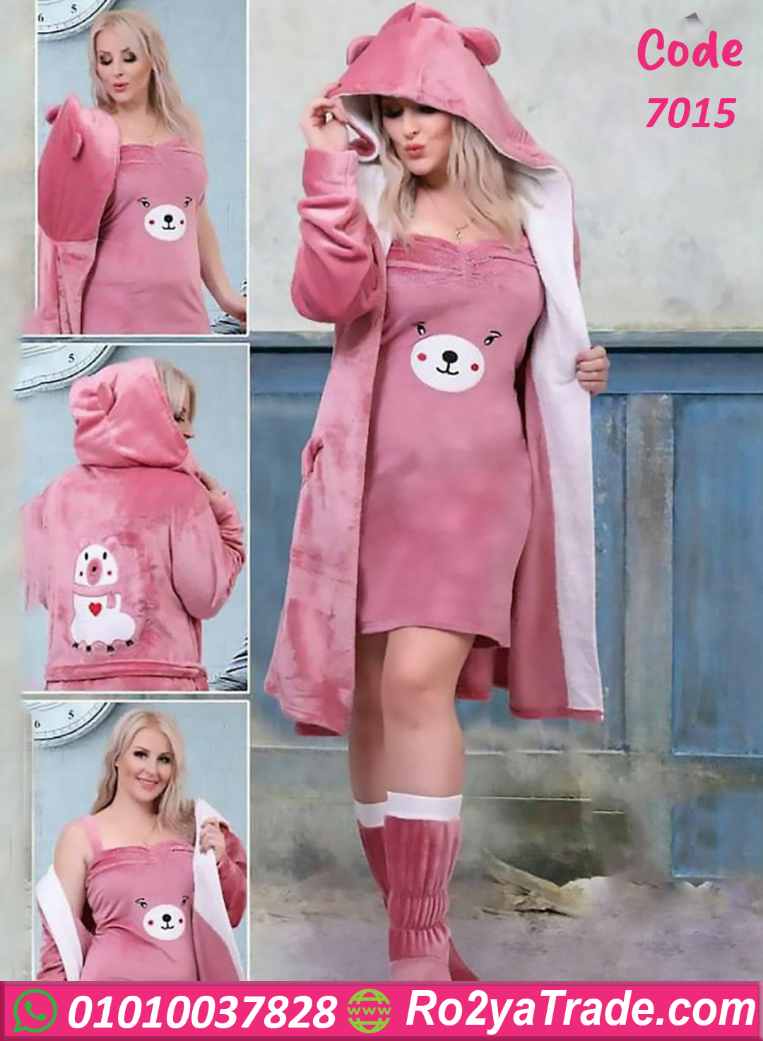 الخامة فرو سوفت ناعمة جدًا على الجسم، والروب مزوّد بكابيشو ودب لذيذ في التصميم، ومعاه فستان داخلي قصير بنفس اللون والخامة.