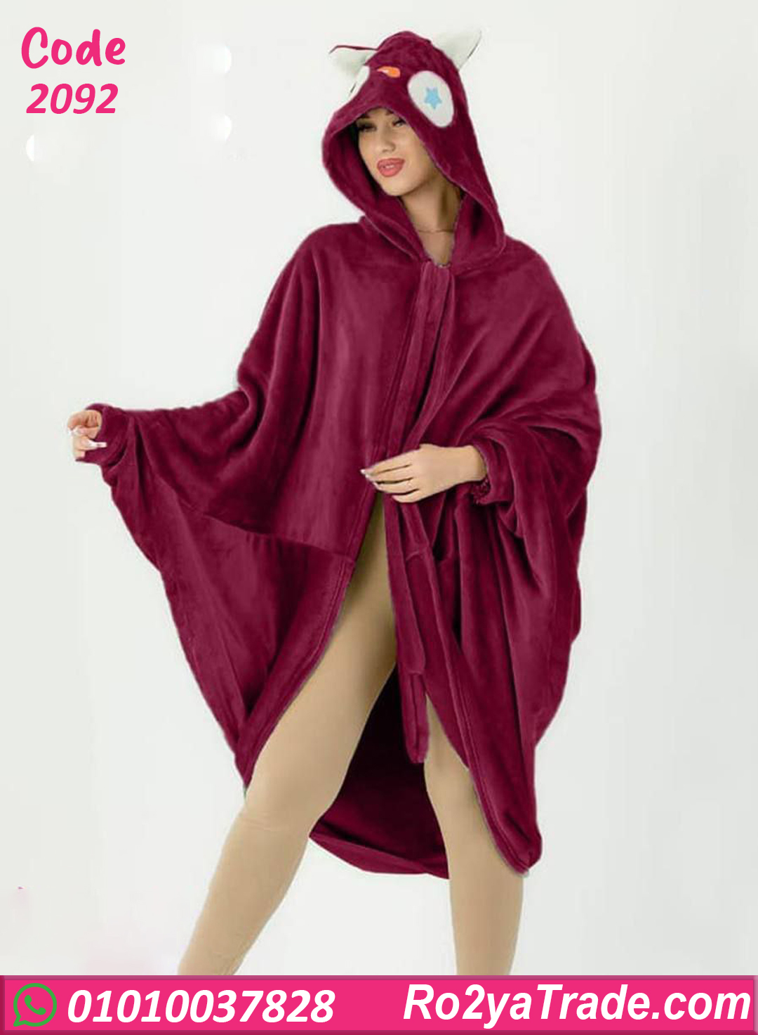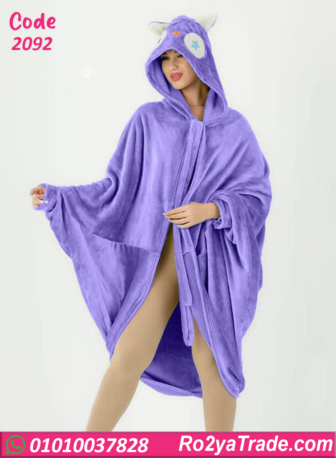 روب شتوي نسائي قصير بتصميم واسع ومريح مع كابيشو، خامة قطيفة ناعمة على الجسم وبتدي إحساس عالي بالدفا، سهل اللبس ومثالي بعد الشاور أو في قعدة البيت.