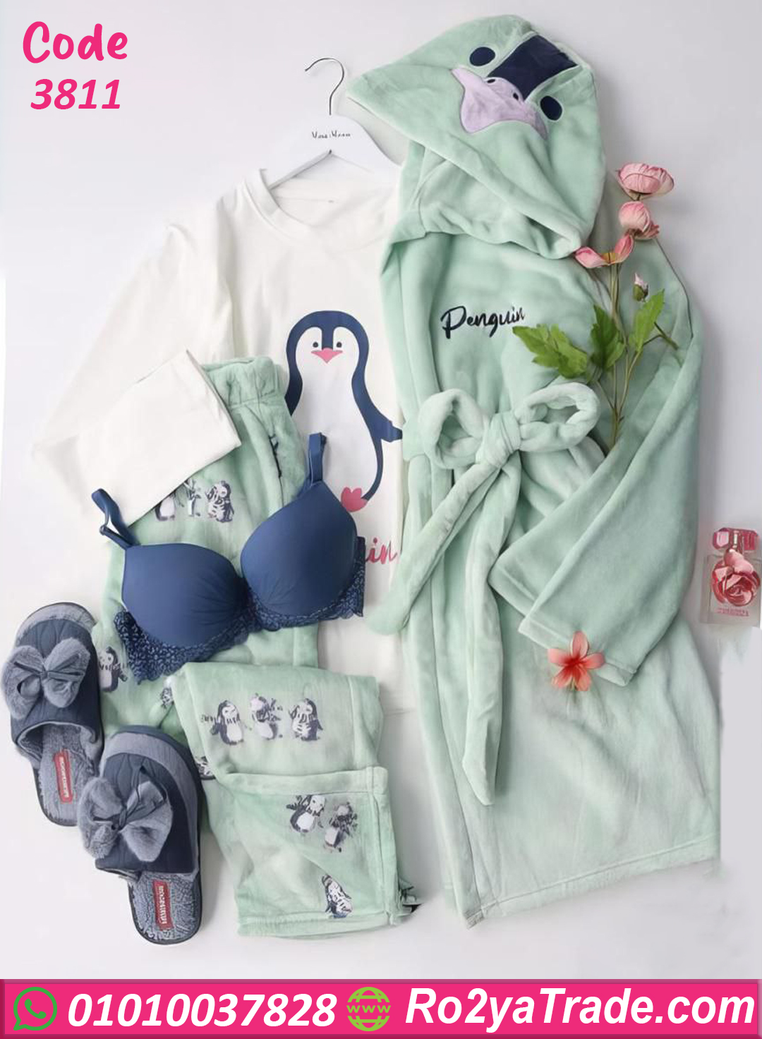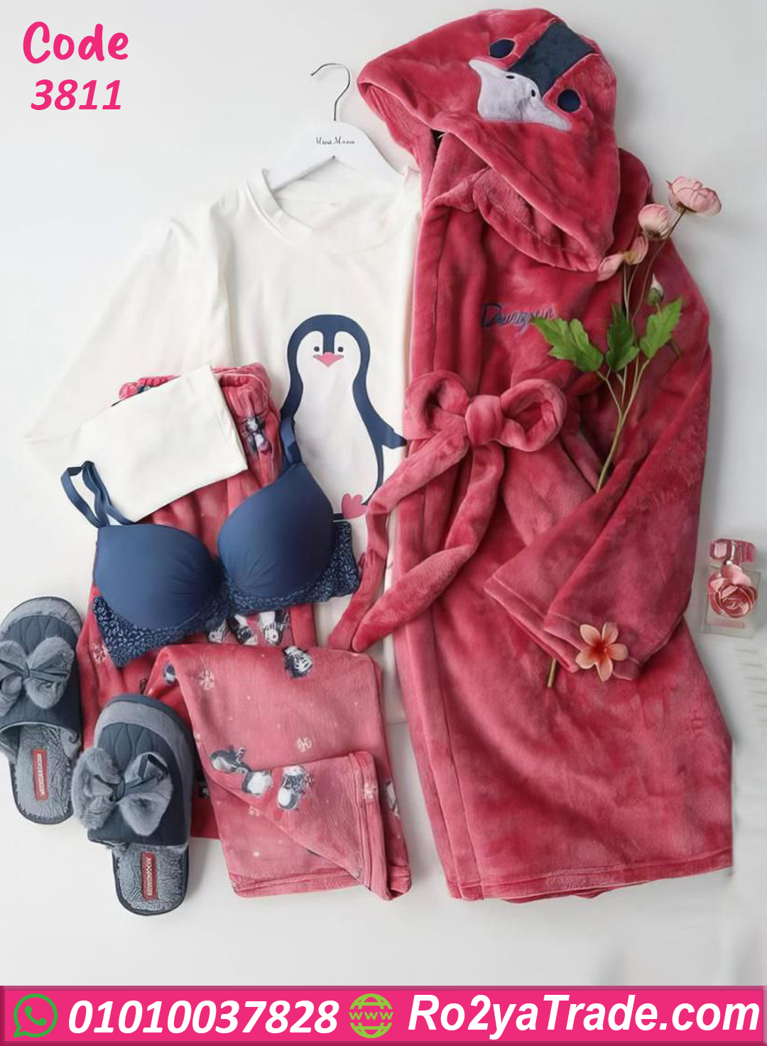 الطقم مكوّن من 3 قطع: تيشيرت مطبوع برسمة البطريق اللطيفة، وبنطلون بنقشة جذابة، ومعاهم روب قطيفة دافئ بألوان مبهجة.