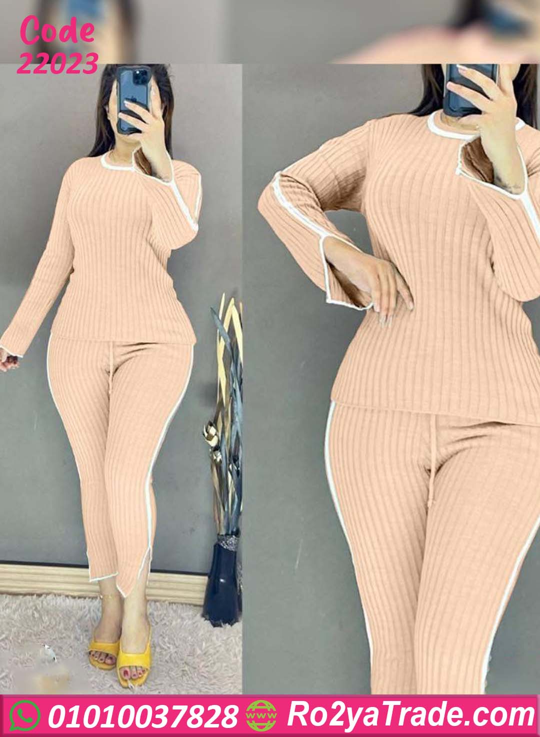 طقم بيجامة شتوي حريمي بتصميم عملي وشيك، مصنوع من خامة مضلعة ناعمة بتدي إحساس عالي بالراحة والدفا في أيام الشتاء. الطقم مكوّن من بلوزة بكم طويل وبنطلون مريح،