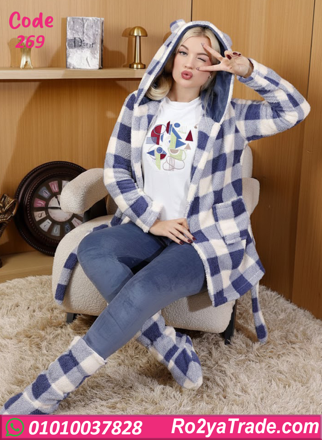 طقم بيجامة شتوي حريمي 3 قطع تصميم عصري ولطيف، خامة فرو ناعمة بتوفر دفا عالي وراحة طوال اليوم. الطقم مكون من بنطلون مريح، تيشيرت بطباعة مميزة، وروب كاروه بكابيشو مزود بتفصيلة دبدوب تضيف لمسة كيوت وشكل جذاب. مناسب للبس البيتي، الاسترخاء، وأيام الشتاء الباردة، وقطعة مثالية لكل ست بتحب تجمع بين الدفا والستايل.