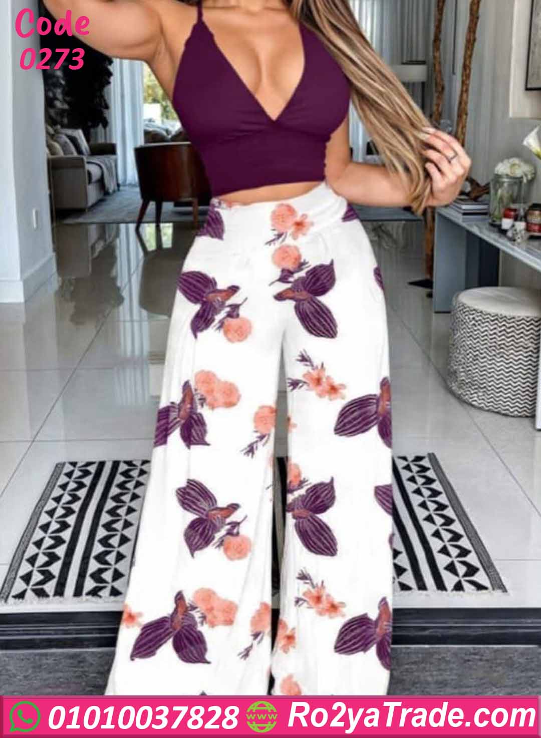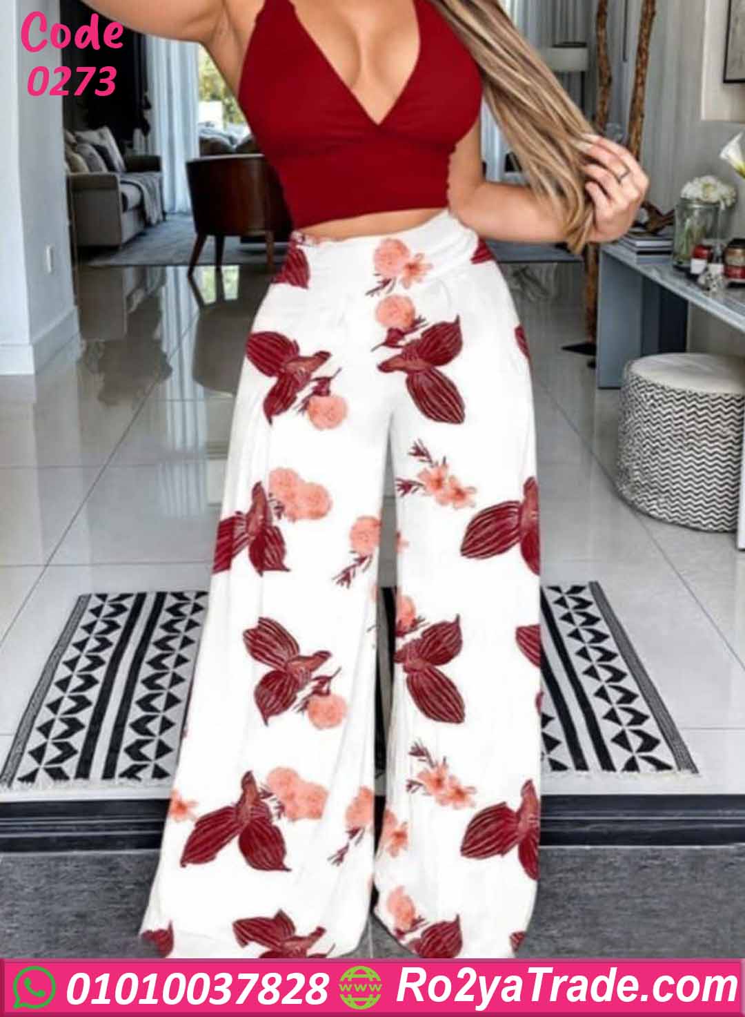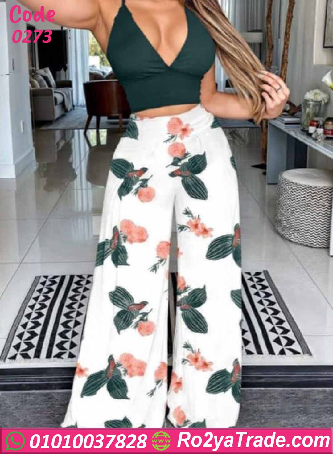 طقم بيجامة نسائي صيفي يتكون من توب قصير بحمالات رفيعة بتصميم بسيط وأنيق مع بنطلون واسع بنقشة ورود جذابة تضيف لمسة أنثوية