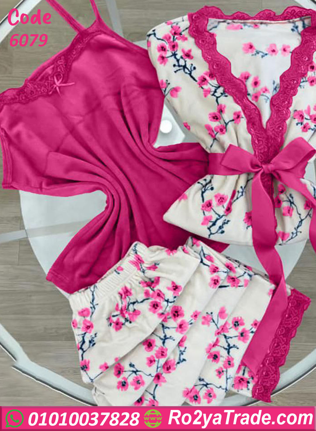 الطقم بيتكوّن من توب كت بخامة ناعمة وروب طويل عليه طبعة ورود جذابة، بياخد شكل الجسم بلُطف ويديكي راحة طول اليوم.