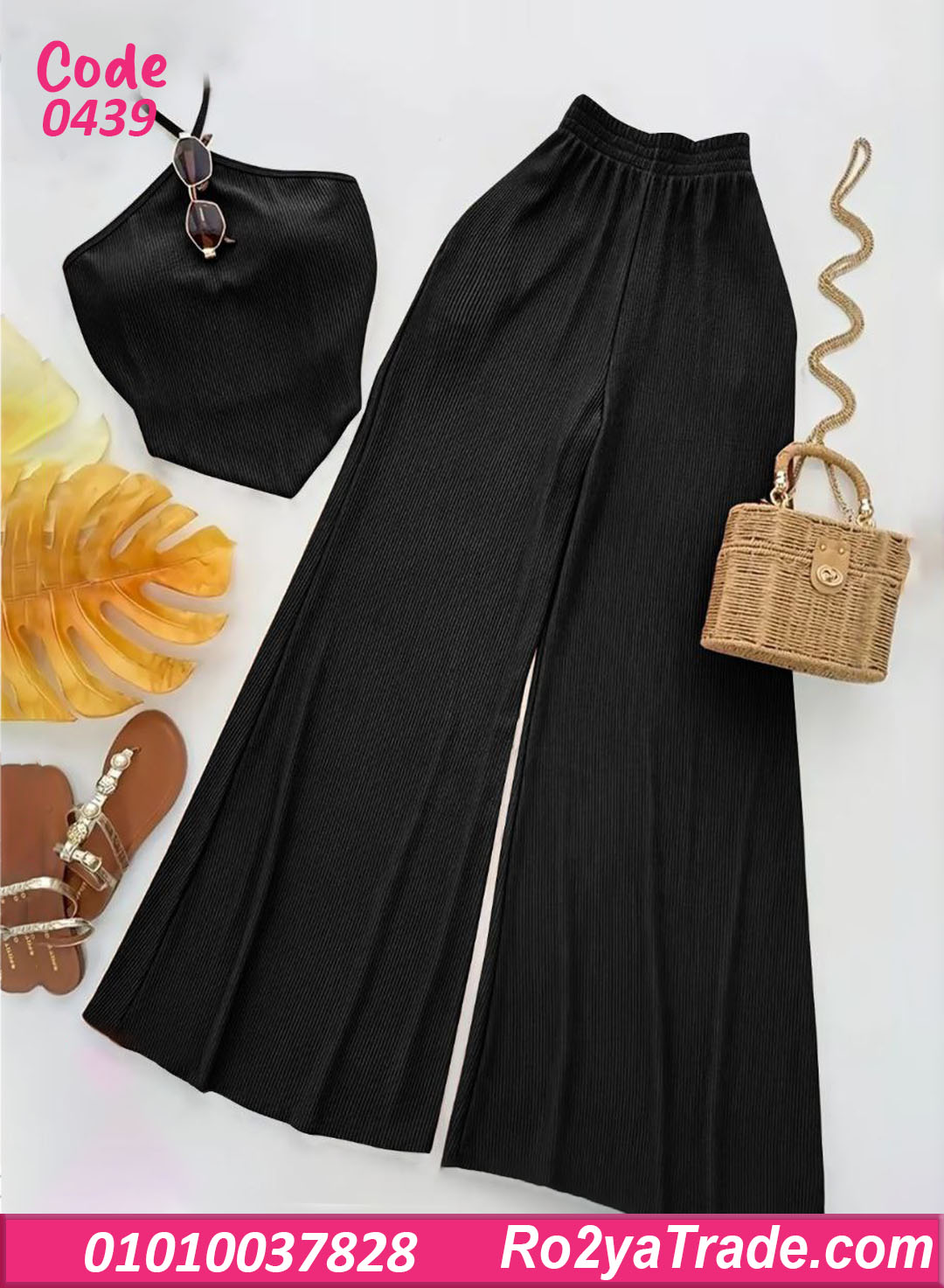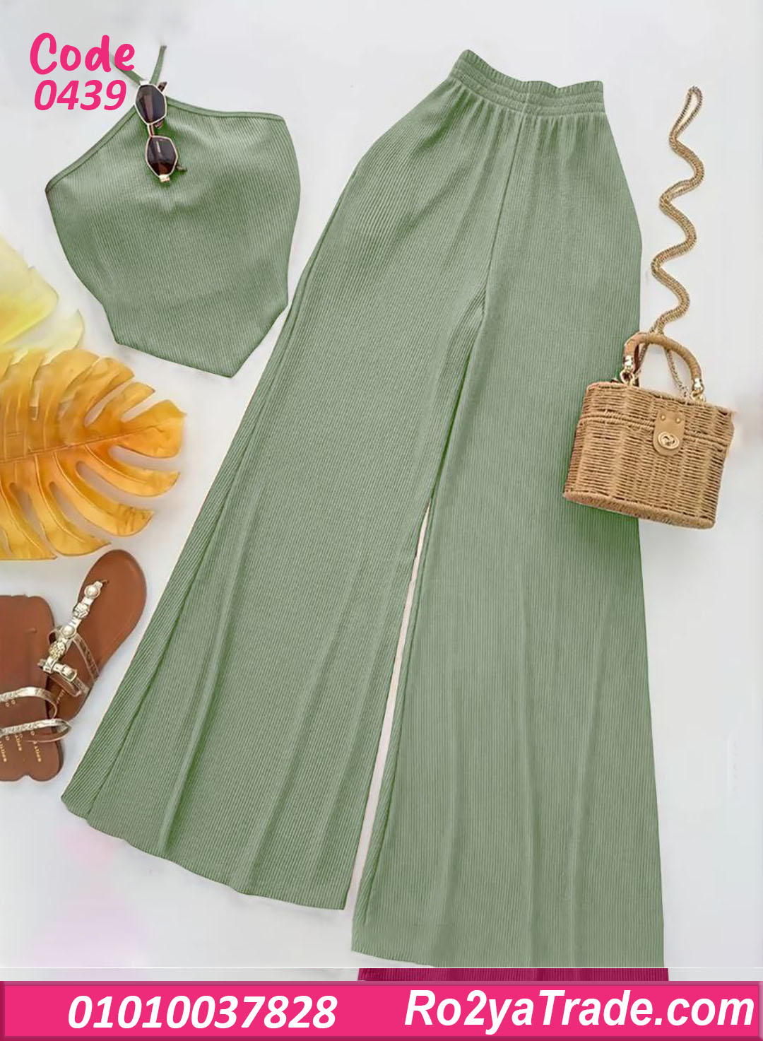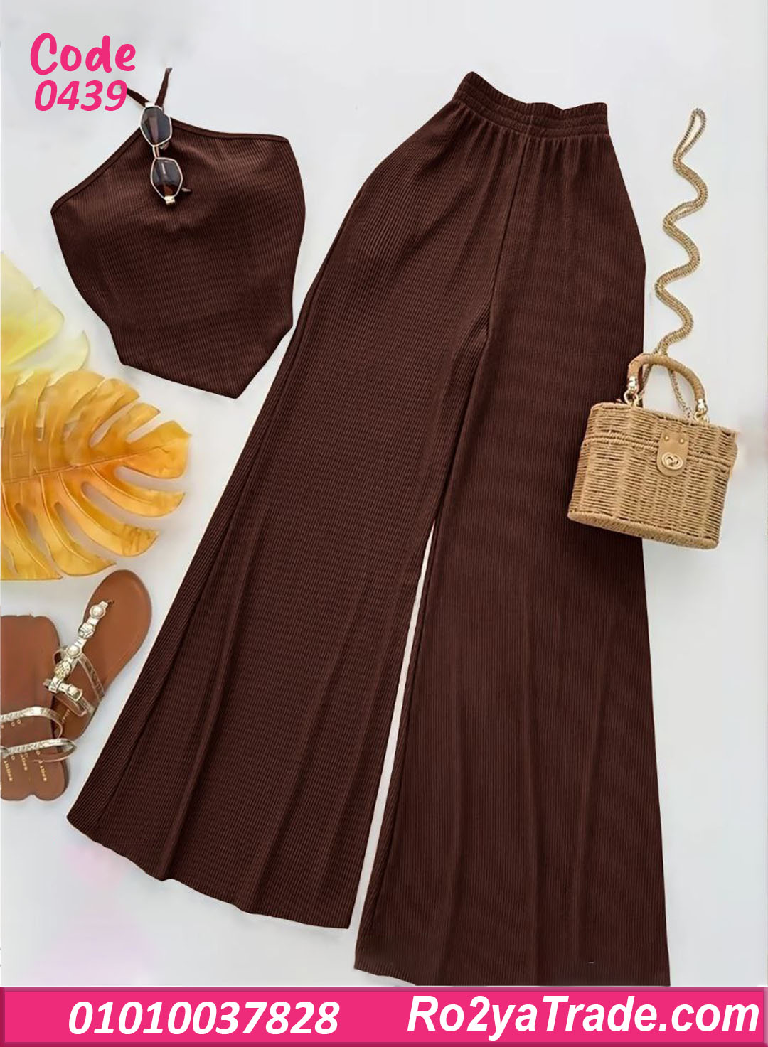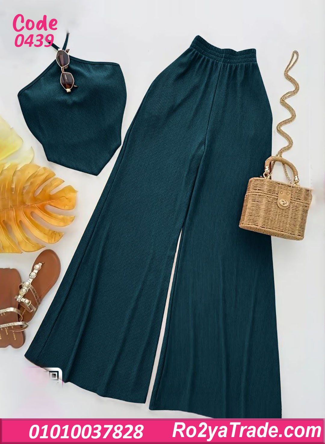 البنطلون الواسع بيدي راحة في الحركة ولمسة مودرن، والتوب سهل يتلبس لوحده أو يتنسق مع قطع تانية.