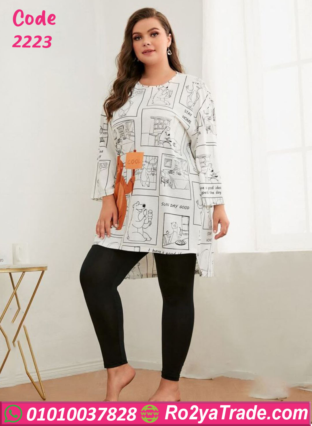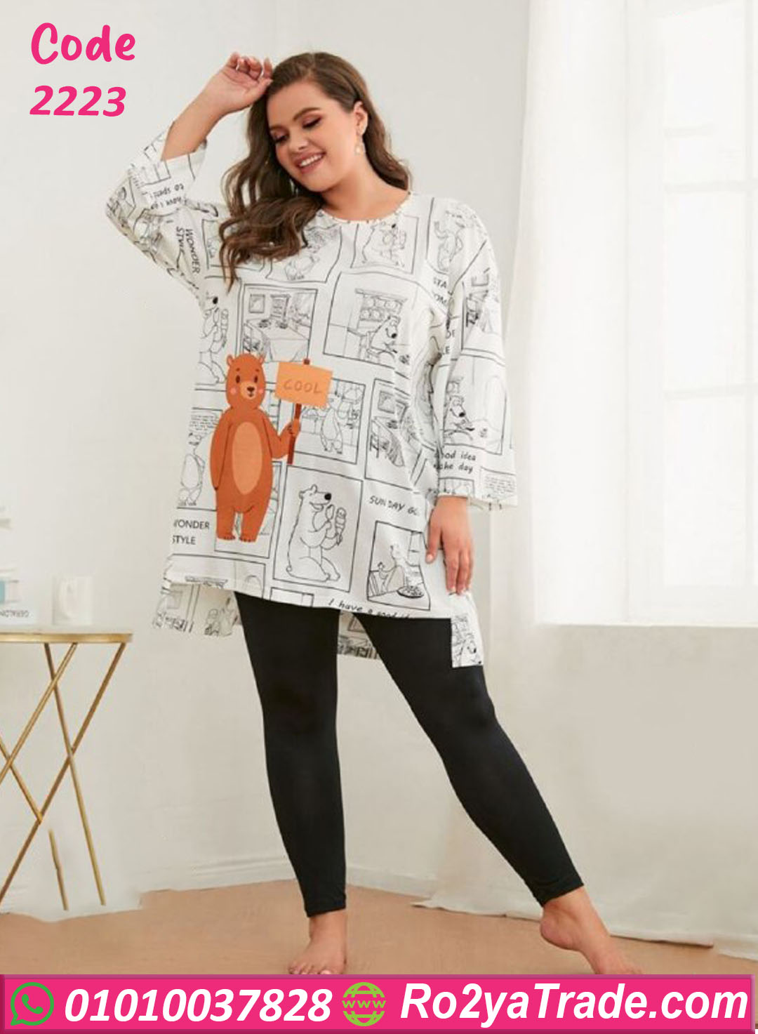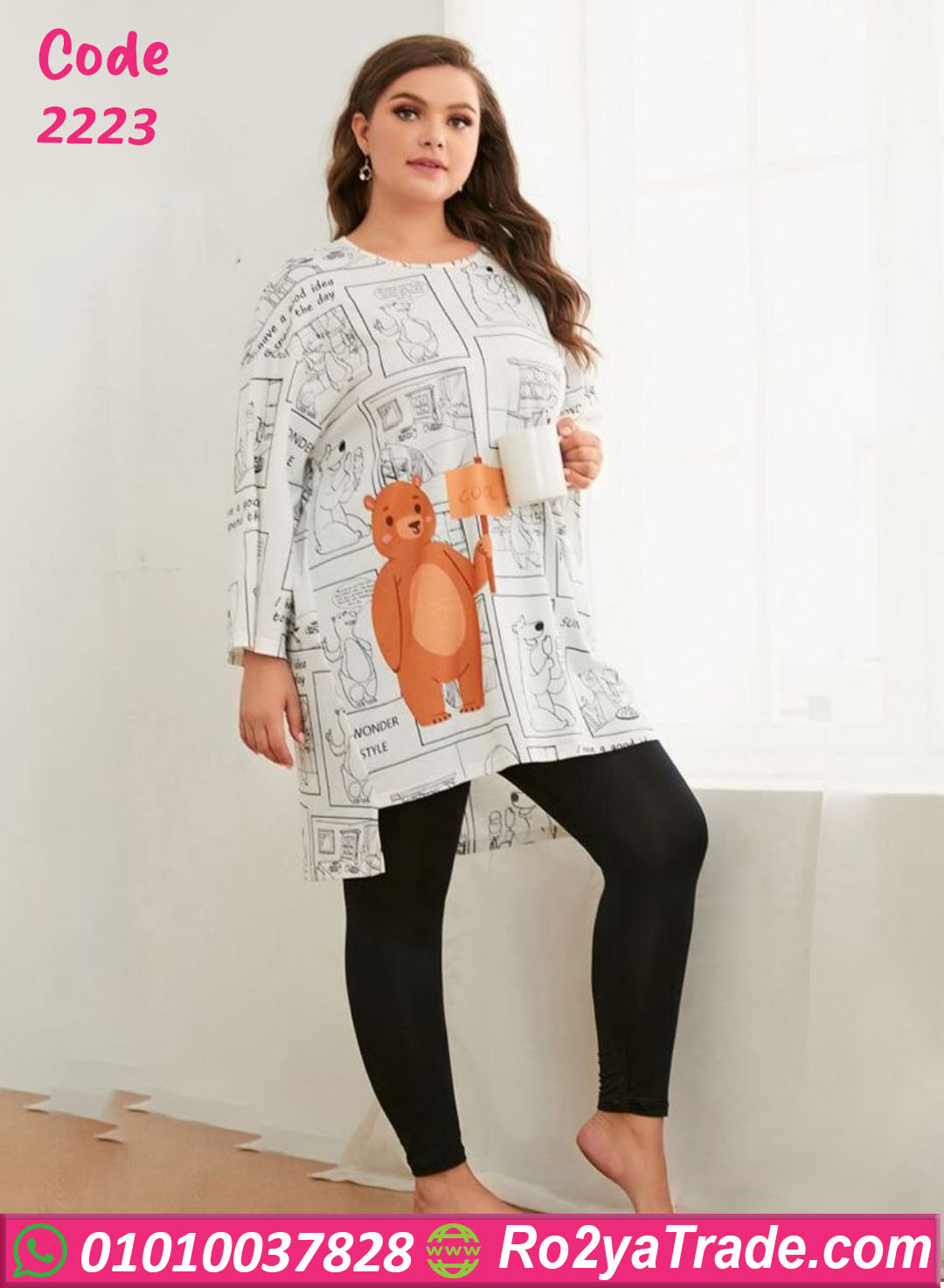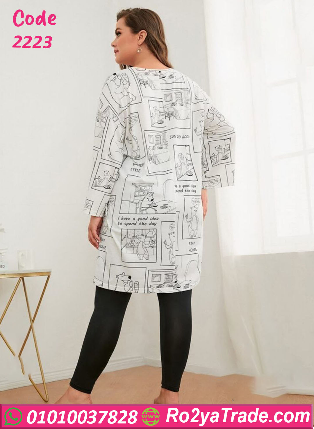 بلوزة طويلة بتصميم كارتوني ظريف جدًا مع بنطلون ليجن أسود مرن بيبرز شكل الجسم من غير ما يضايقك.