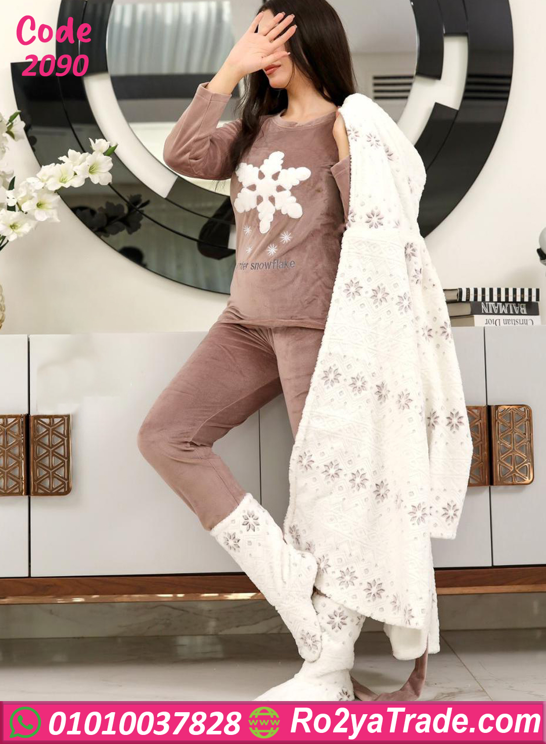 طقم شتوي ناعم جدًا من خامة قطيفة مبطنة تدفي وتدلّعك في نفس الوقت، بيجي معا روب طويل بكابيشو وتي شيرت مطبوع وبنطلون دافئ 👌