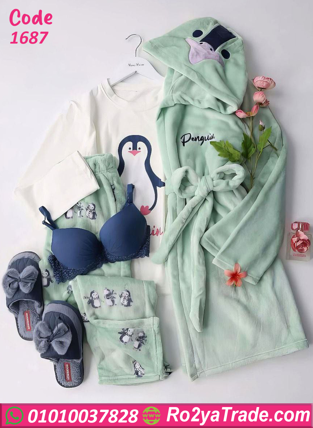 الطقم بيتكوّن من بنطلون واسع خامة قطيفة ناعمة جدًا مع بلوزة بطبعة بينجوين كيوت، وكمان روب بنفس اللون بتصميم عملي فيه حزام خصر وكابوش، غير إن معاه شبشب ناعم لتدفية كاملة 👌