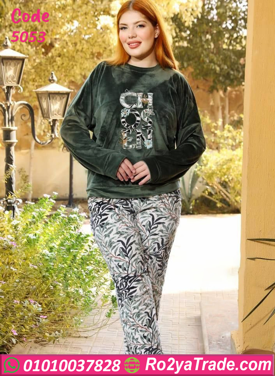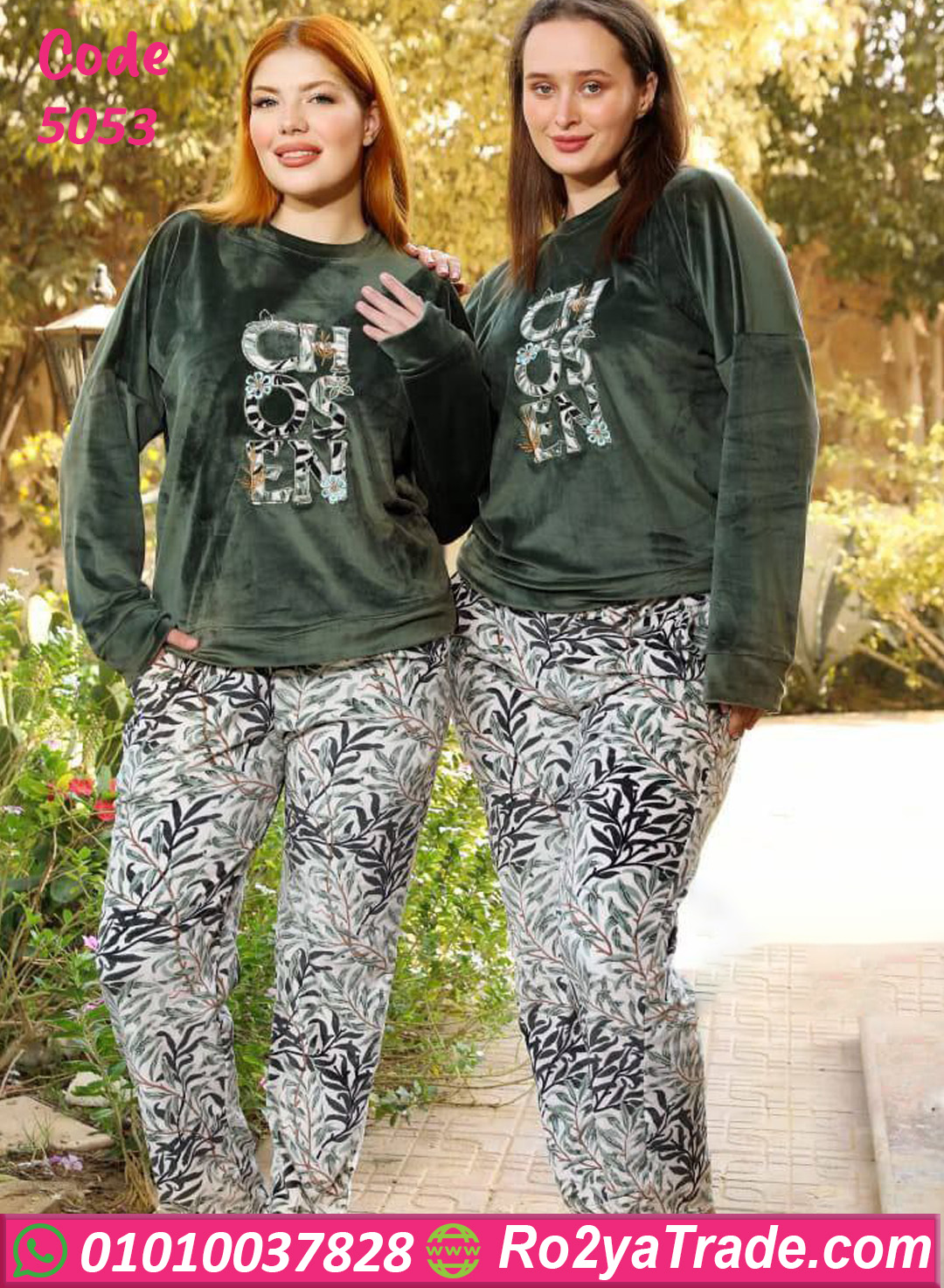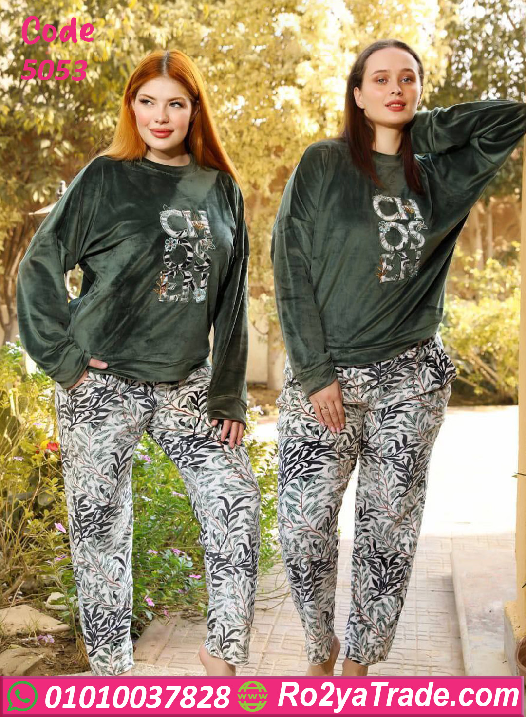 بلوزة قطيفة بأكمام مريحة وتصميم عصري جذاب عليه كتابة CHOSEN مطرزة، وبنطلون برسمة فروع شيك جدًا يديكي لوك أنيق في البيت 🌟