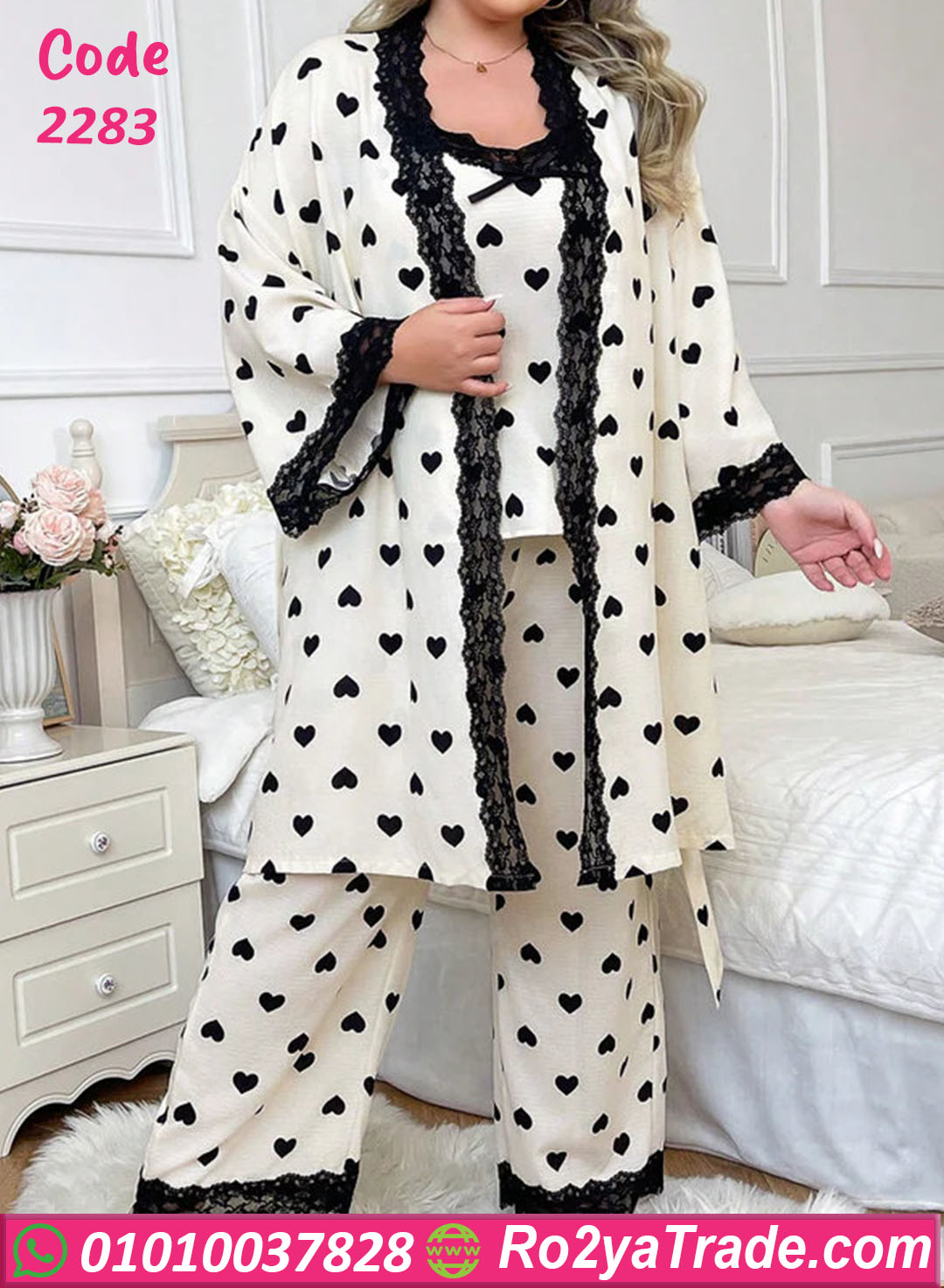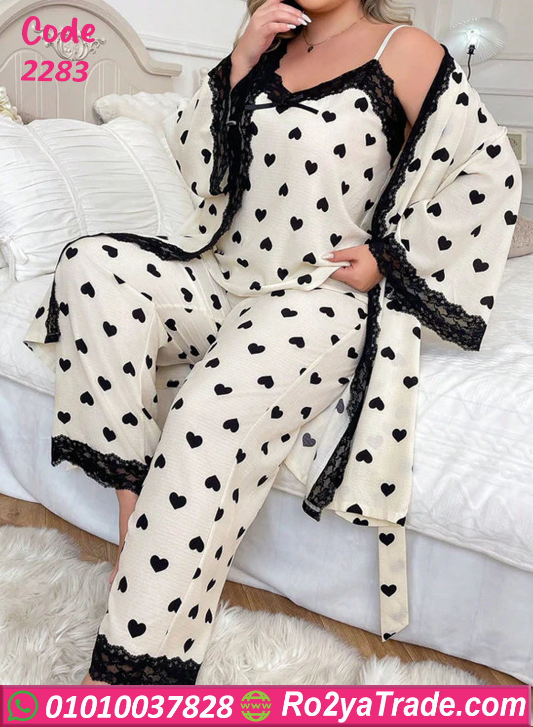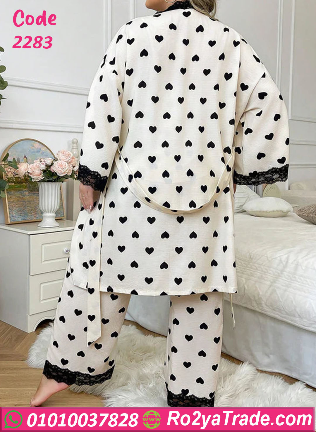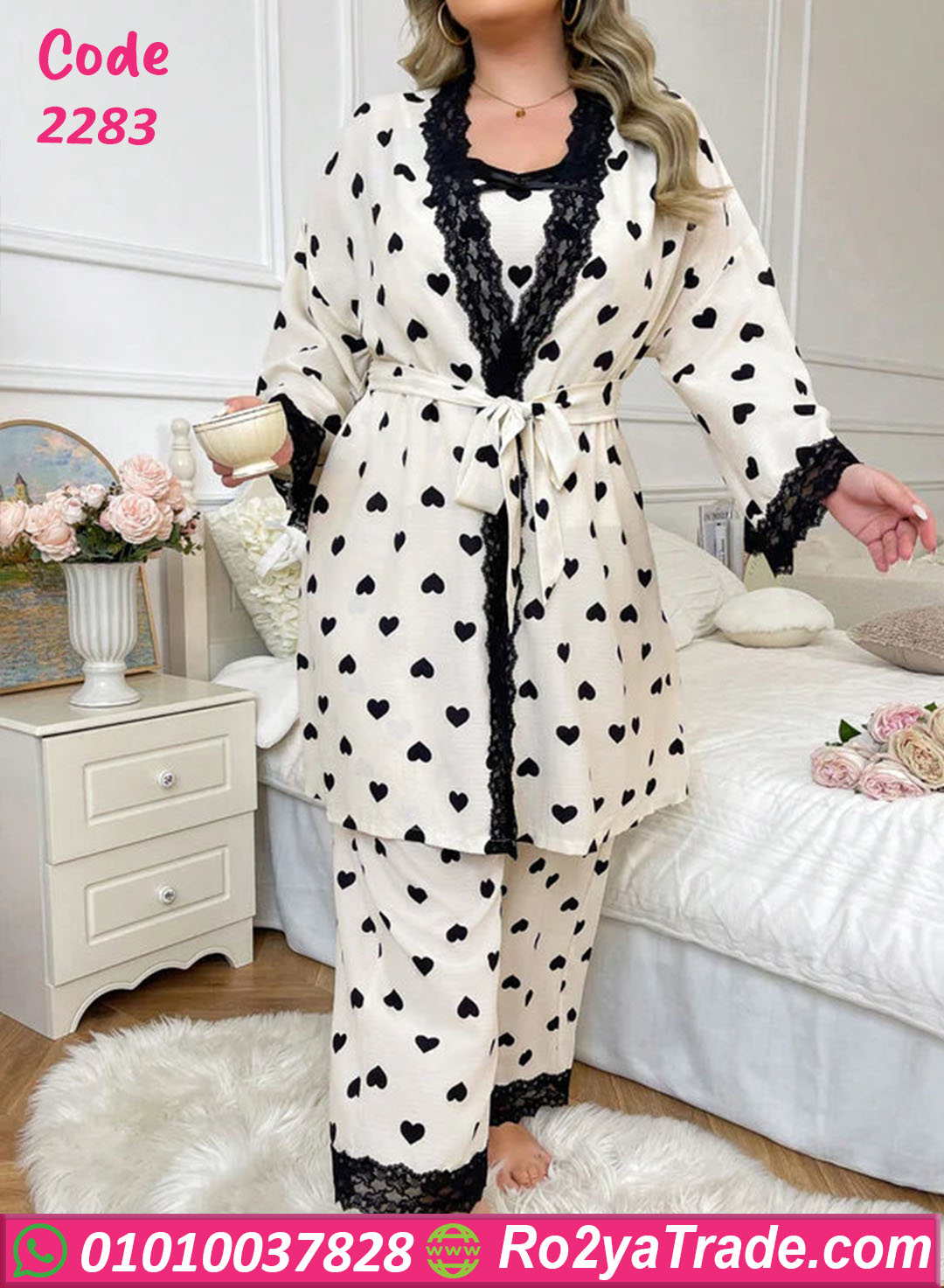 الطقم بيتكون من 3 قطع: توب، بنطلون، وروب بنفس النقشة، ومناسب للبنات والسيدات اللي بيحبوا الستايل الهادي الأنيق في البيت.