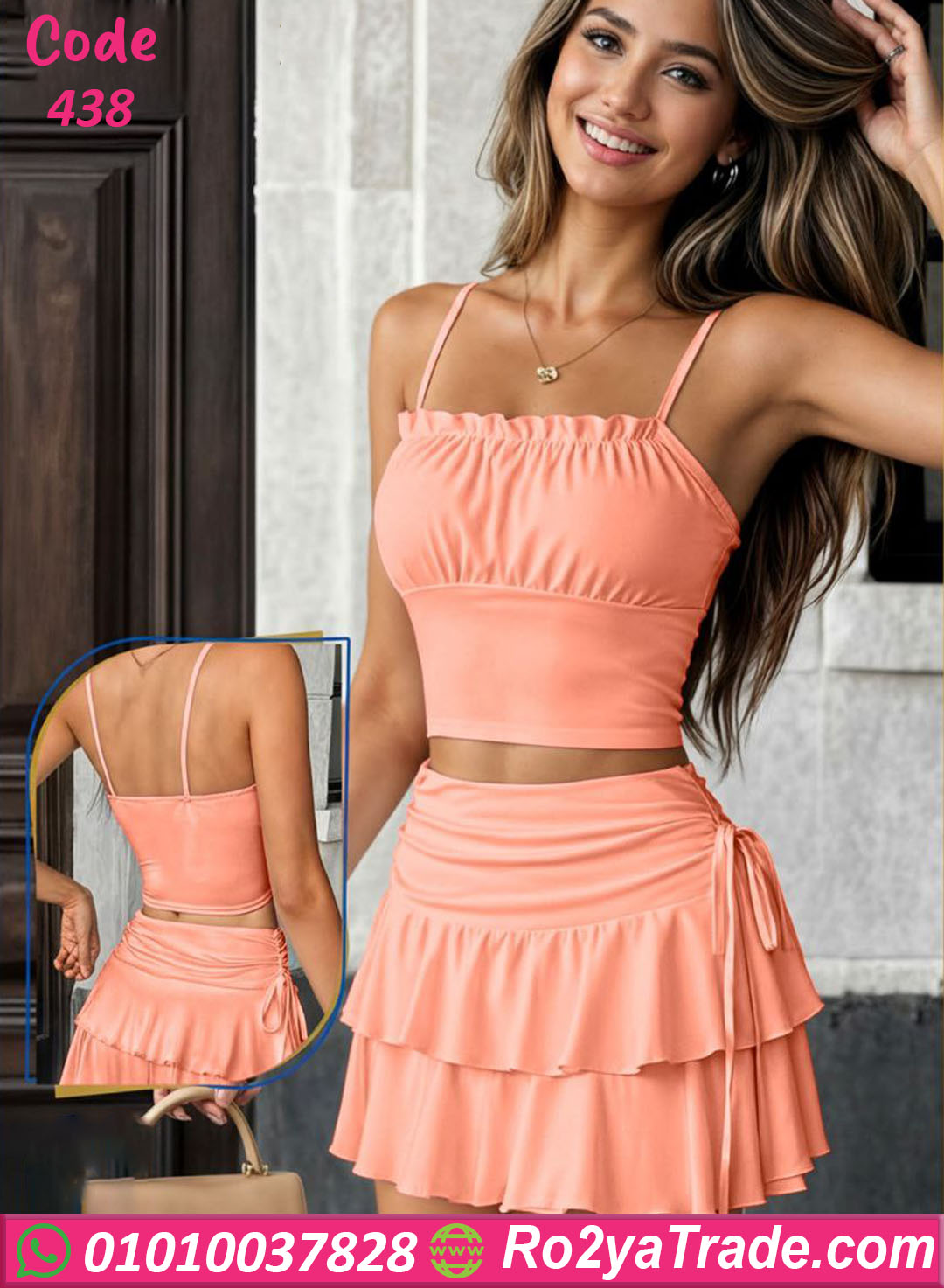 طقم حريمي أنيق مكون من توب قصير مع ميني جيب بطبقات ناعمة تمنحك إطلالة أنثوية جذابة وعصرية مناسبة للبيت والخروجات الخفيفة.