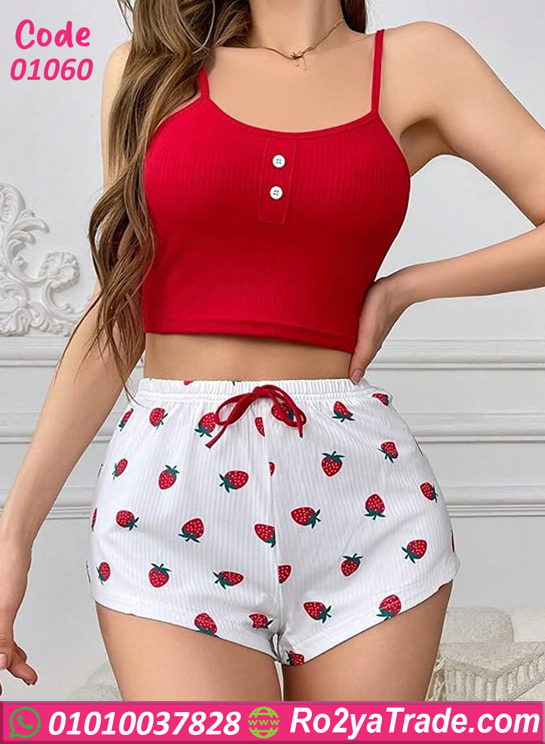 الشورت بقى واسع ومريح بخامة قطن نوعًا ما “ريب” بتهوي الجسم ومناسبة للجو الحر، وكمان مطبوع فراولة شكلها كيوت وجذاب جدًا 🤩