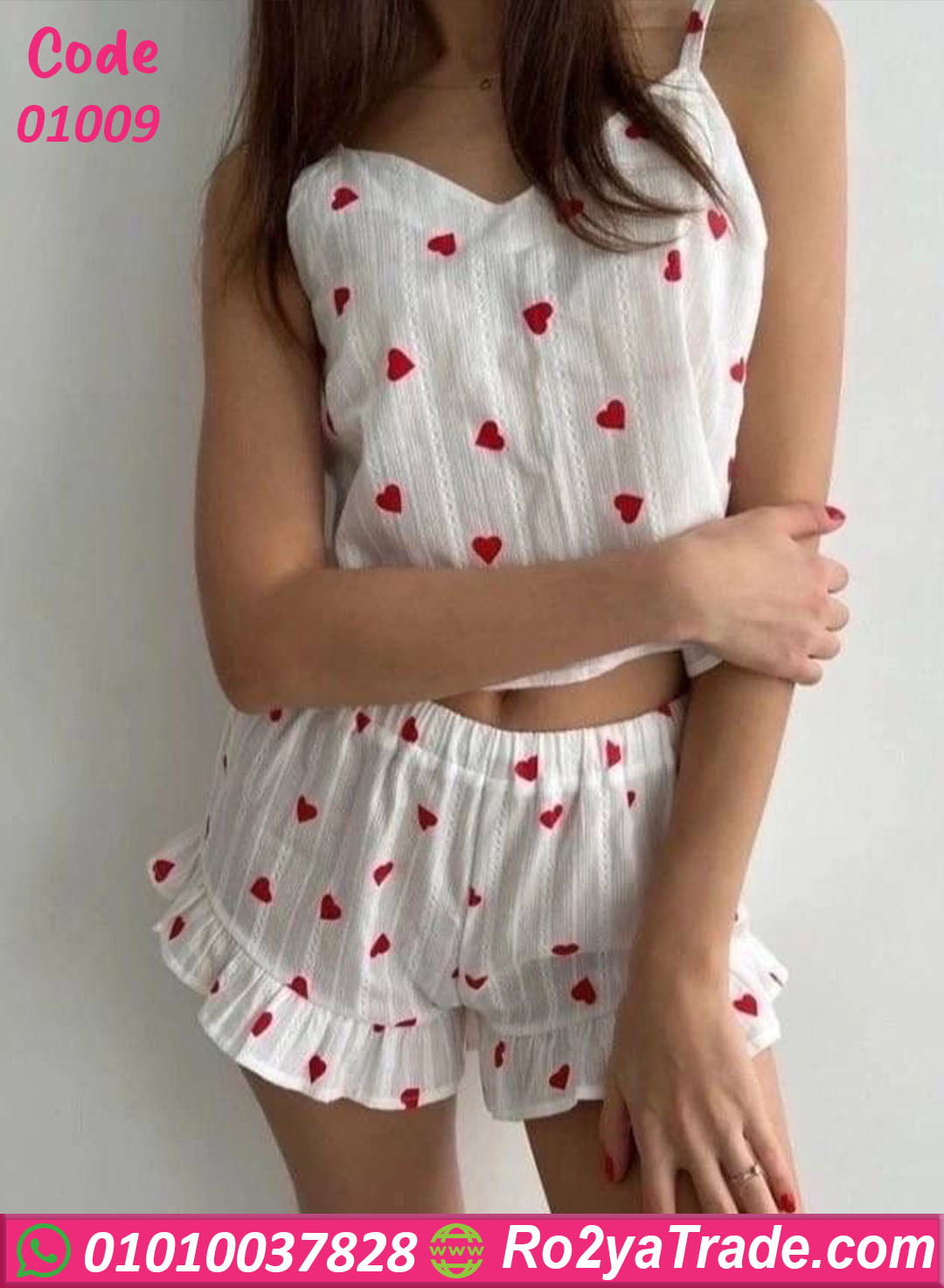 طقم بناتي صيفي لطيف بخامة خفيفة ومريحة جدًا، عبارة عن شورت بكشكشة وتوب بحمالات رفيعة منقوش بقلوب حمرا، بيدي لوك ناعم وأنثوي مناسب لأيام الصيف والدلع في البيت 🌸