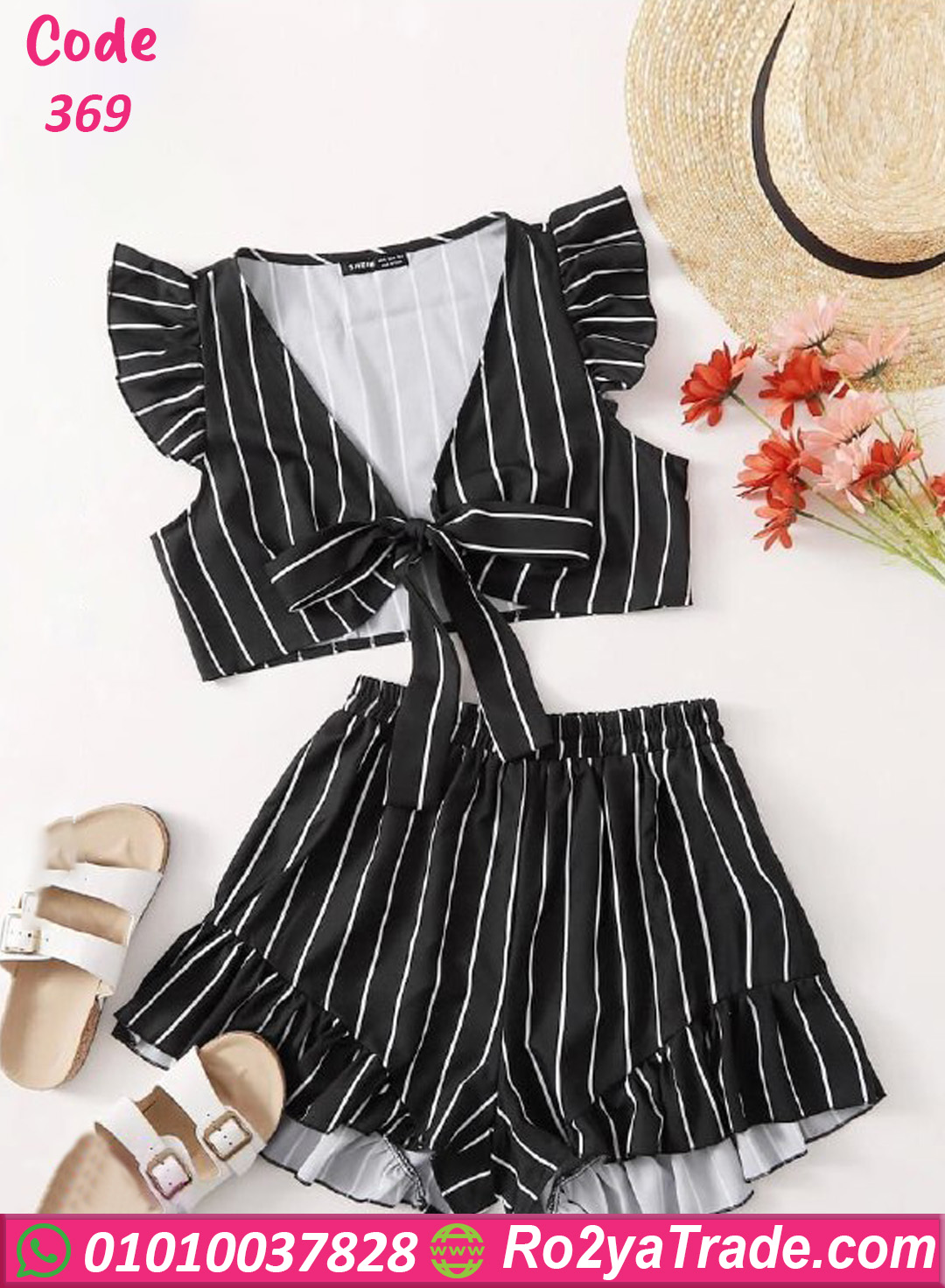 طقم حريمي صيفي أنيق يتكون من توب قصير بتصميم عصري مع هوت شورت مريح، يتميز بنقشة خطوط أنيقة تمنحك إطلالة كاجوال جذابة في أيام الصيف.
