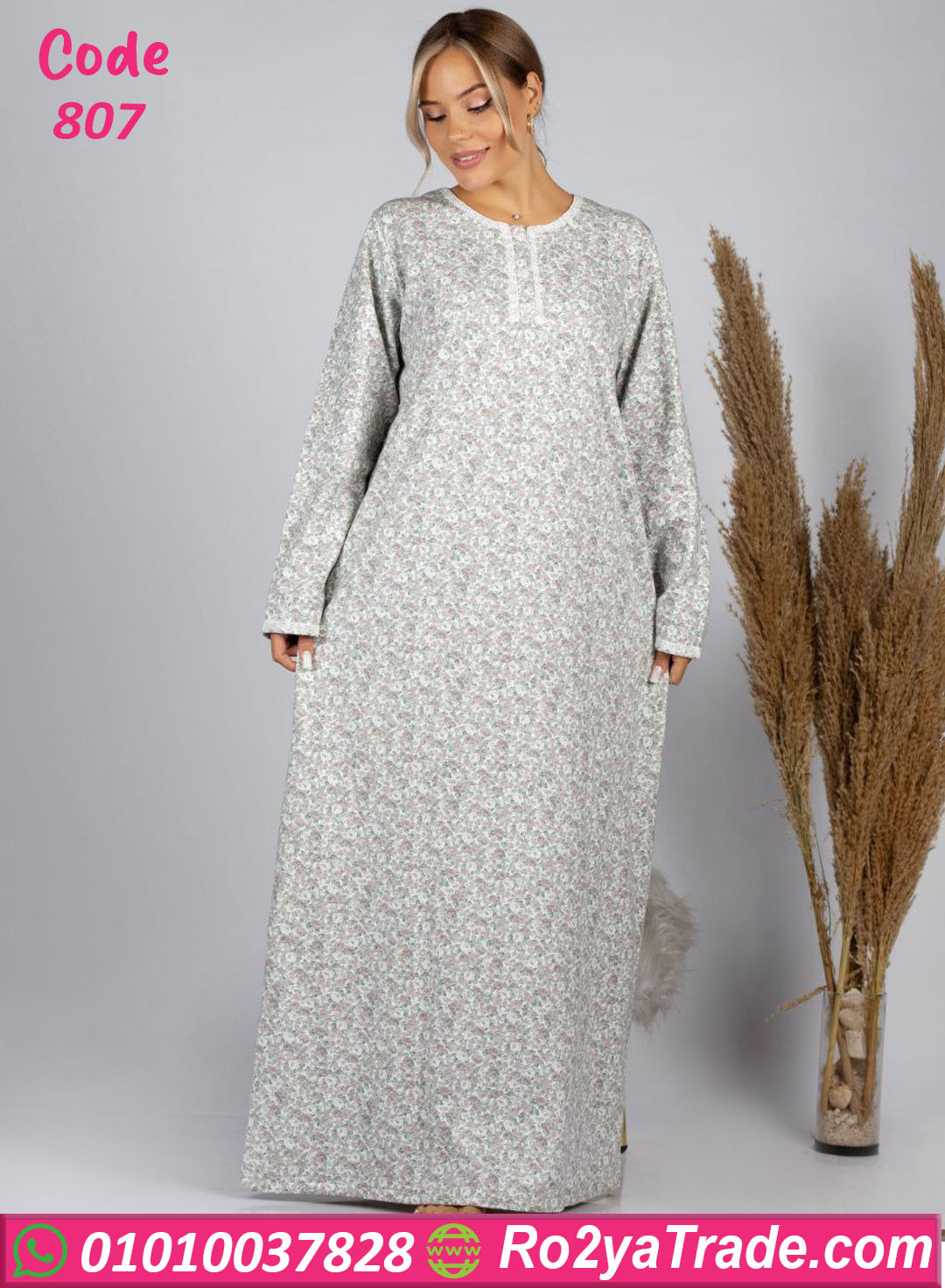 تصميمها طويل ومغلق بالكامل، بنقشة ورود هادية تضيف لمسة أنوثة ورُقي.