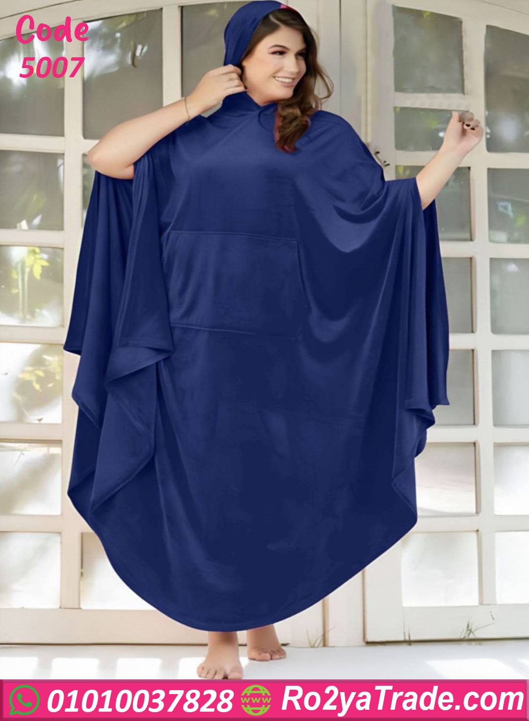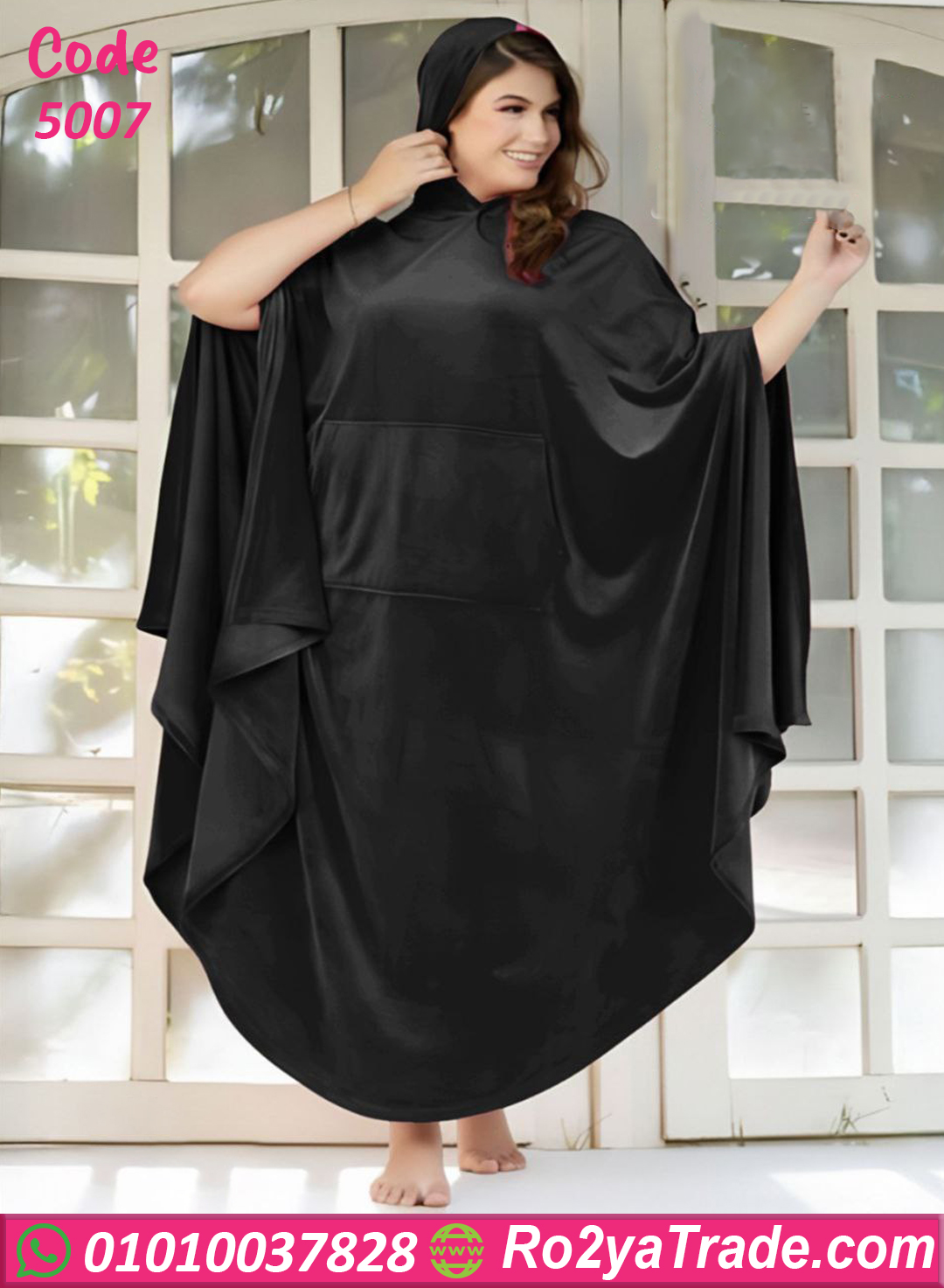 عباية بكاب واسع من خامة القطيفة المضبوعة اللي بتجمع بين النعومة والفخامة، تصميمها انسيابي يدي شكل أنثوي شيك جدًا، وفي نفس الوقت مريح للحركة داخل البيت.