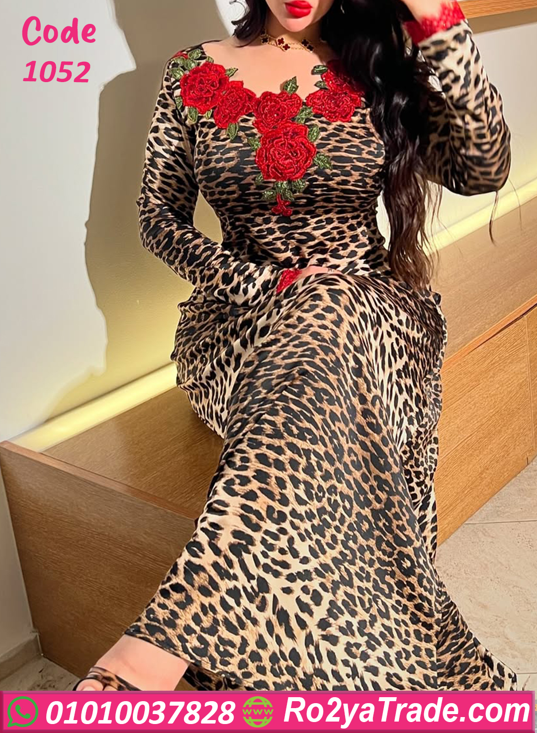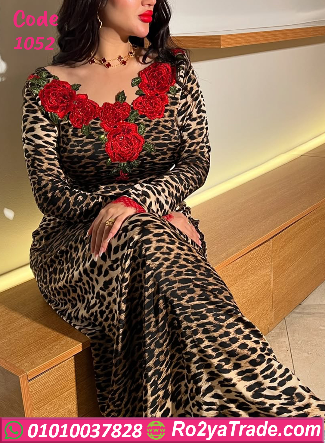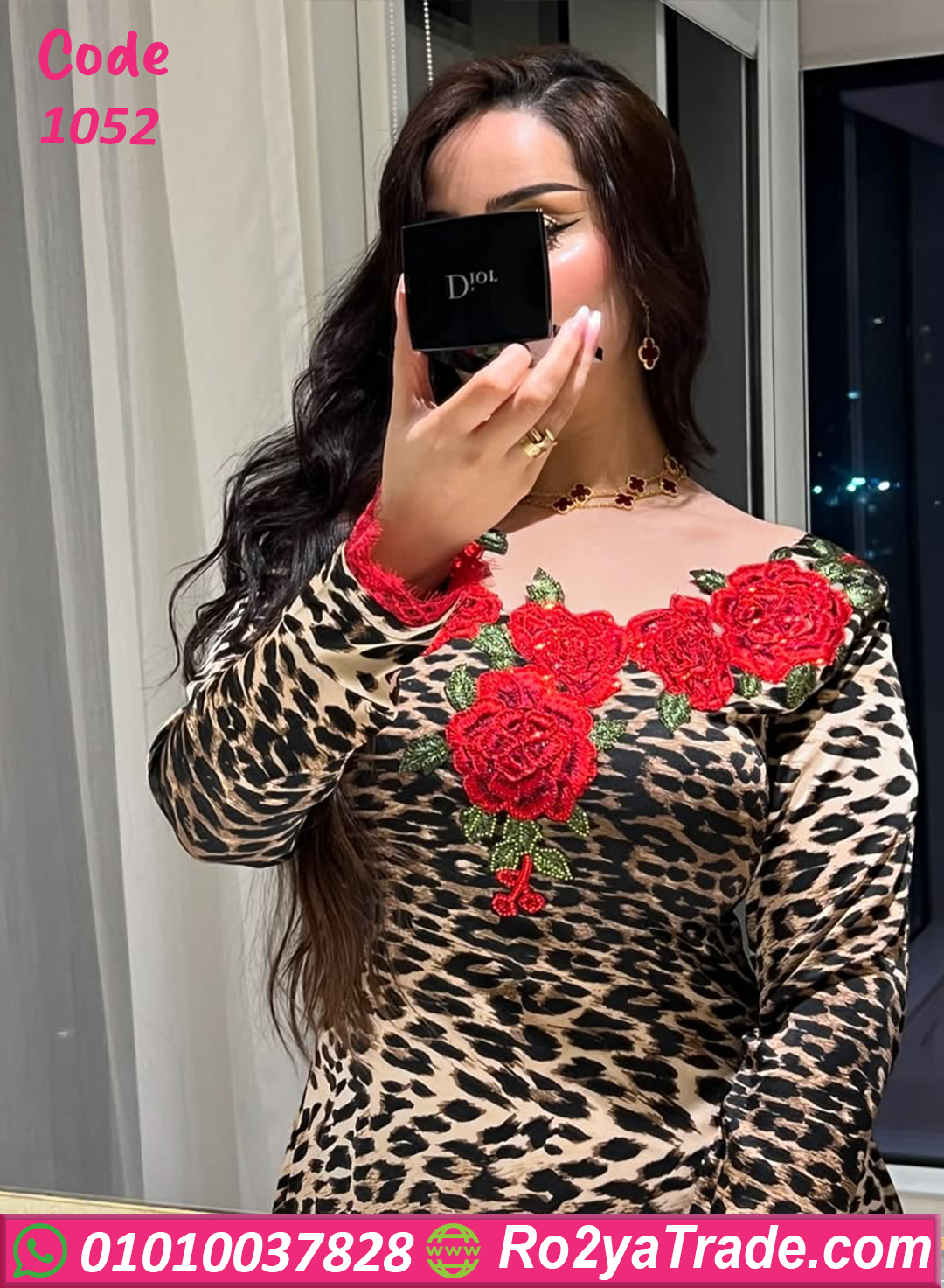 عباية بيتي صيفي بخامة مرنة وطباعة تايجر شيك مع تطريز ورد أحمر أنيق يديكي لوك أنثوي فاخر.