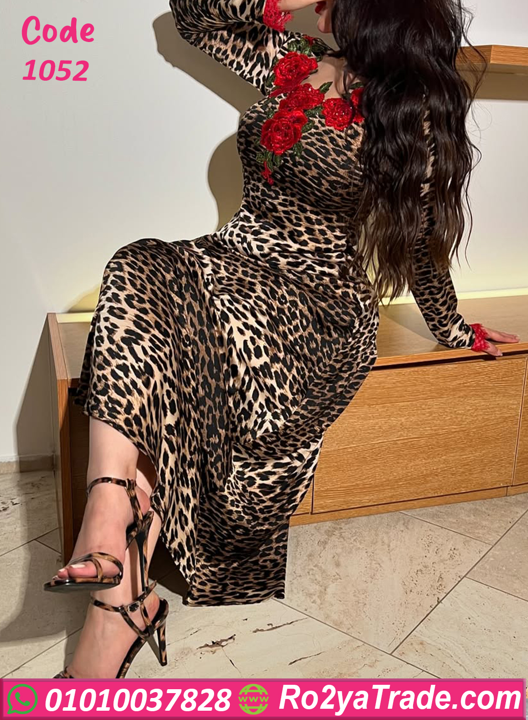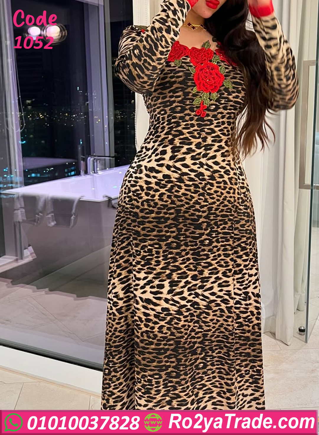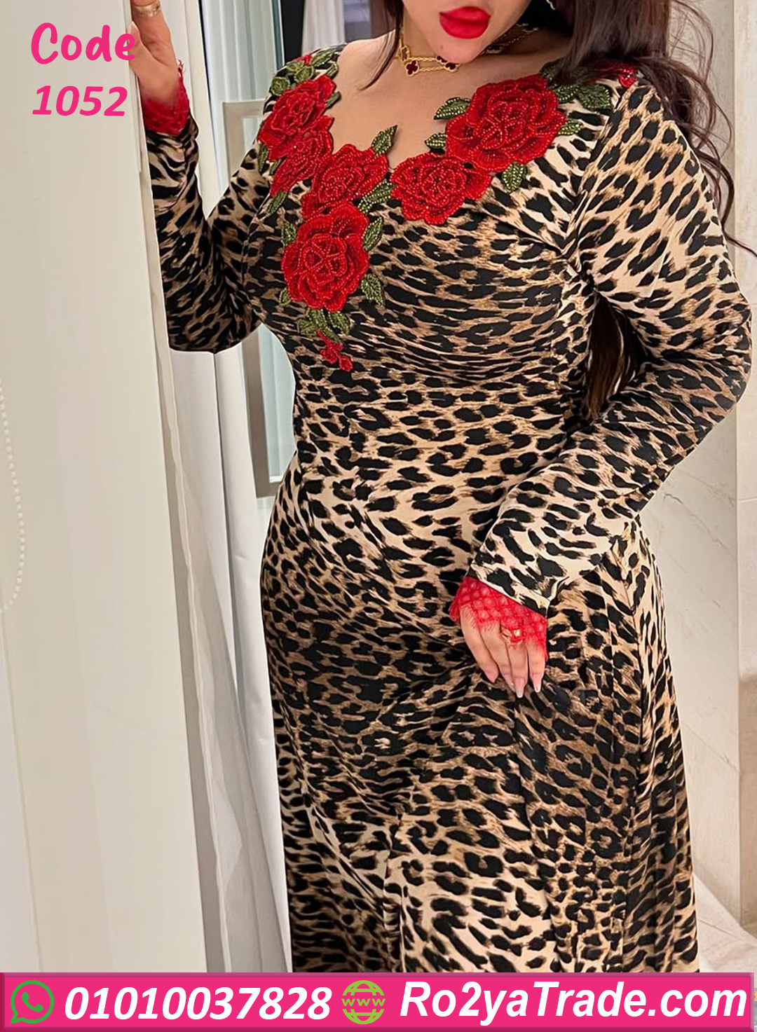 عباية بيتي صيفي بخامة مرنة وطباعة تايجر شيك مع تطريز ورد أحمر أنيق يديكي لوك أنثوي فاخر.