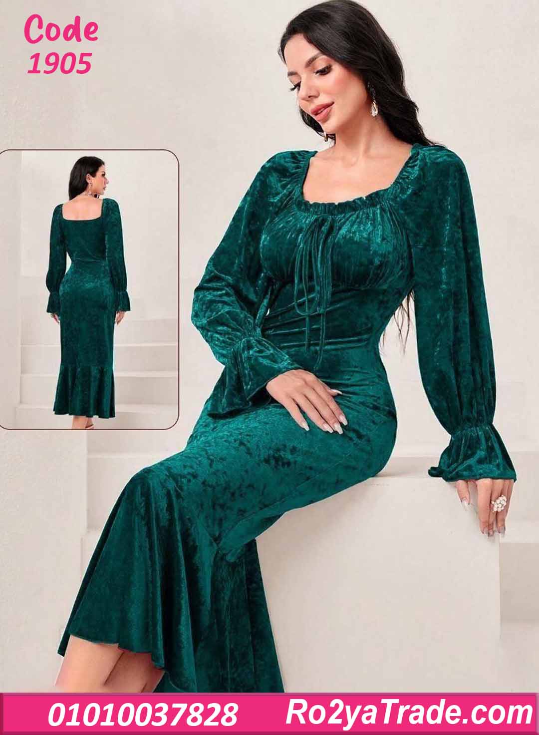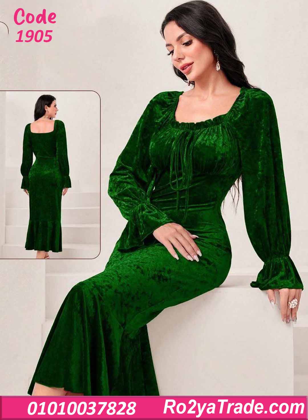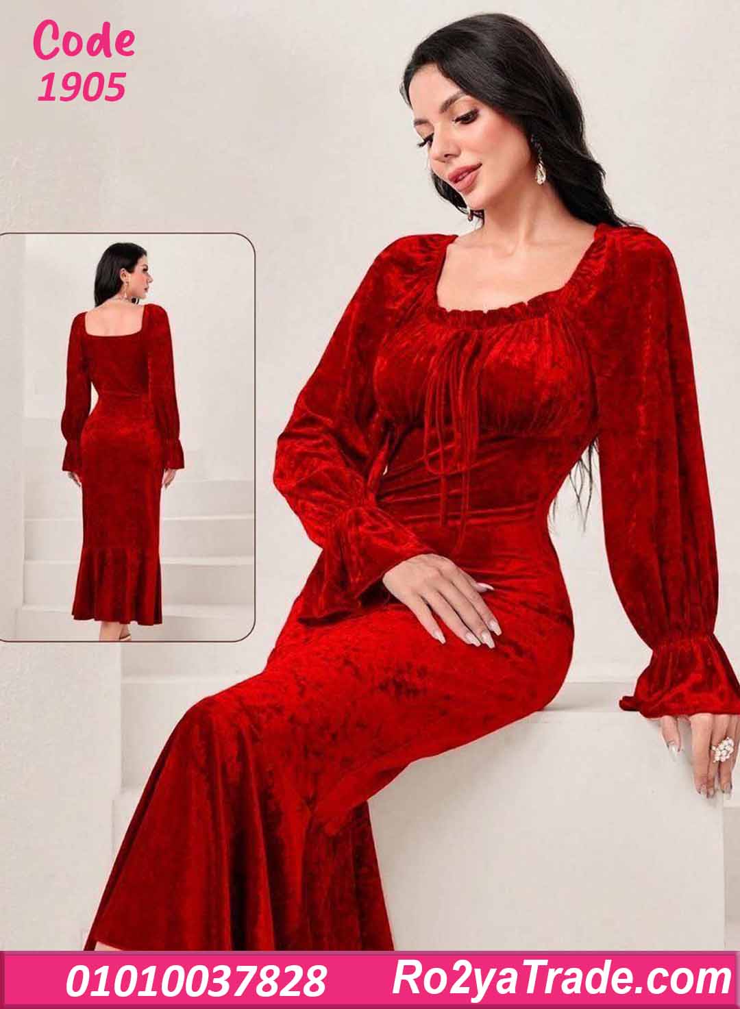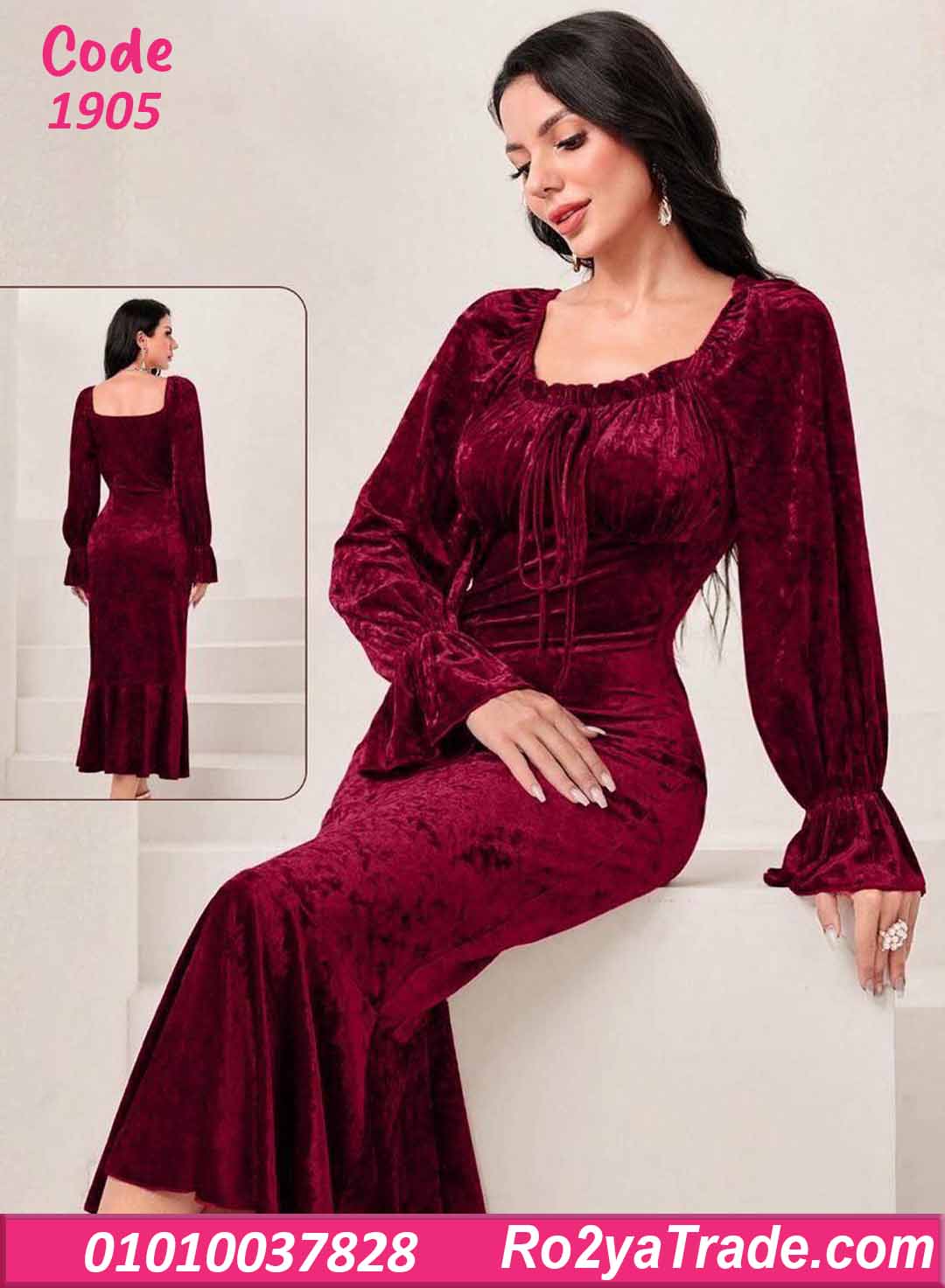 فستان شتوي طويل مخمل بفتحة صدر مربعة – كود 1905