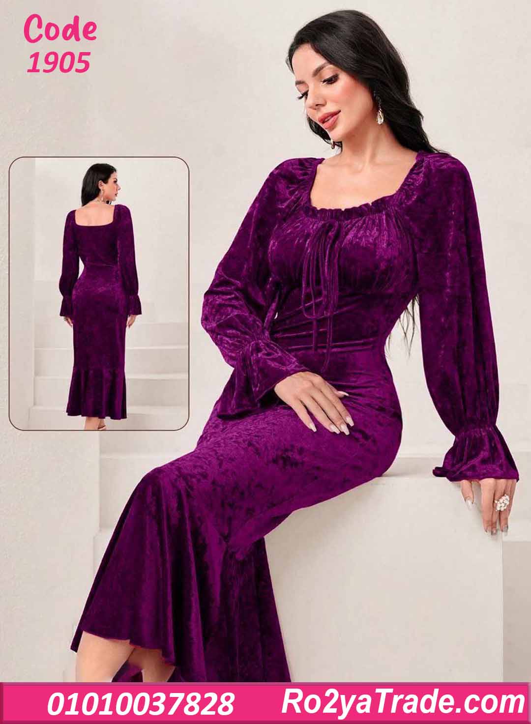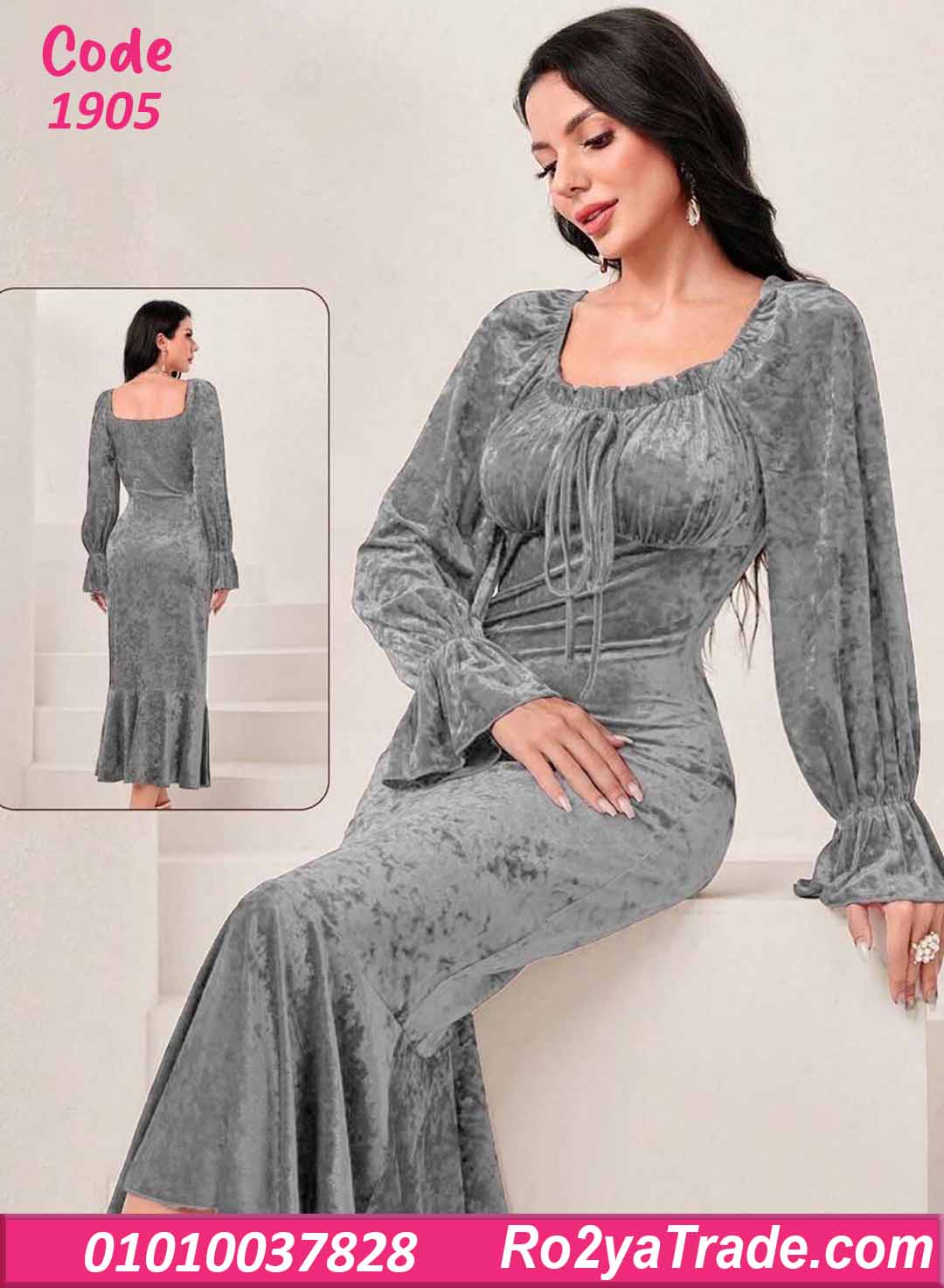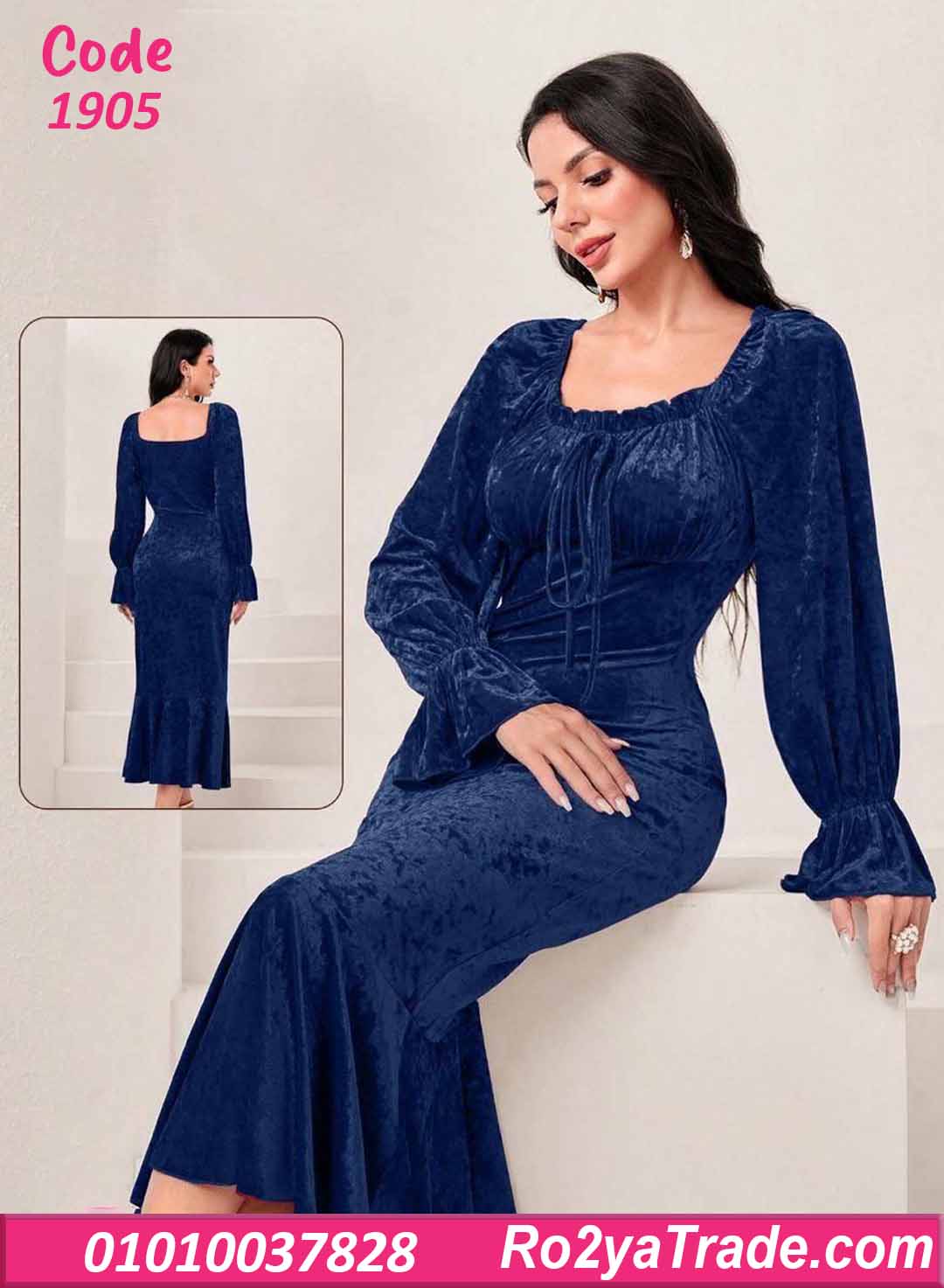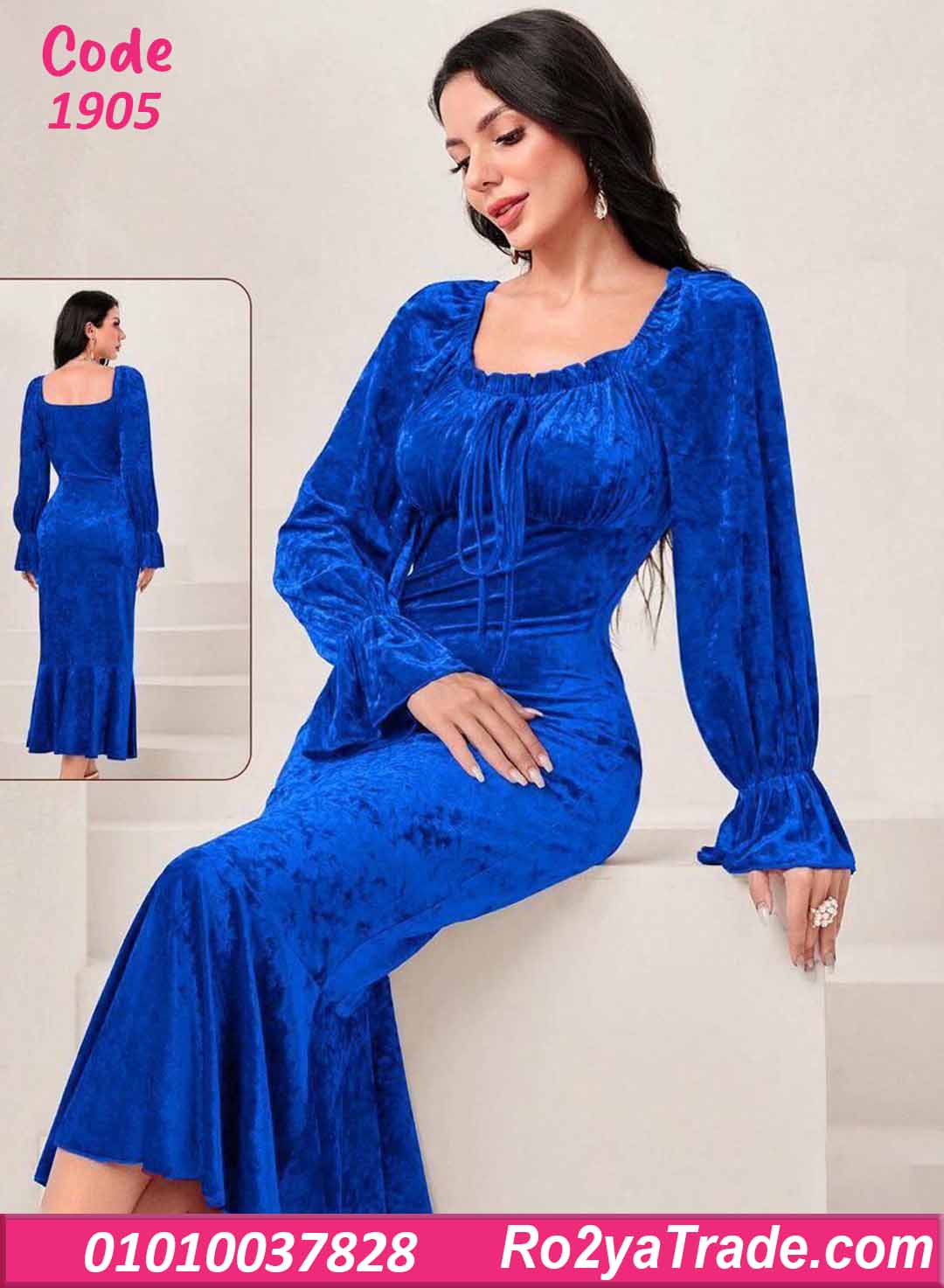 فستان شتوي طويل مخمل بفتحة صدر مربعة – كود 1905