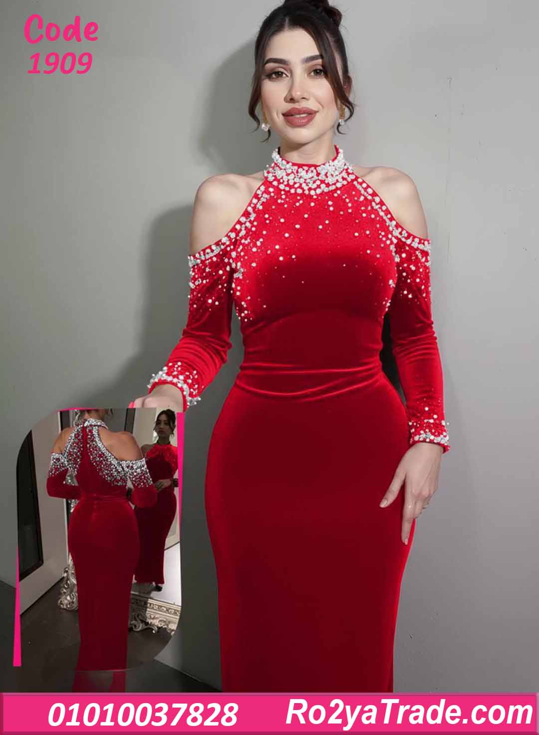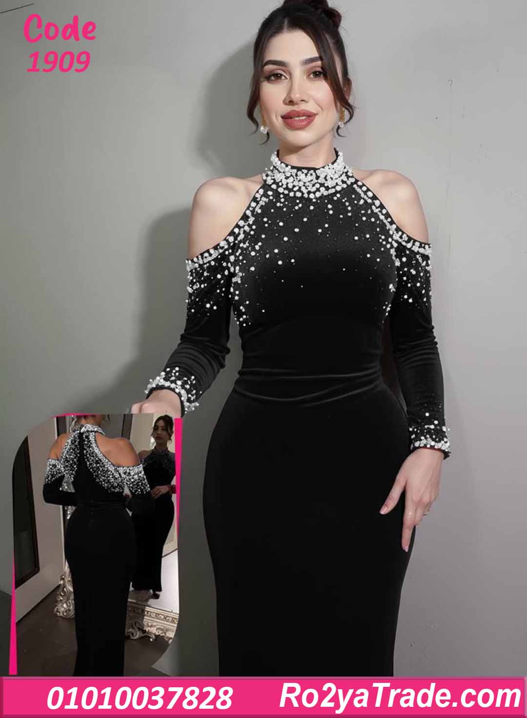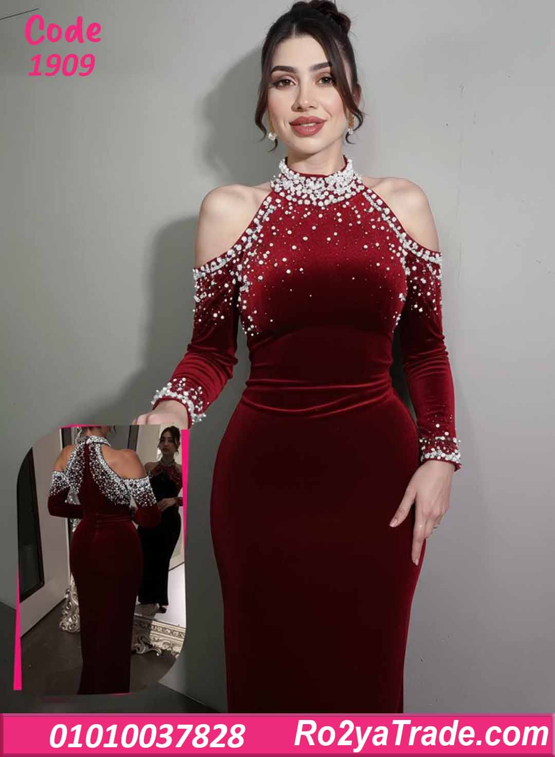 الفستان جاي بقصة ضيقة على الجسم بتبرز القوام بشكل أنثوي جذاب، مع تصميم كولد شولدر (فتحة على الكتفين) ورقبة عالية مطرزة باللولي والفصوص بشكل فخم جدًا.