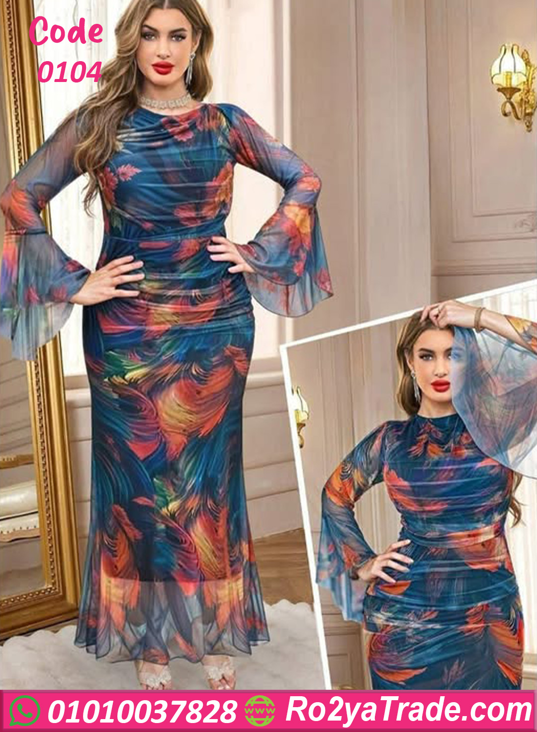 فستان صيفي طويل شيفون ملون بأكمام واسعة – كود 0104