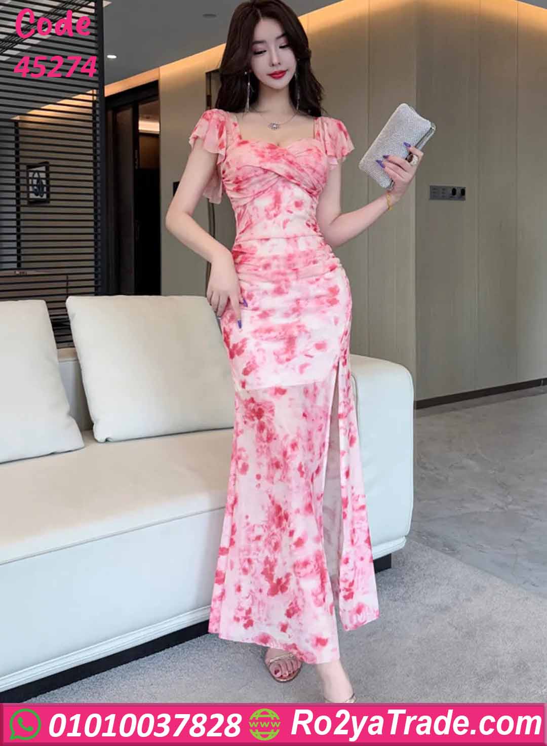 فستان صيفي طويل ورد بفتحة جانبية – كود 45274