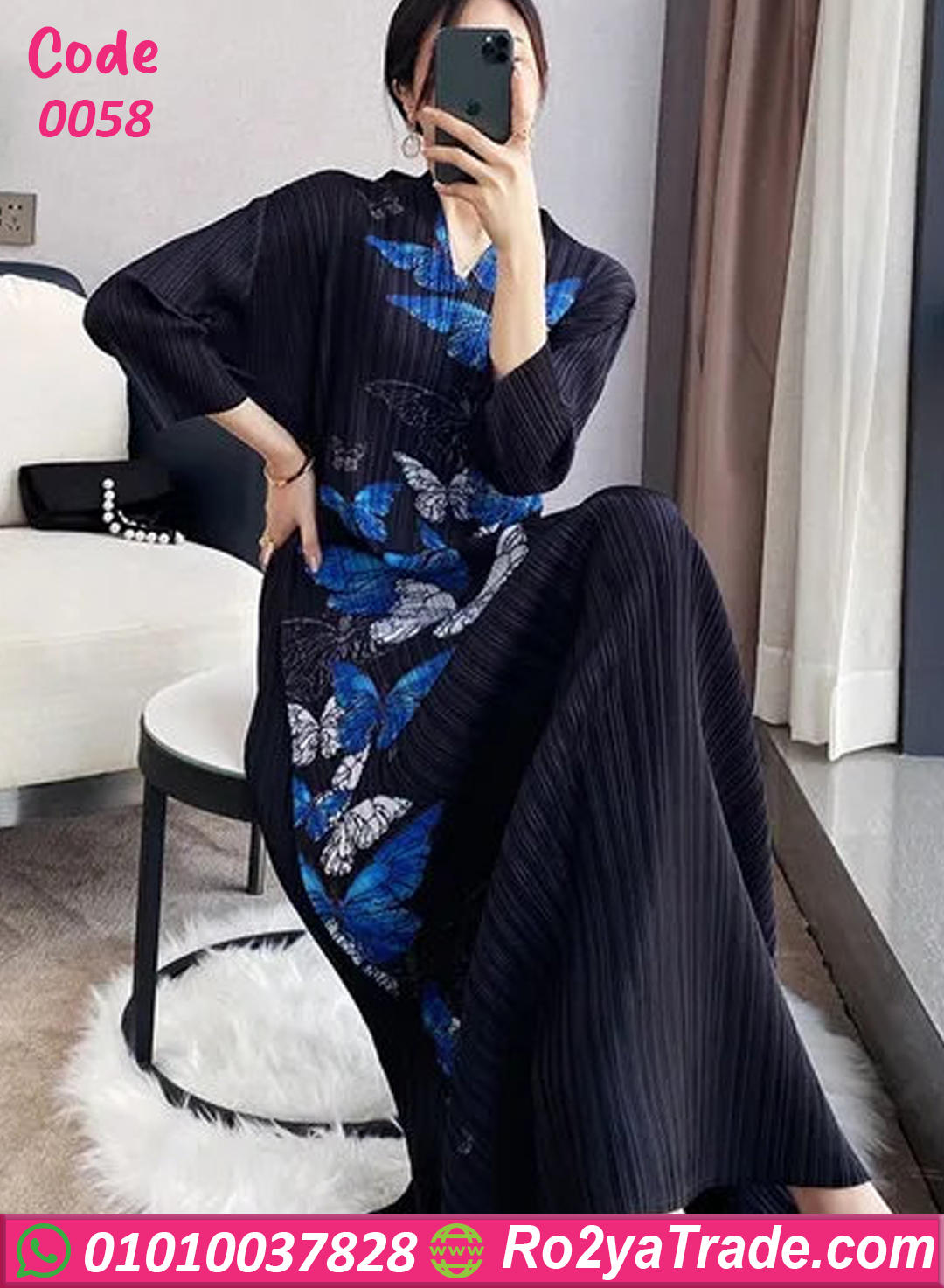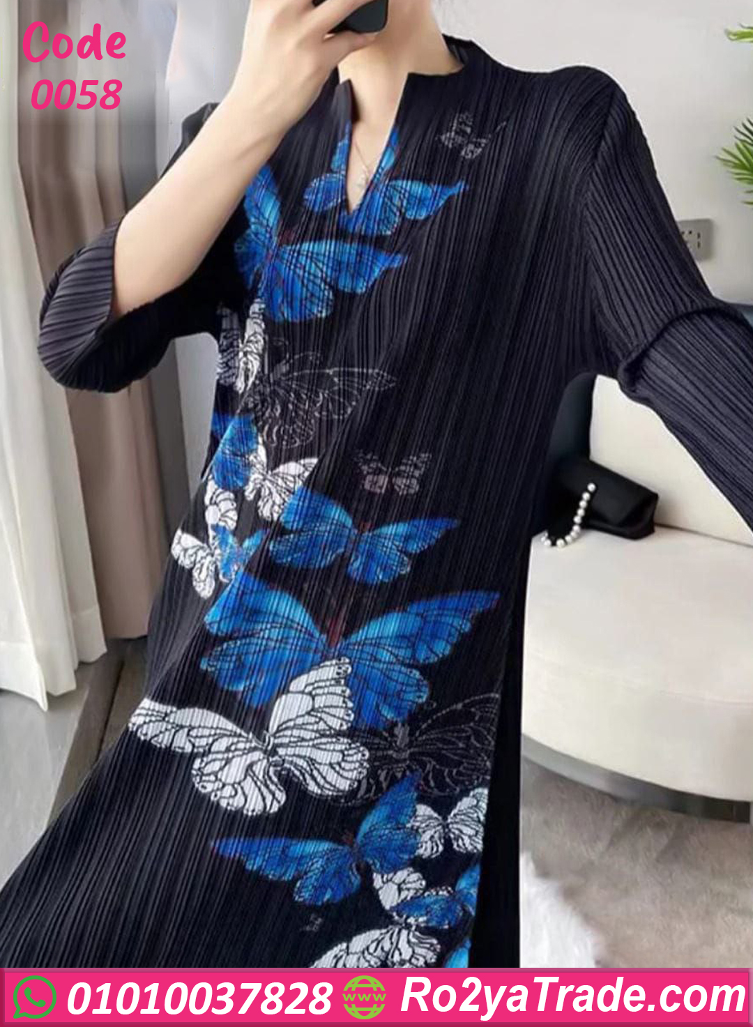 الطباعة المميزة بالفراشات الزرقاء بتدي لمسة من الحيوية والرُقي، والفستان مناسب للخروجات اليومية أو للمشاوير الخفيفة، وكمان تحفة كدريس عملي للبيت ✨
