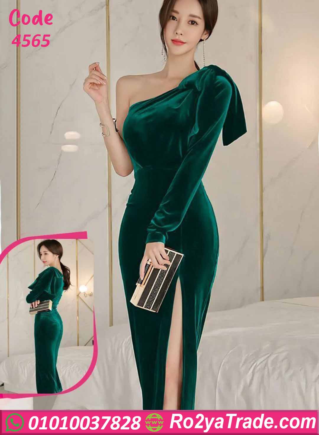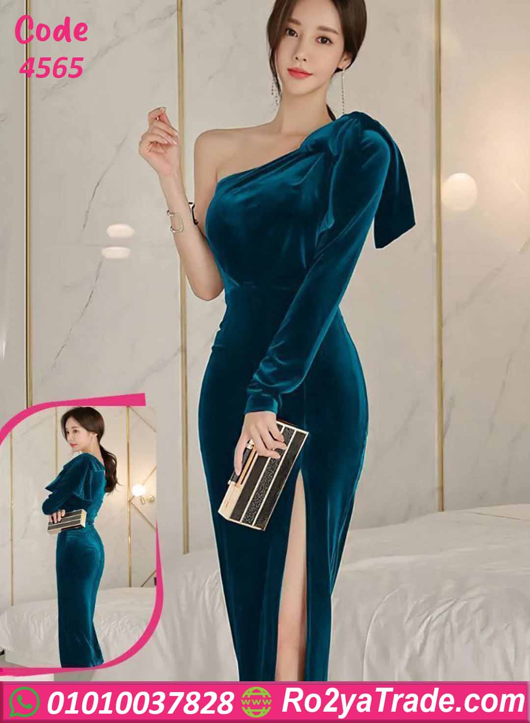 فستان شتوي طويل قطيفة بتصميم كتف واحد أنثوي وفتحة جانبية جذابة يبرز القوام بإطلالة فخمة وراقية.