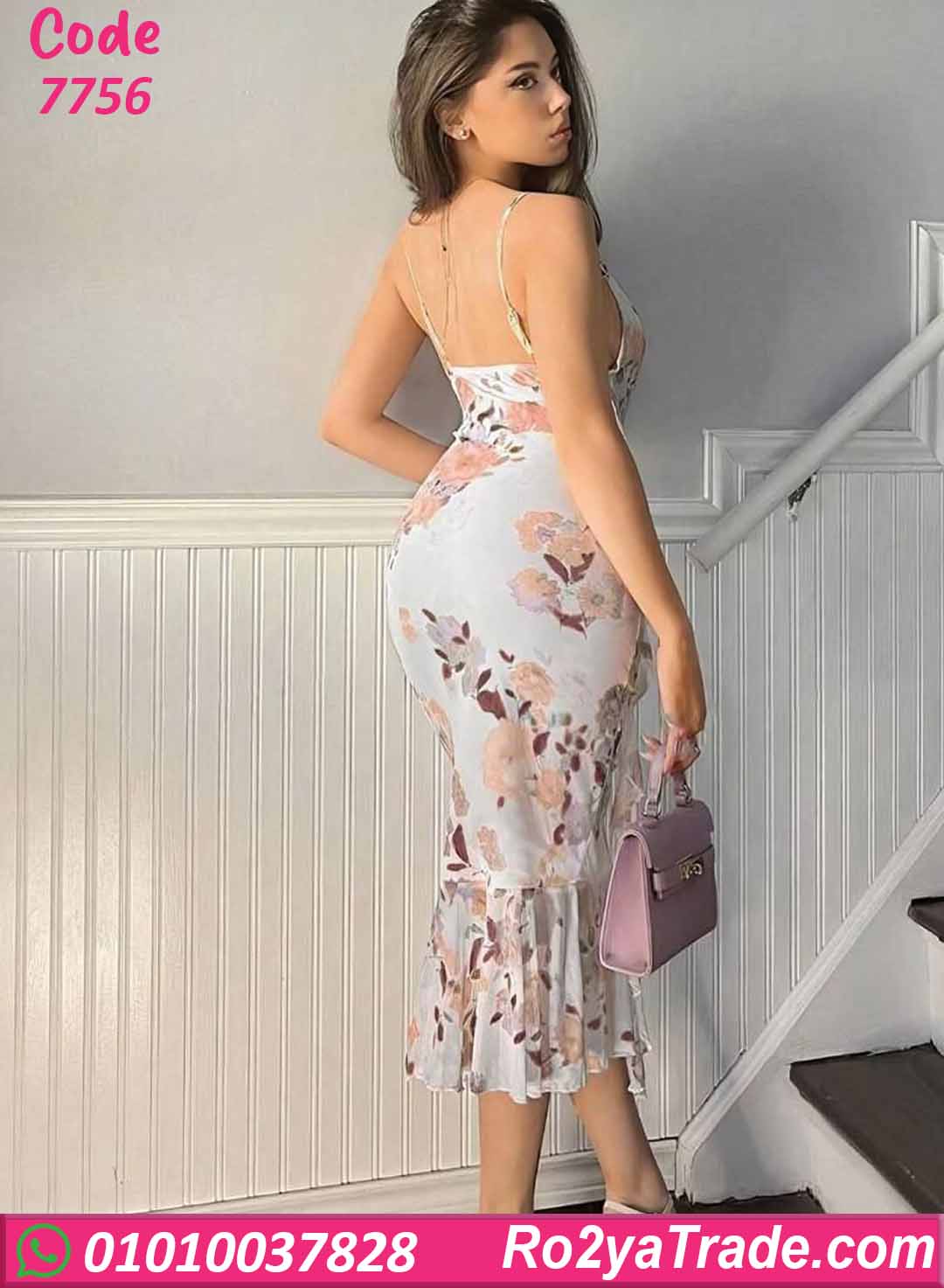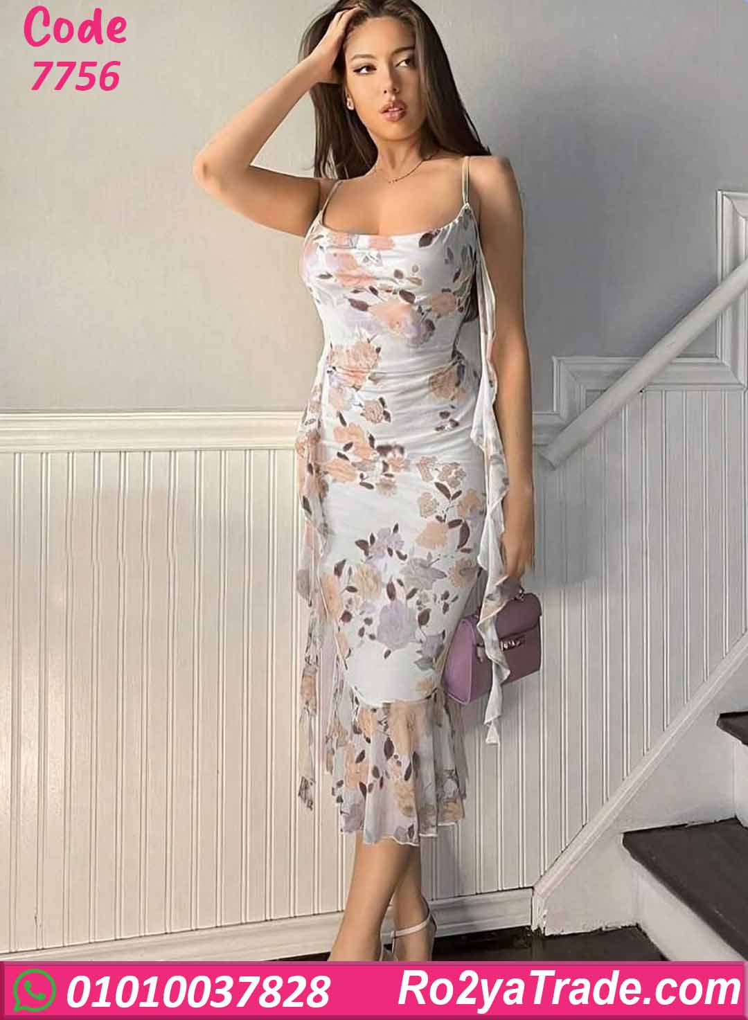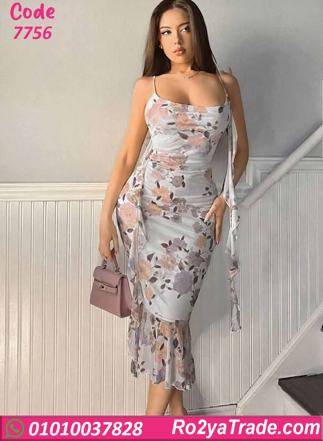 فستان صيفي طويل بنقشة ورد هادئة على أرضية فاتحة بتدي إحساس بالرقة والأنوثة، تصميم بحمالات رفيعة وقصة ضيقة على الجسم مع ذيل