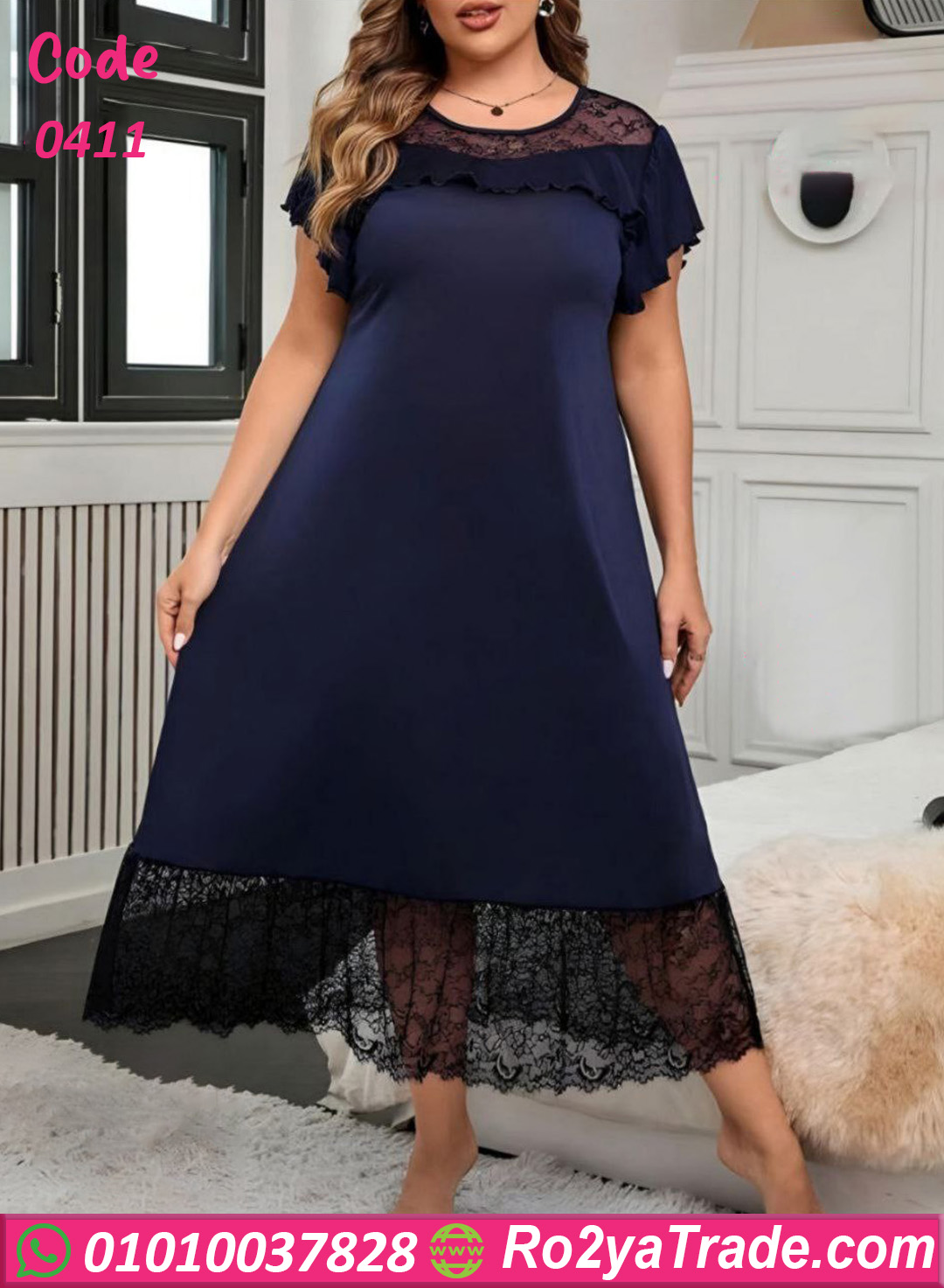 اللون الكحلي الكلاسيك مدي إحساس هادي وراقي، ومعاه دانتيل أسود شفاف عند الصدر ونهاية الدريس بيضيف لمسة أنوثة من غير مبالغة.
