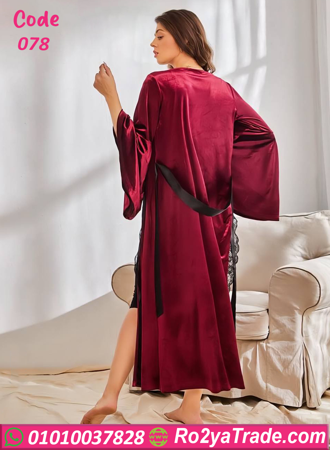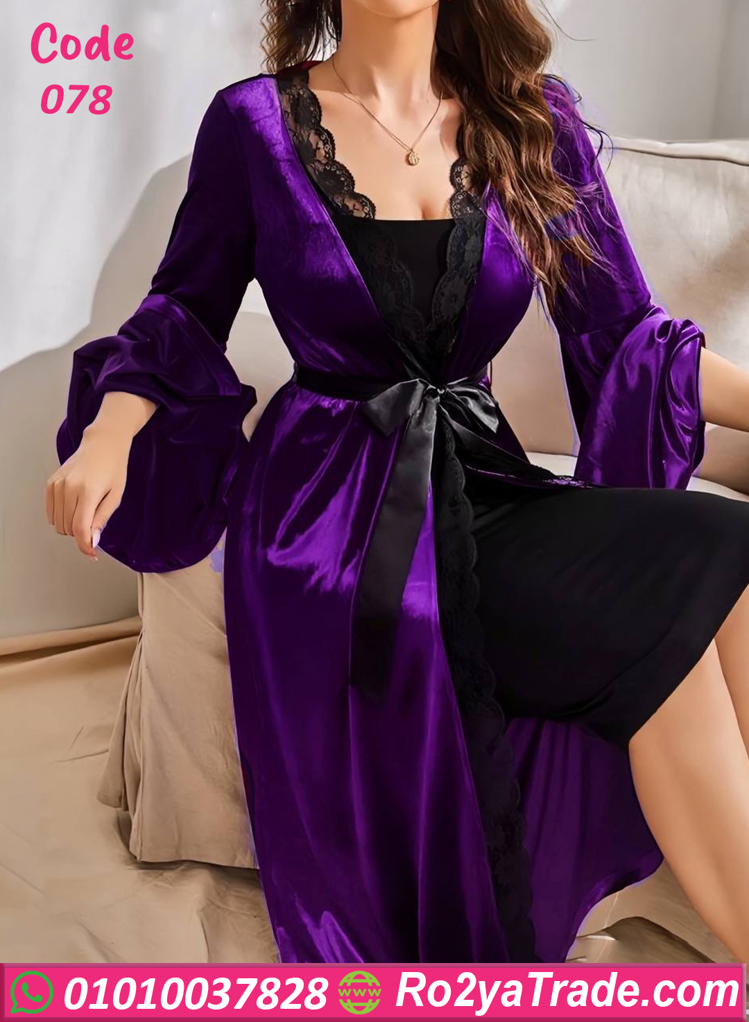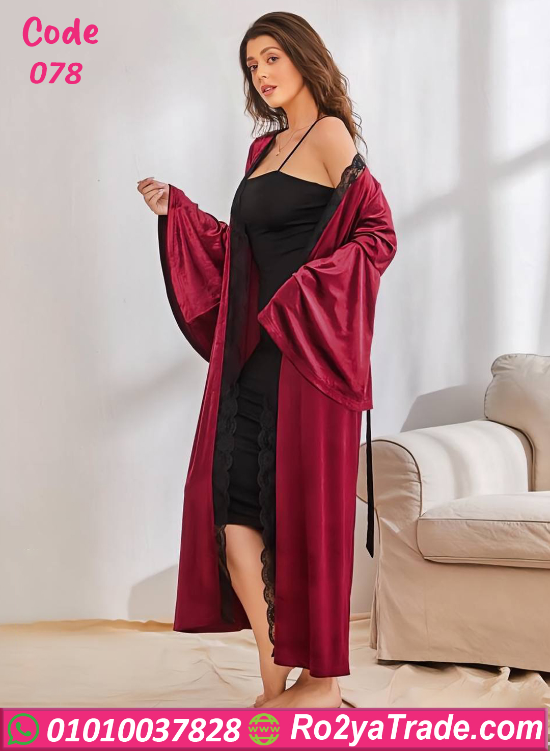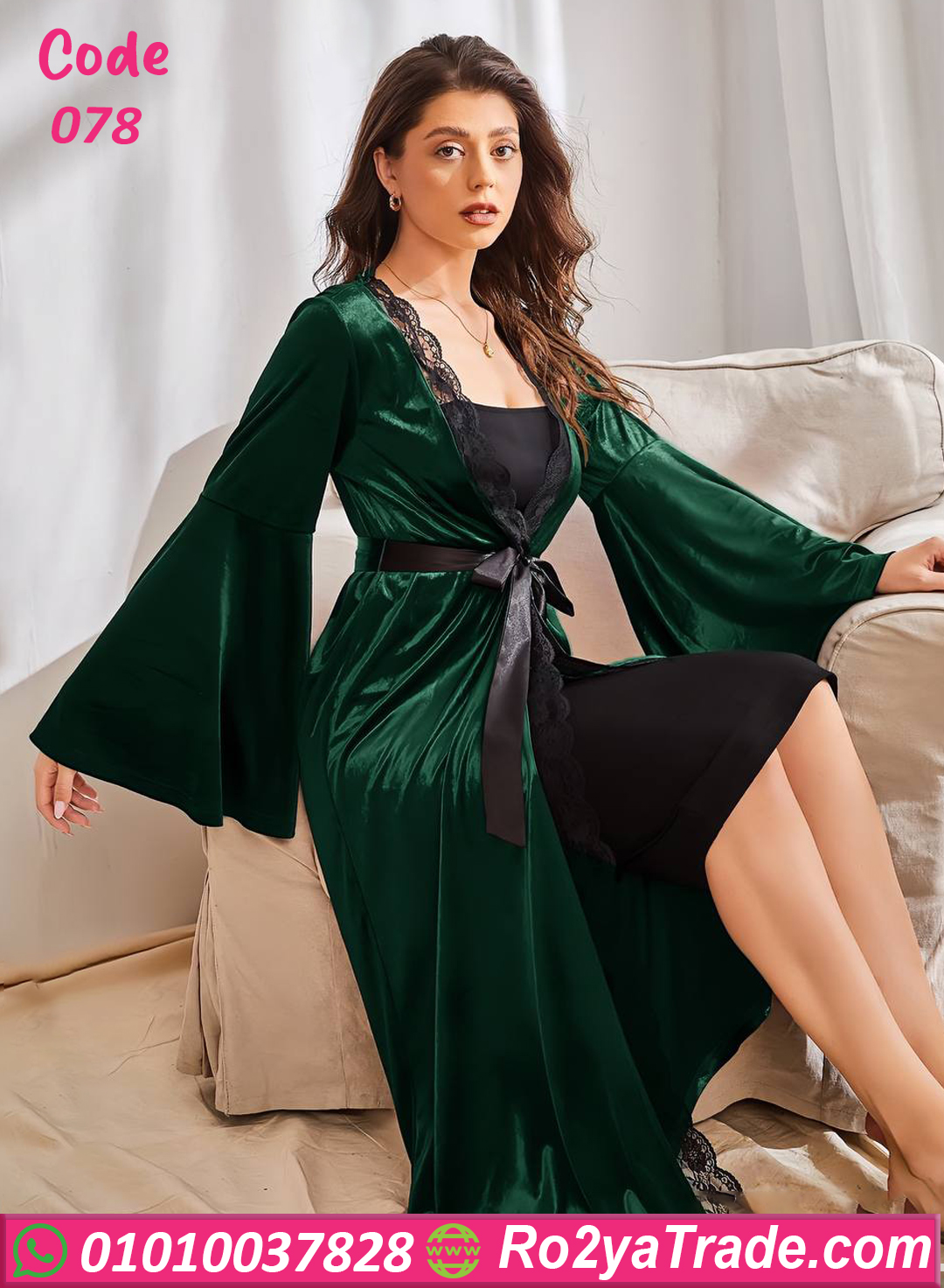كاش مايوه بروب قطيفة شتوي ناعم – 078 يعتبر من أكتر الموديلات اللي بتدي إحساس بالفخامة والدفا في نفس الوقت خامته قطيفة لامعة ناعمة على الجسم، مع دانتيل على القَصّة الأمامية يزود اللوك أنوثة وشياكة. الأكمام الواسعة المودرن بتدي شكل مميز جدًا، والرباط القماش الشيك على الوسط بيظبط القوام ويدي إطلالة مرتّبة من غير مجهود. الموديل مناسب للبنات والمتجوزات، ومثالي للبيت، اللبس اليومي، أو كاش مايوه شتوي فخم. سهل اللبس، خفيف، ومريح جدًا. كود 078 فعلاً قطعة تستاهل ضمن دولاب أي ست بتحب الشياكة والراحة في نفس الوقت.