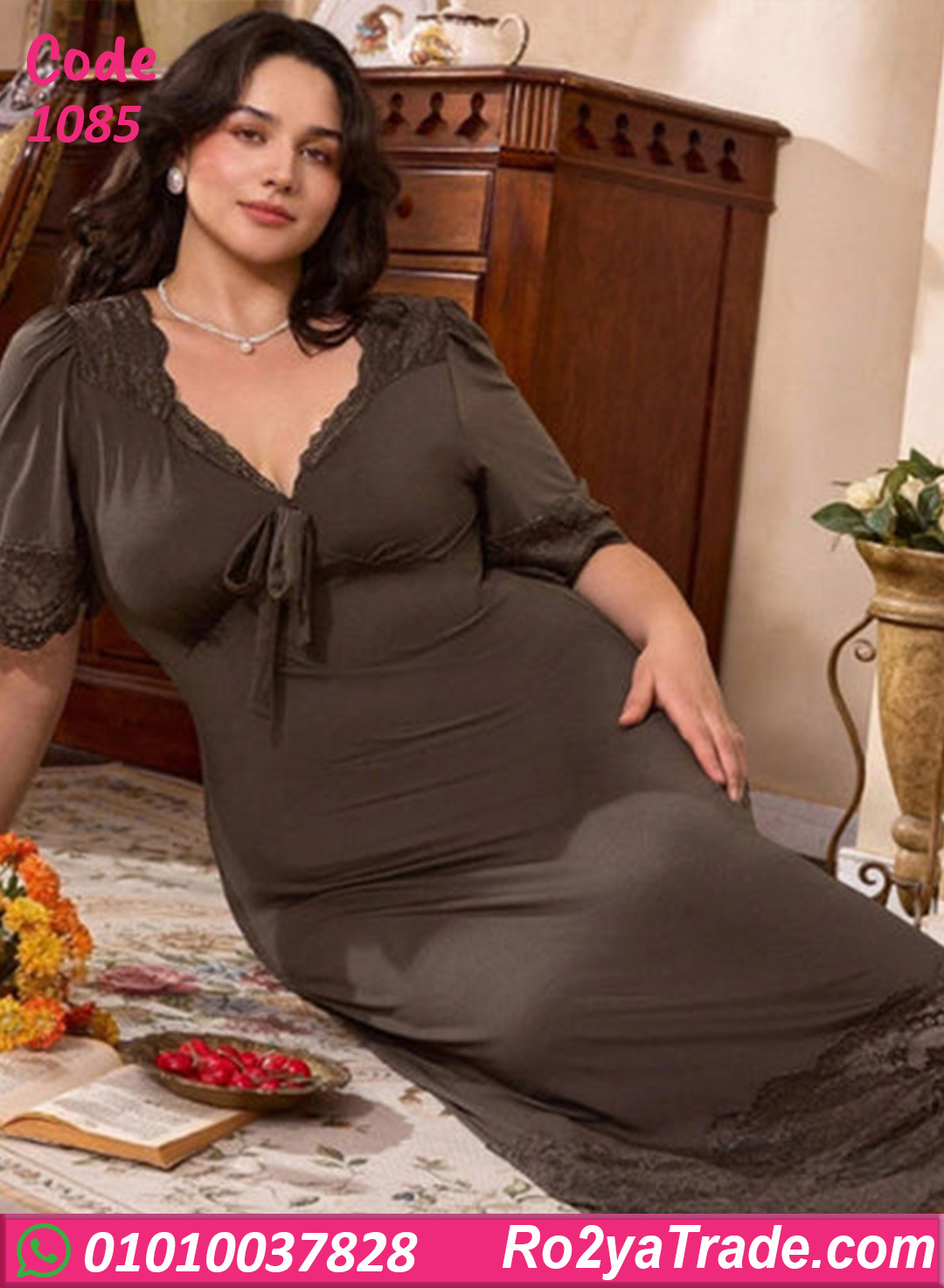 مع لمسة دانتيل فخمة على الصدر والأكمام والذيل بتدي شكل راقي ومثير في نفس الوقت. مناسب للبيت، الاسترخاء، أو ككاش شيك على المايوه في الرحلات.
