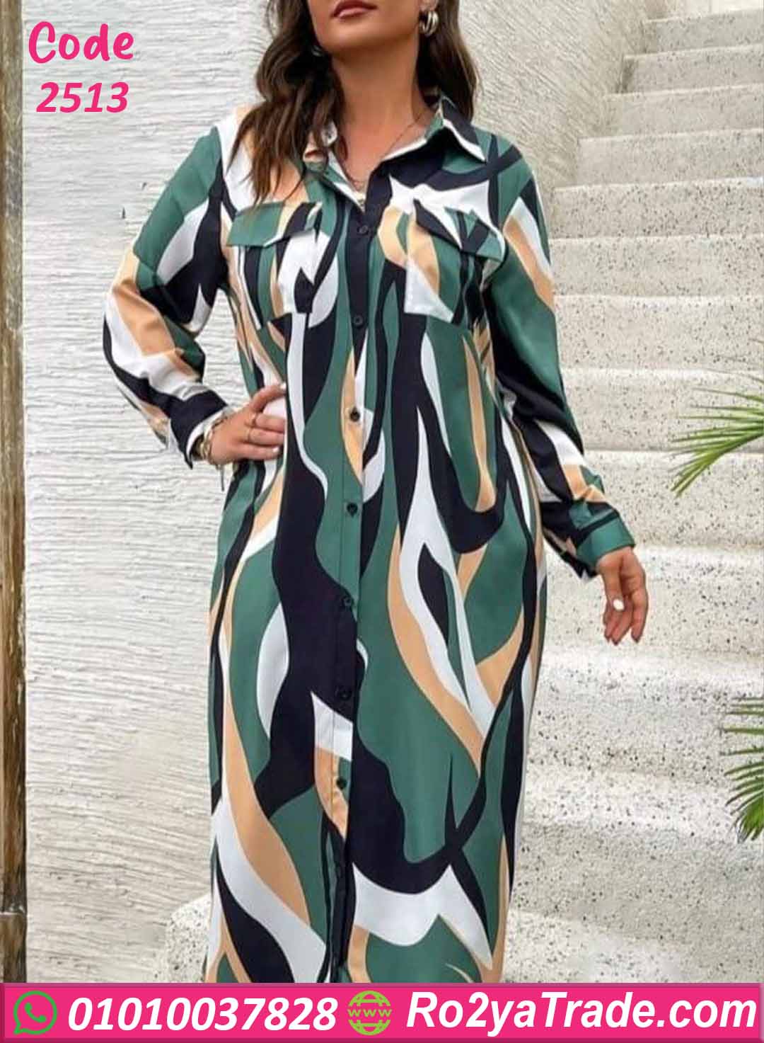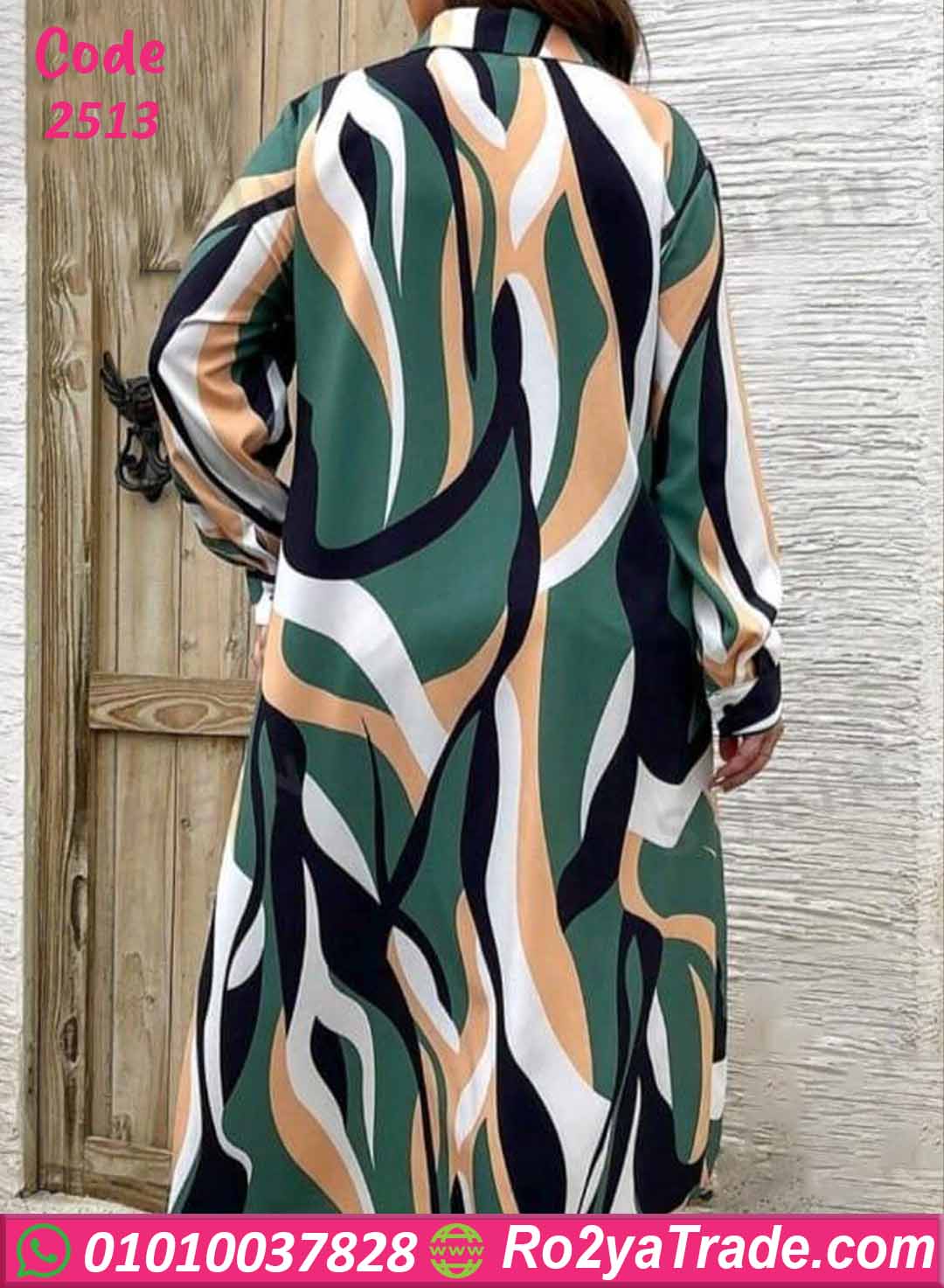 بكم طويل قابل للّف، وياقة كلاسيك شيك. النقشة مزيج بين الأخضر والبيج والأسود والأوف وايت بشكل عصري جدًا يليق على ألوان بشرة مختلفة.