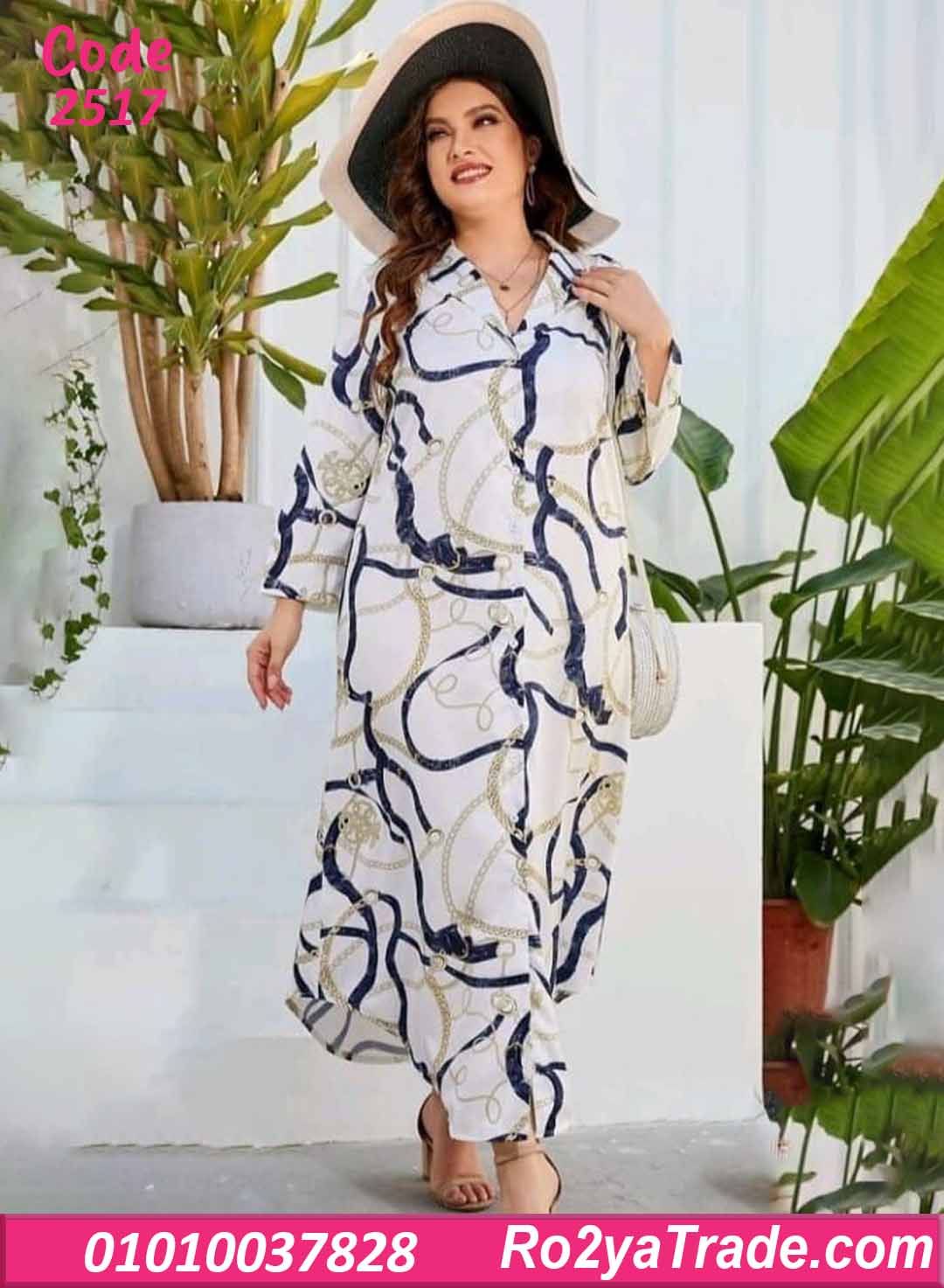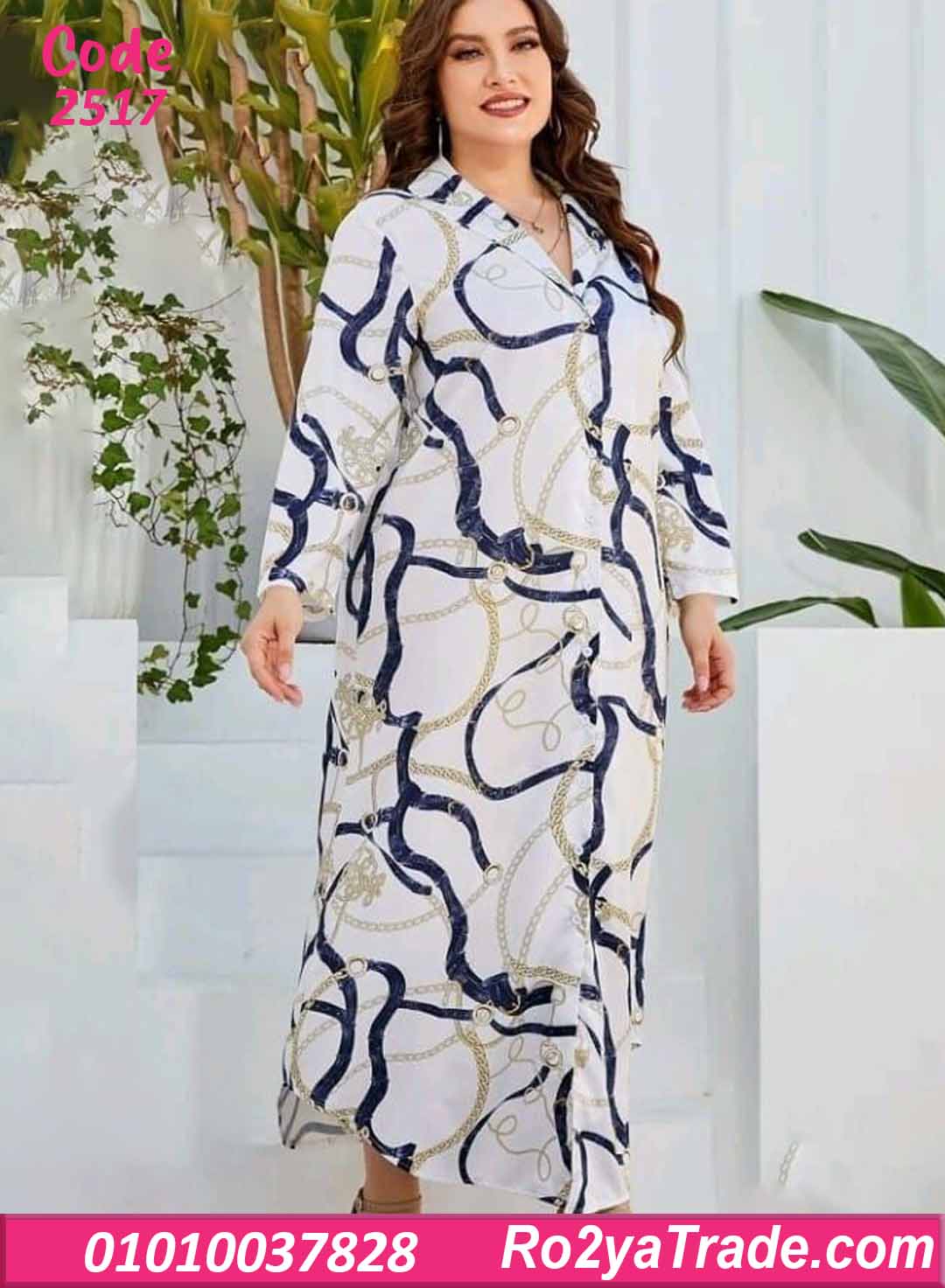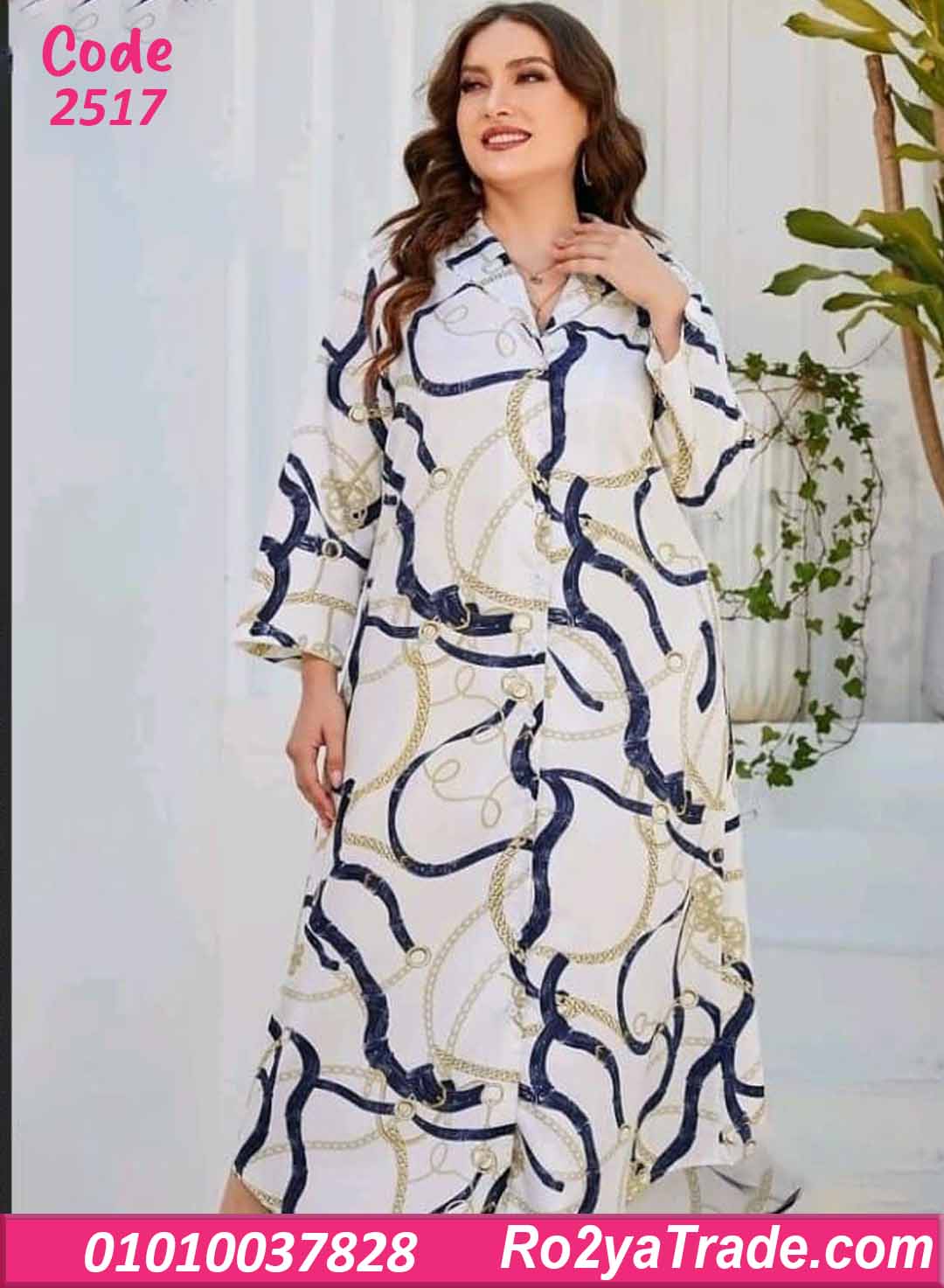 بكم طويل وياقة قميص شيك مع أزرار قدام. النقشة عبارة عن سلاسل بدرجات الكحلي والذهبي على أرضية أوف وايت، مدياله طابع فخم ومناسب جدًا للبحر والمصيف.