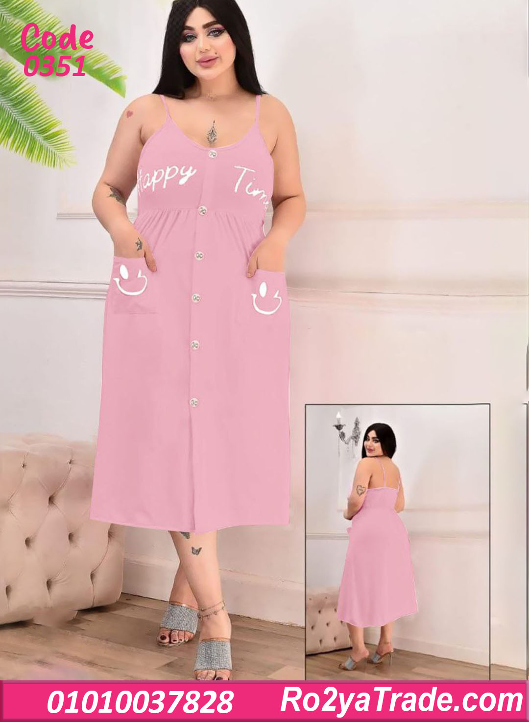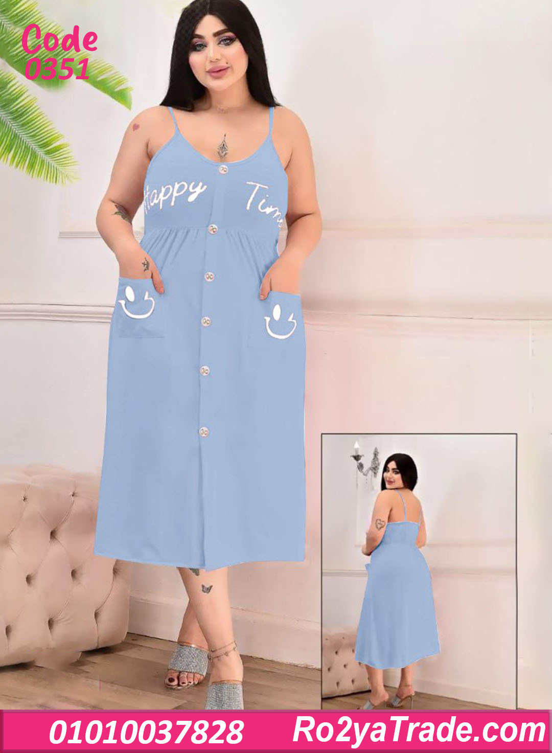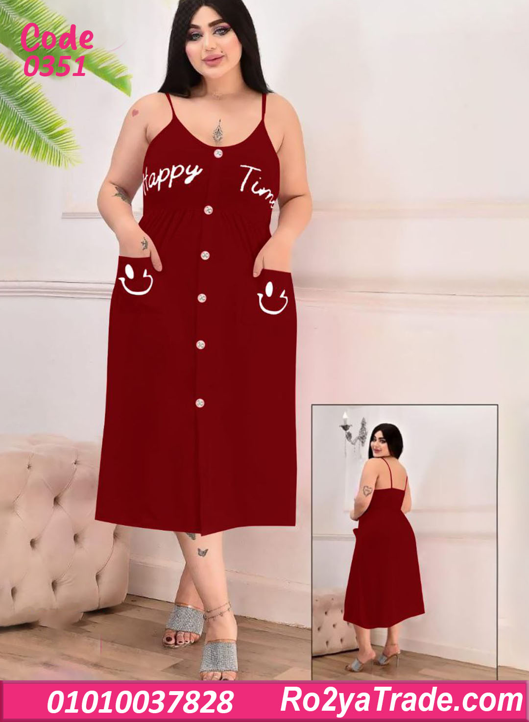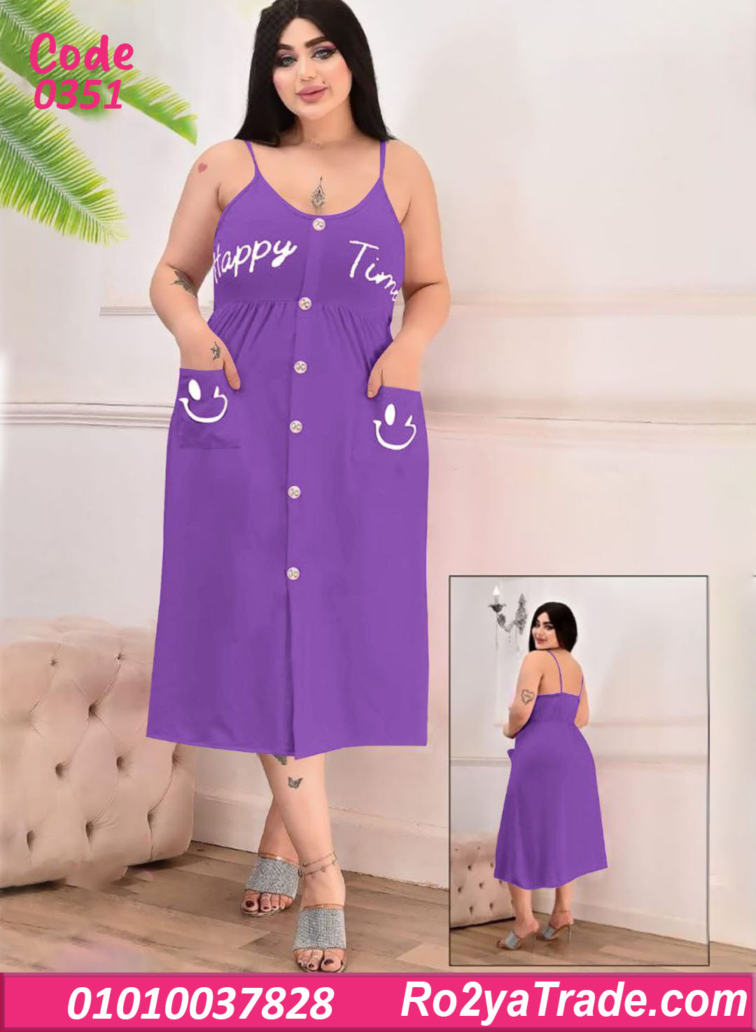 الموديل بحمالات رفيعة وقصة واسعة من تحت بتدي راحة في الحركة، مع أزرار أمامية بطول الفستان ولمسة كتابة Happy Time