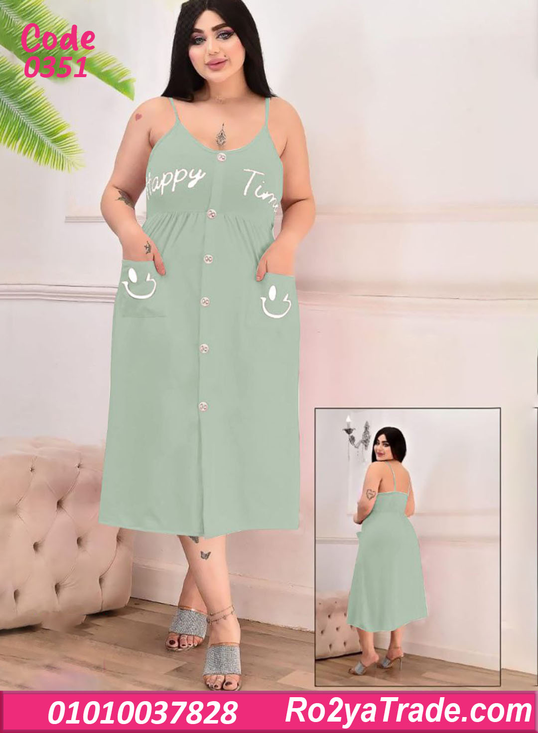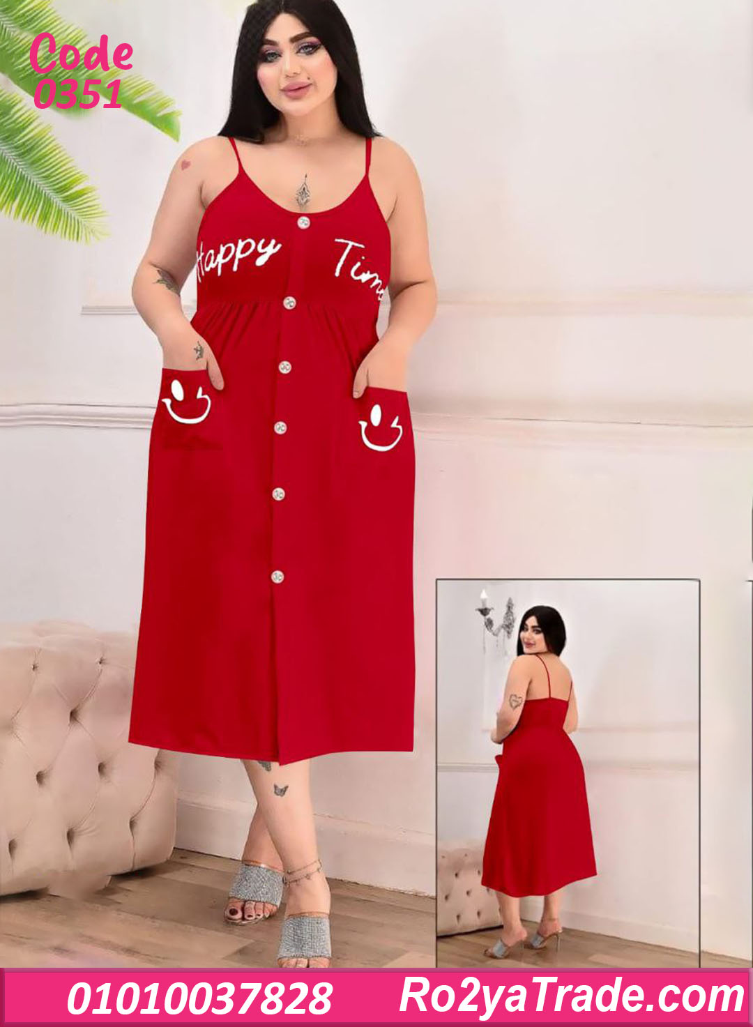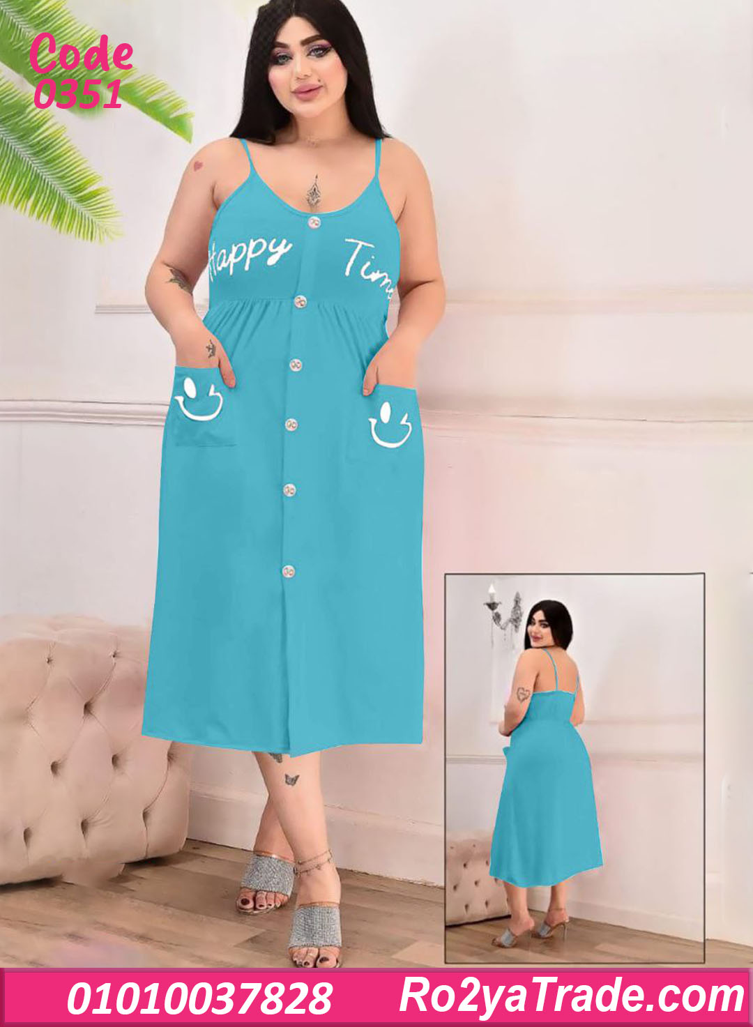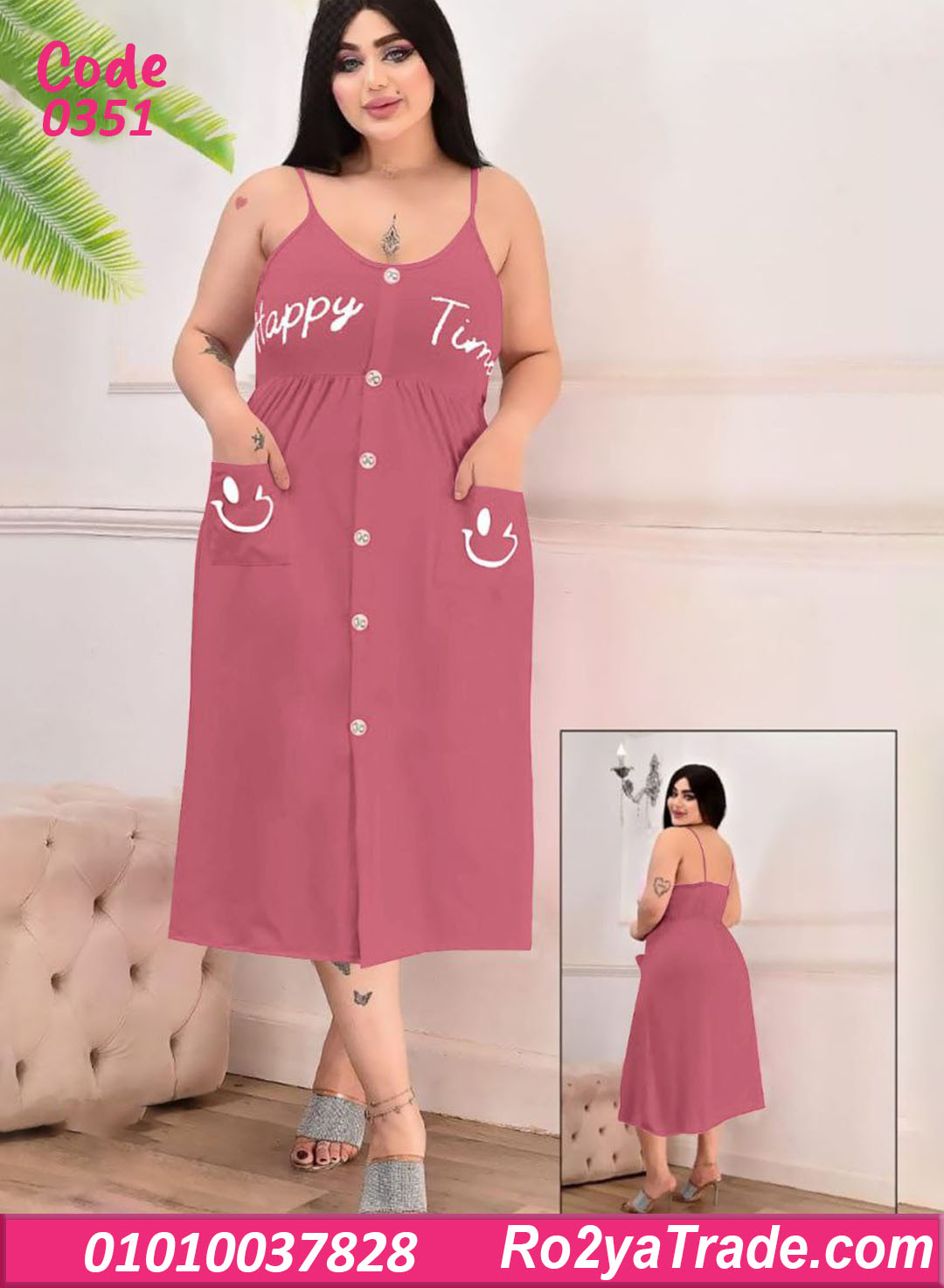 الموديل بحمالات رفيعة وقصة واسعة من تحت بتدي راحة في الحركة، مع أزرار أمامية بطول الفستان ولمسة كتابة Happy Time