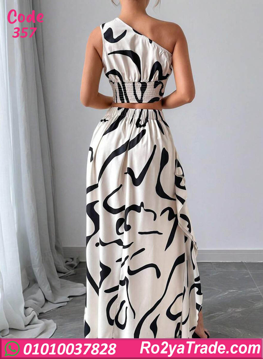 كاش مايوه بيتي صيفي بتصميم مودرن ونقشة أبيض × أسود جذابة، طقم مكوّن من توب كت واحدة وجيبة طويلة بفتحة جانبية شيك،
