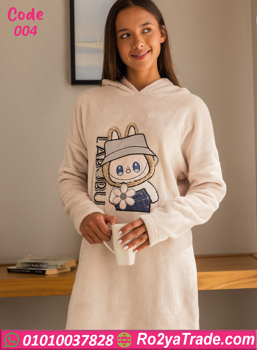 الخامة فرو ناعمة ودافية جدًا، والتصميم بسيط بكابيشو كيوت وتطريز مميز لشخصية كرتونية بيضيف لمسة دلع وأنوثة 😍
