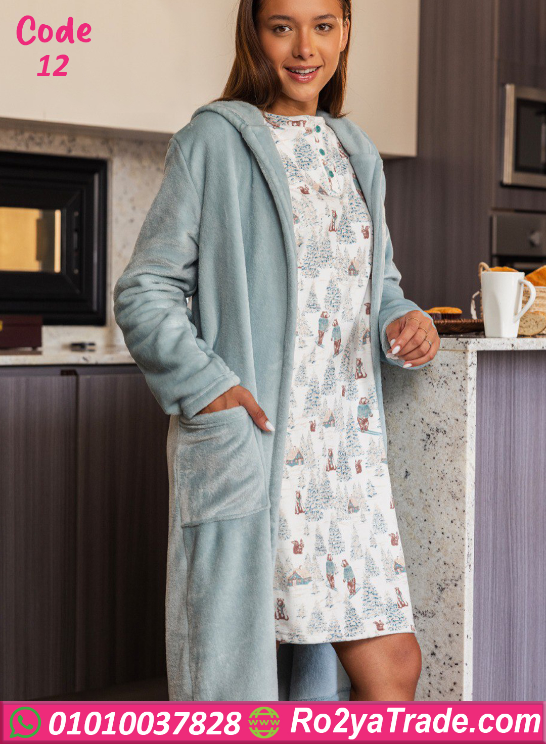كاش مايوه شتوي ناعم جدًا من ماركة ALMA، روب فرو خفيف مع فستان داخلي أنيق بنقشة شتوية مميزة ☃️
