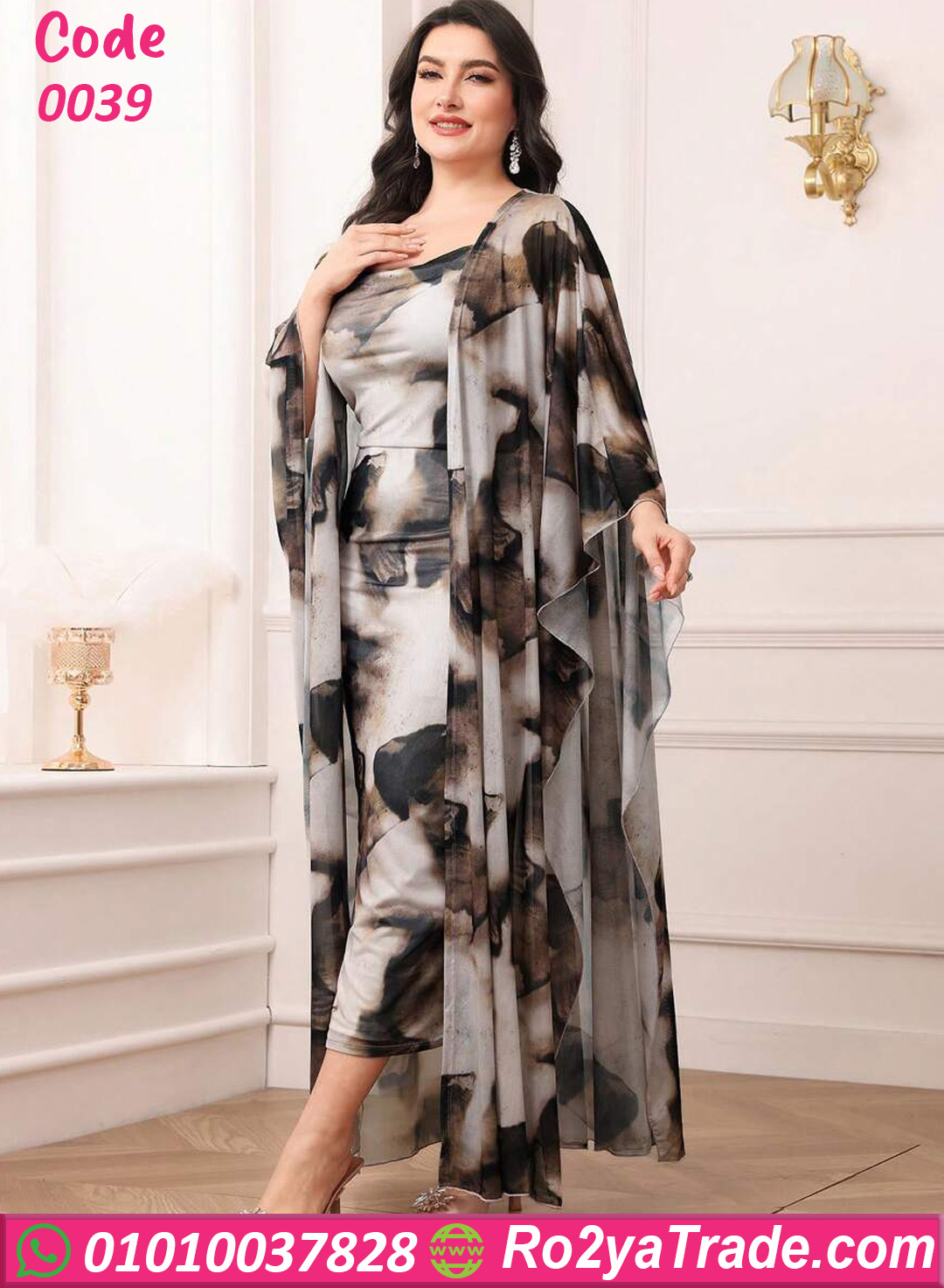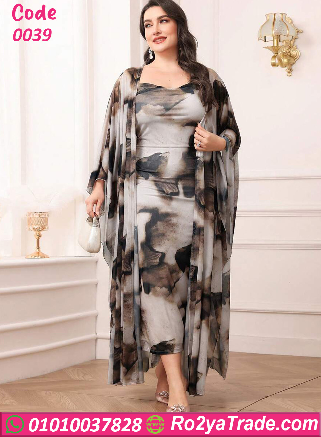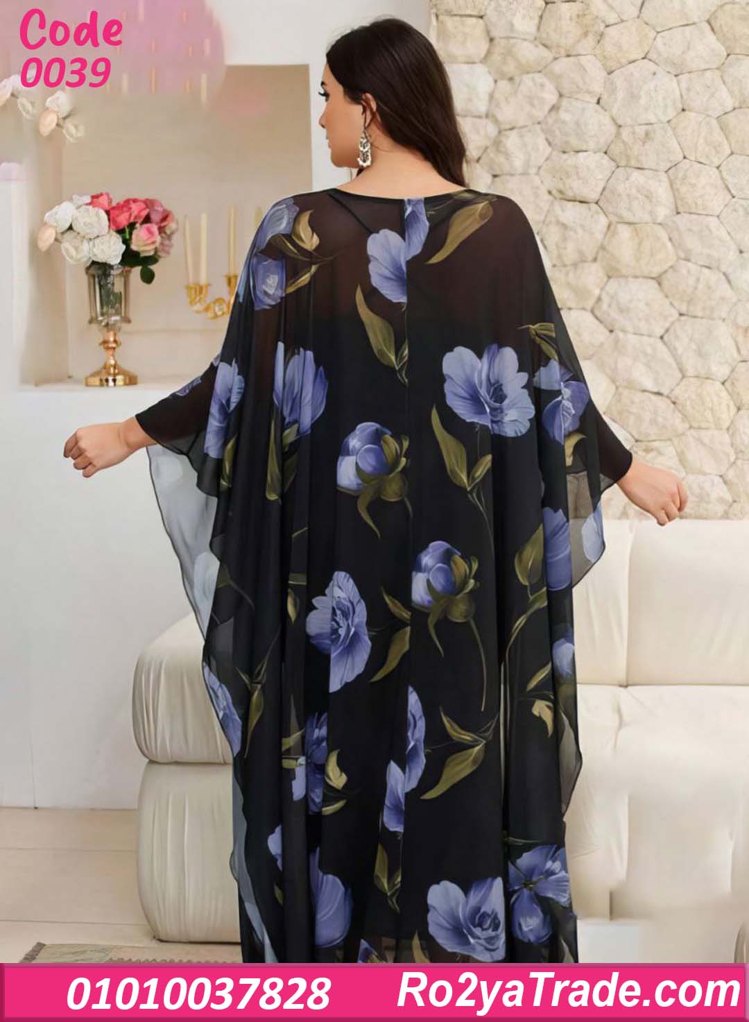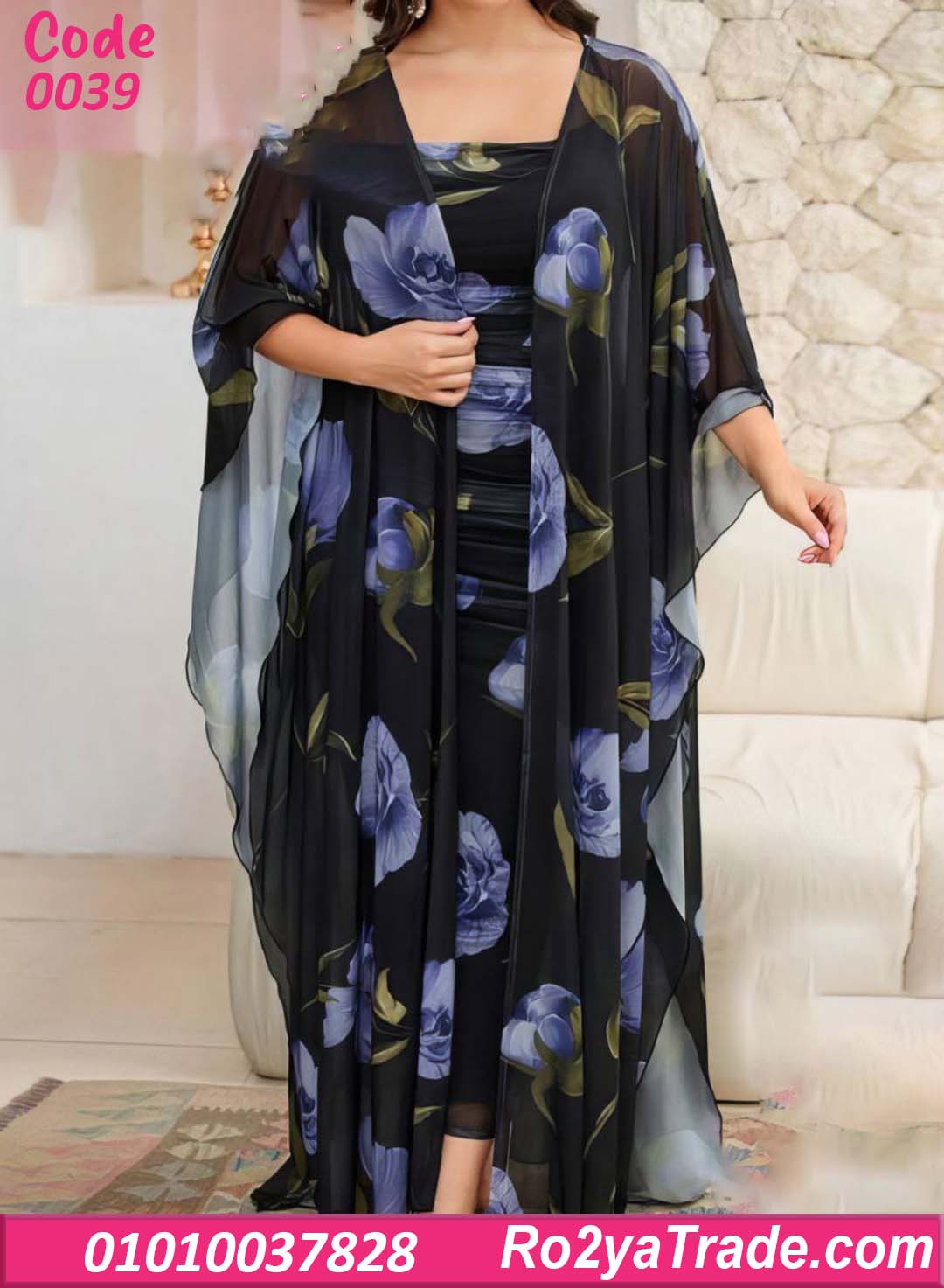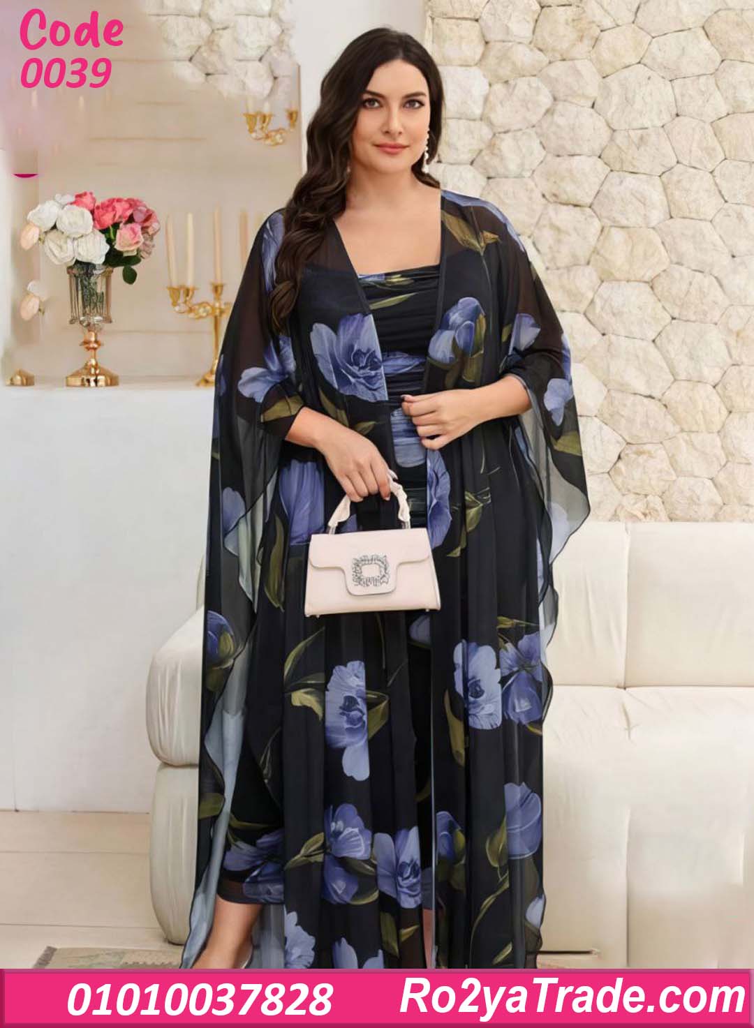 التصميم يأتي بطبقة داخلية مريحة مع طبقة خارجية من الشيفون الشفاف المزخرف بنقشة ورد كبيرة تعطي للموديل شكل راقي ومميز يناسب أجواء الصيف والمصيف.