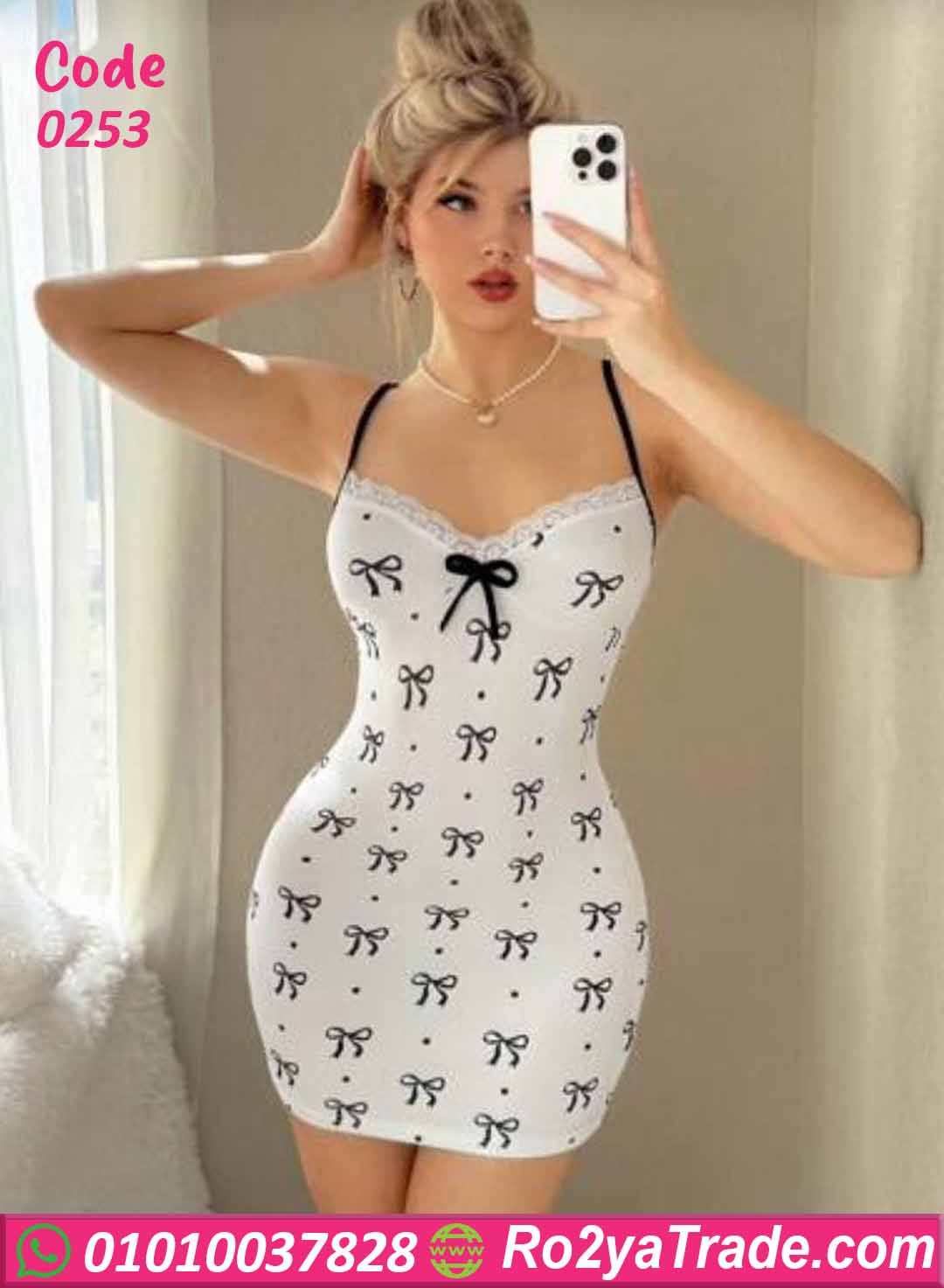 لانجري قصير باللون الأبيض مع طبعة فيونكات سوداء ناعمة وتصميم جذاب يبرز الأنوثة بأسلوب رقيق وعصري.