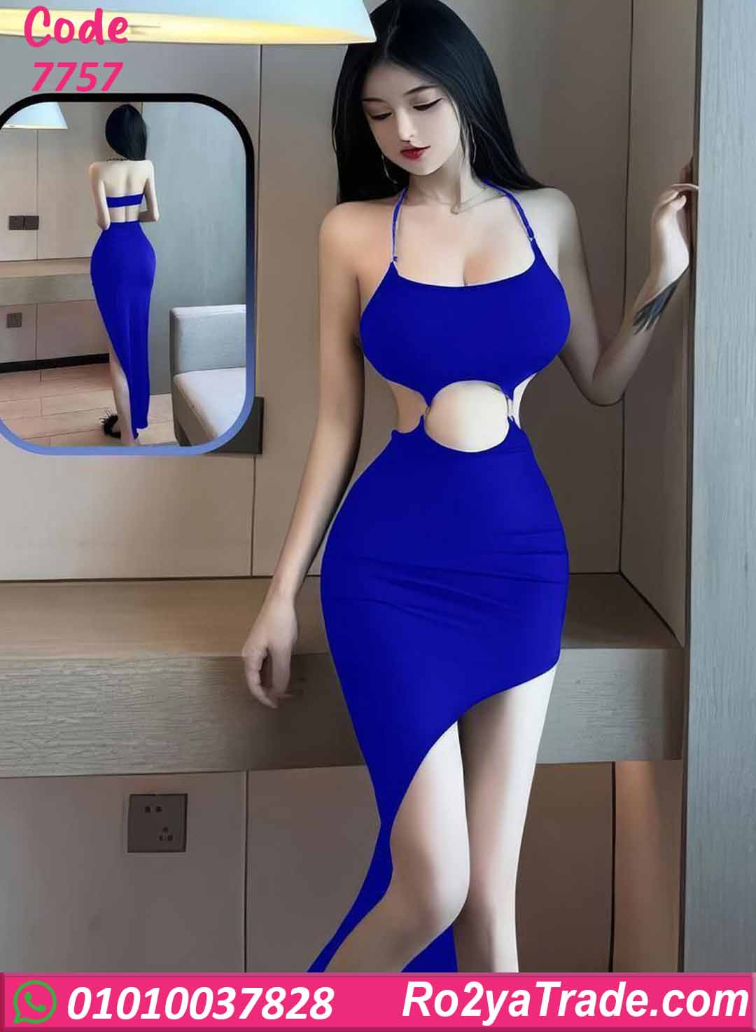 لانجري طويل بلون أزرق جذاب بتصميم مميز بفتحات جانبية دائرية عند الخصر وقصة ضيقة على الجسم مع ذيل غير متماثل يديكي إطلالة جريئة