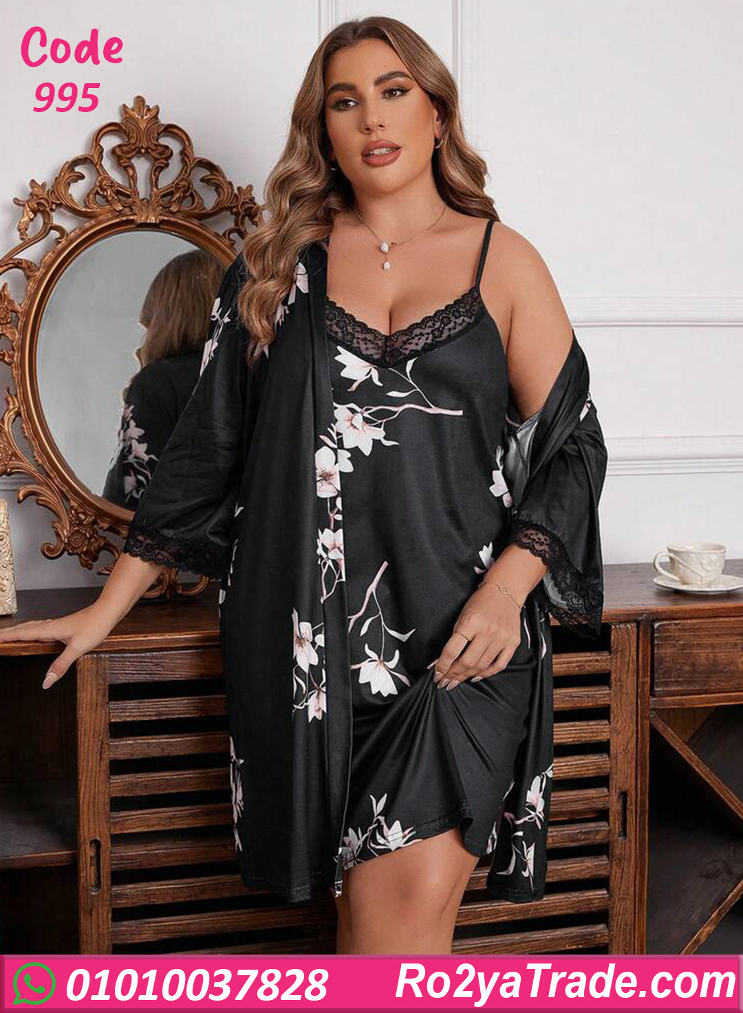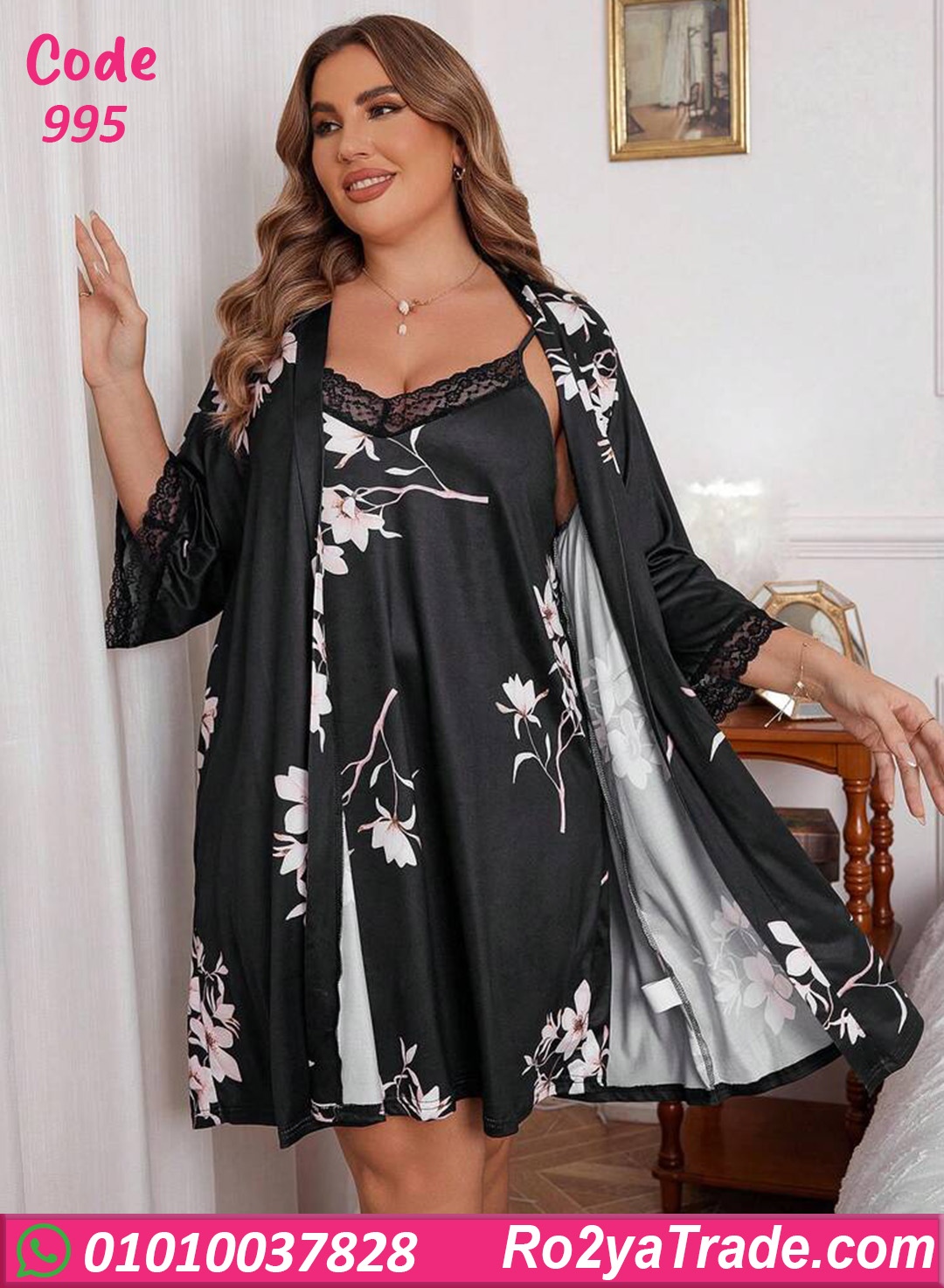 طقم لانجري شيك مكون من فستان قصير زبده مع روب دانتيل ورسمة ورد رقيقة، بيدي شكل أنثوي فخم وجذاب.