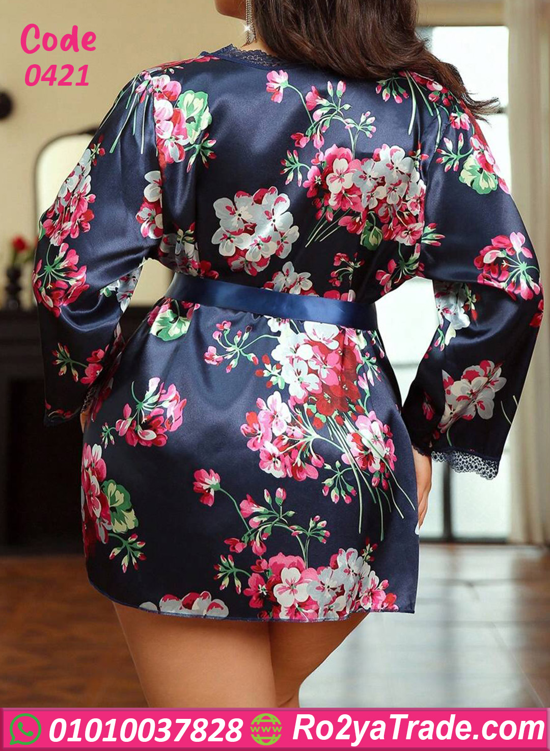 ✔️ روب ستان قصير بنقشة ورد شيك بدرجات الأحمر والأبيض على أرضية كحلي، بأكمام طويلة ولمسة دانتيل رفيعة على الأطراف، ومعاه حزام ستان بنفس اللون لتحديد الخصر وإبراز الشكل.