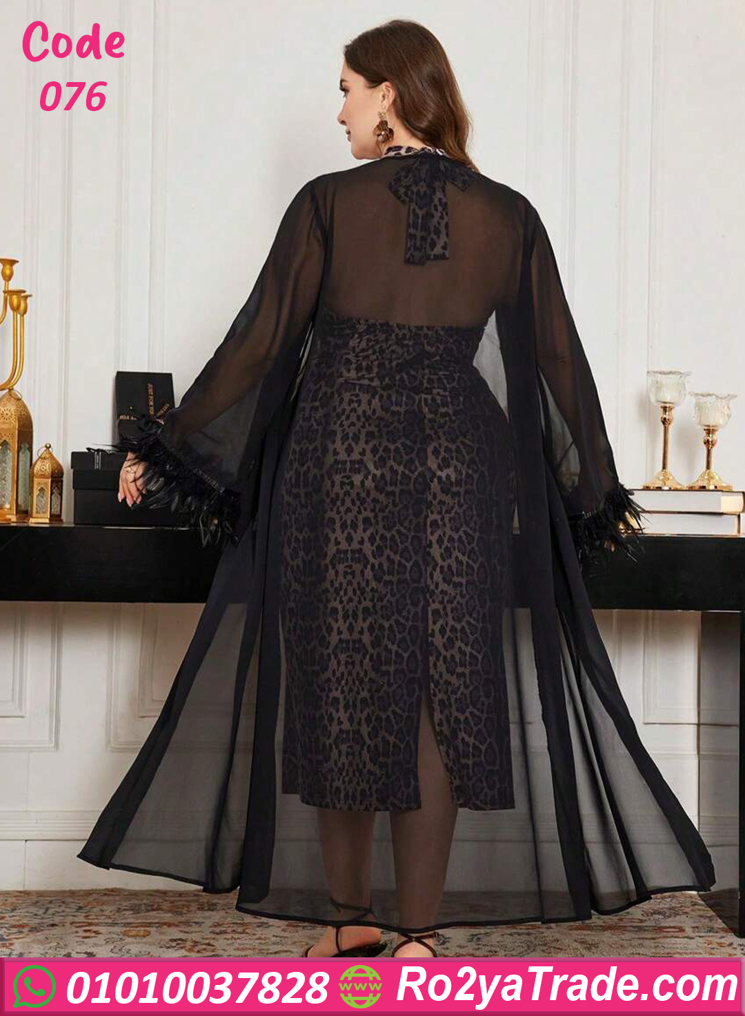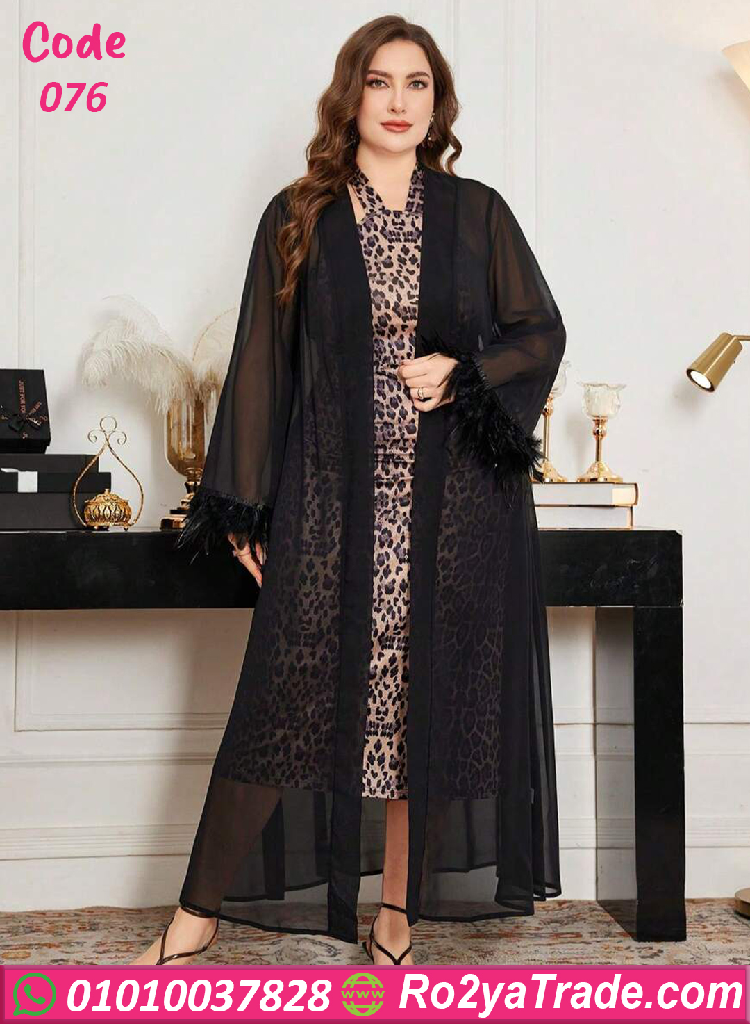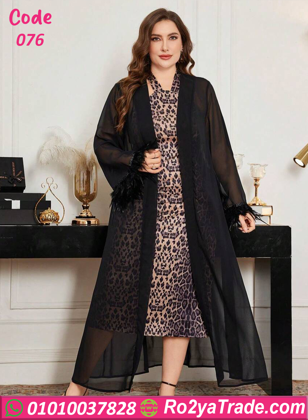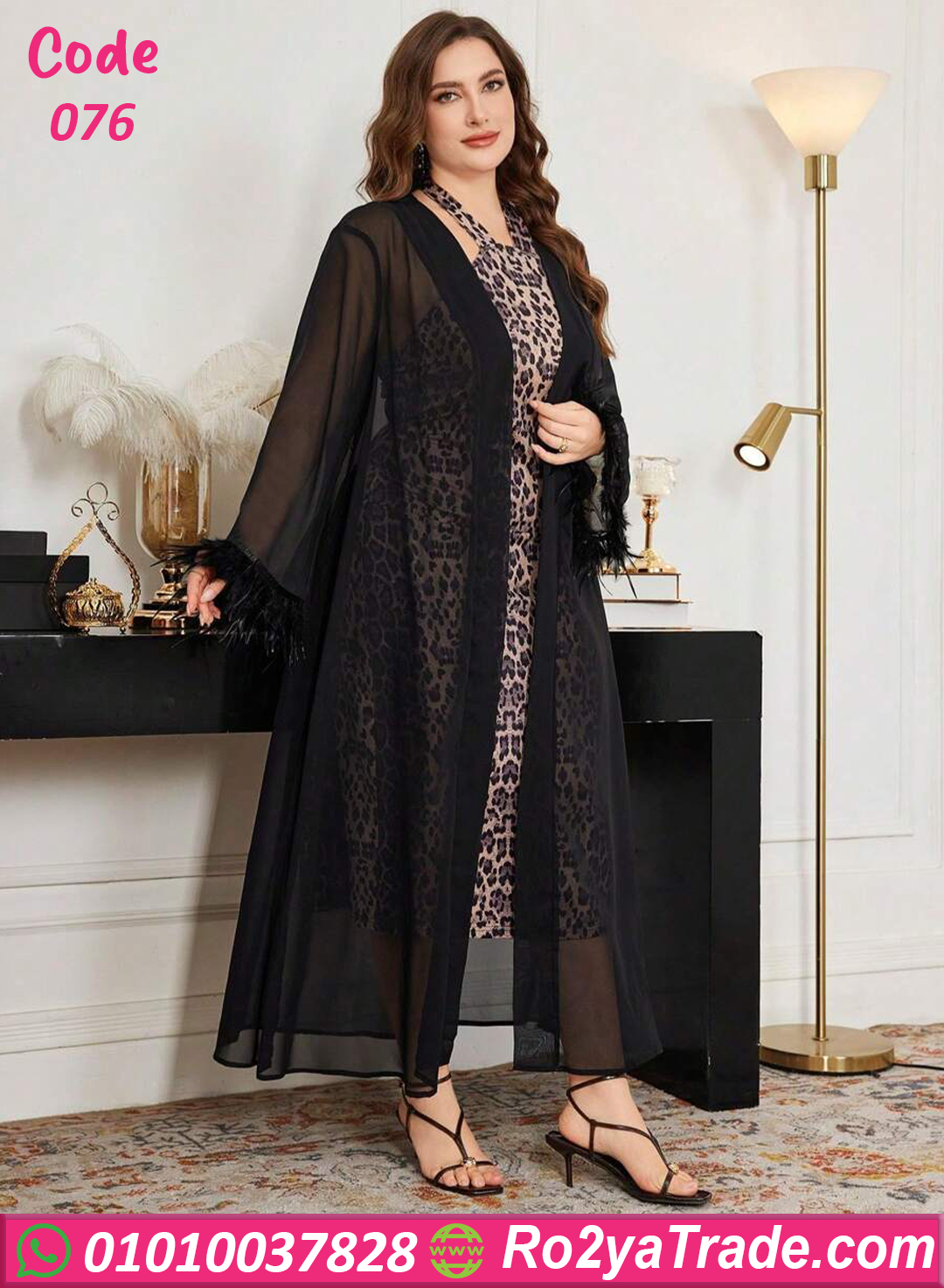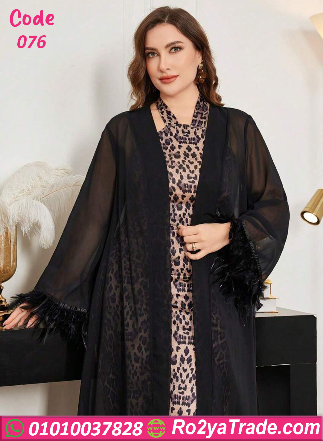 خامة ليكرا ناعمة بطبعة ليوبارد مع شيفون شفاف وريش ناعم على الأكمام بيكمل الإطلالة بدلع وأنوثة ✨