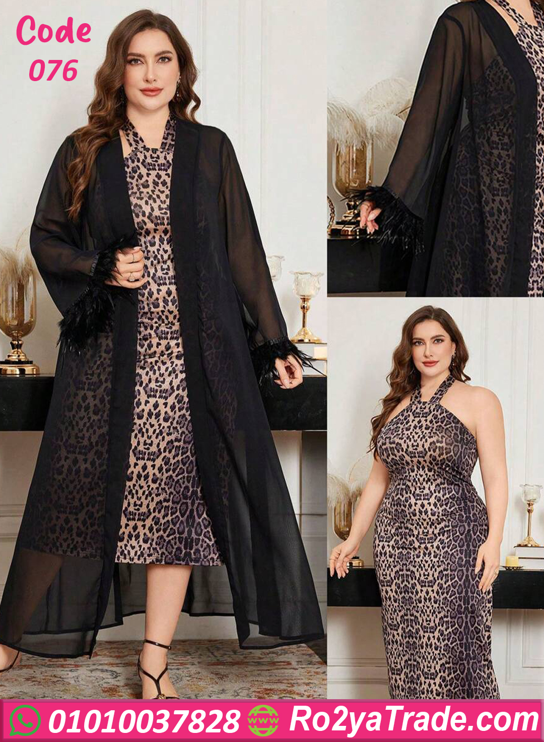 الفستان بخامة ليكرا ناعمة بطبعة ليوبارد يبرز شكل الجسم بأنوثة راقية، ومعاه روب شيفون خفيف شفاف بلمسة فخامة وريش ناعم على الأكمام بيكمل الدلع والجاذبية 💗